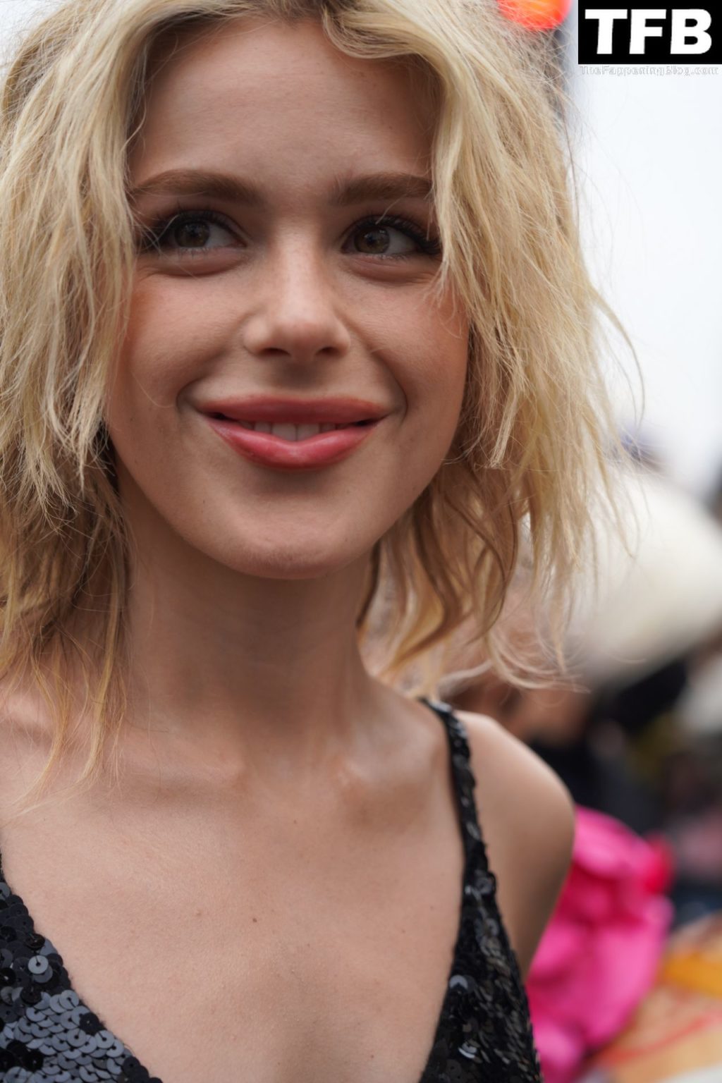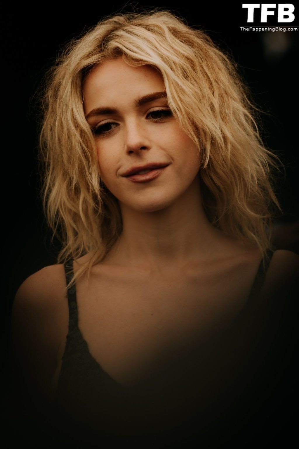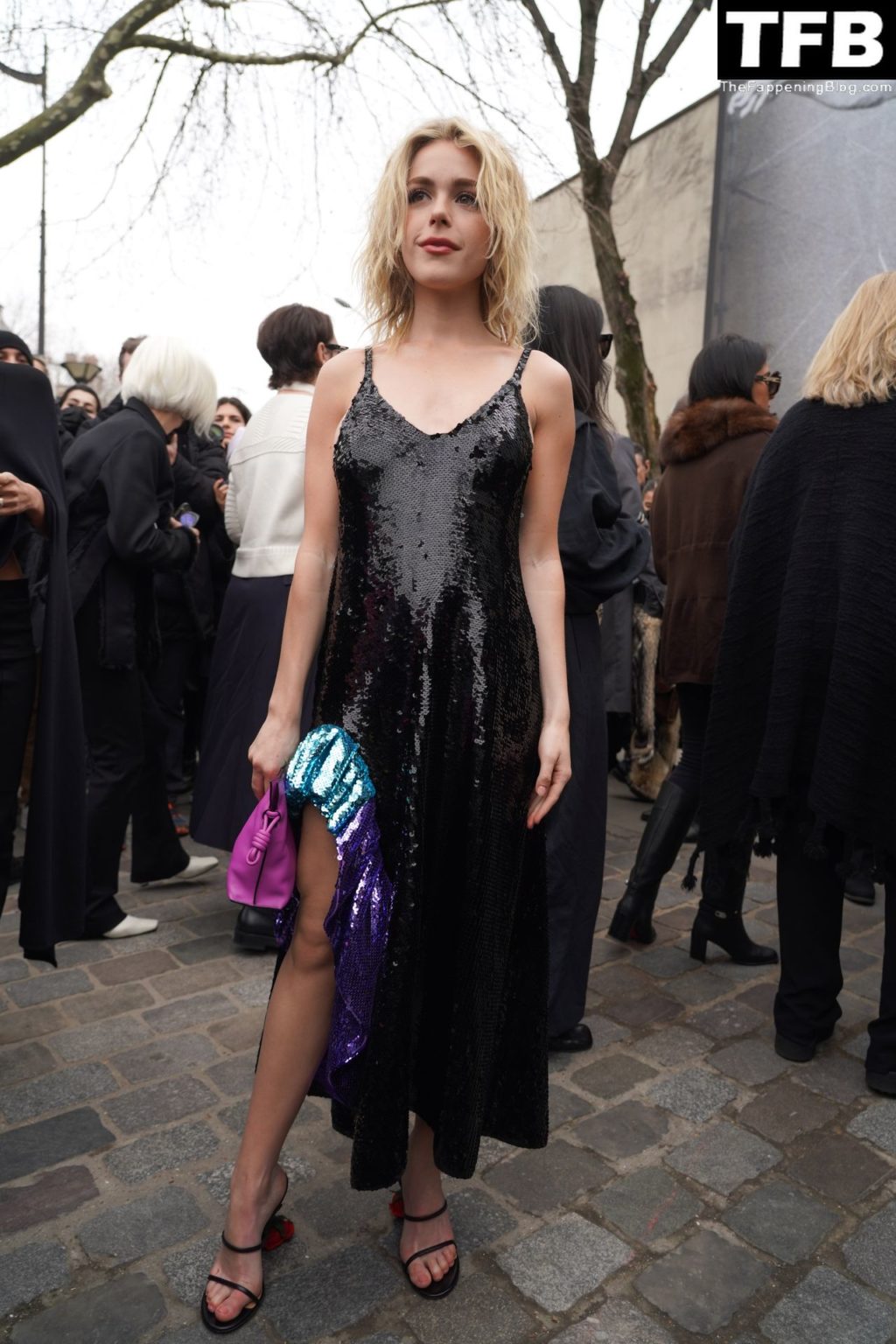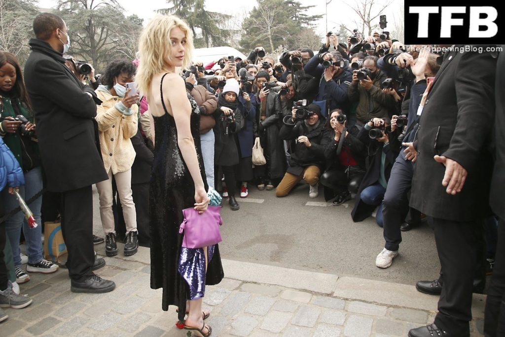 A atriz americana Kiernan Shipka está deslumbrante ao chegar ao desfile de Outono/Inverno 2022/2023 da Loewe durante a Semana de Moda de Paris no Tennis Club porte de Saint-Cloud em Paris, 03/04/2022.
