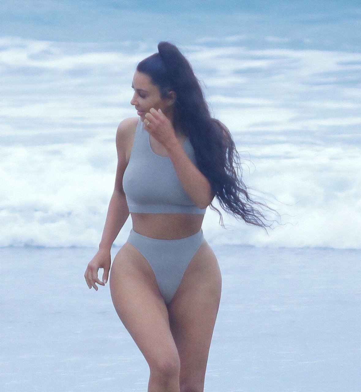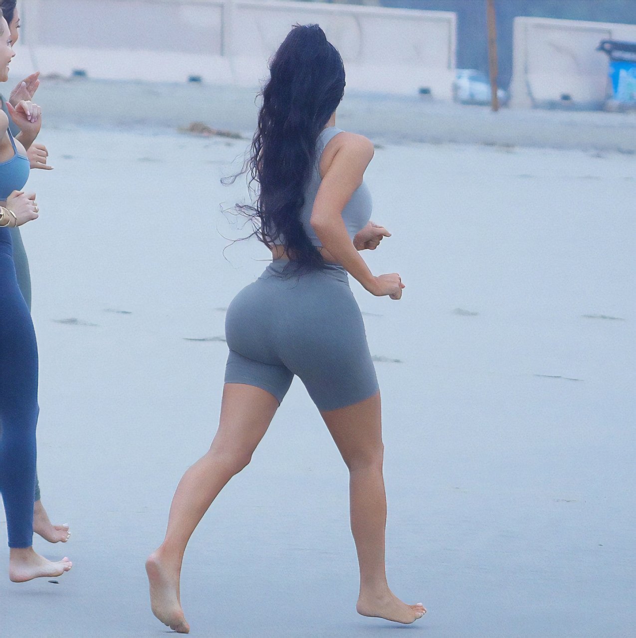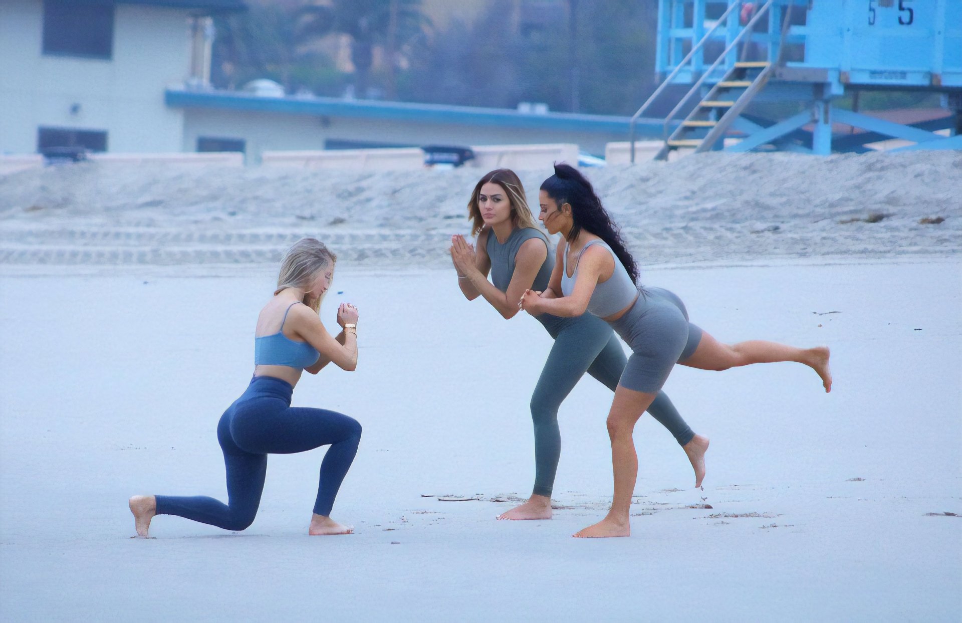 A estrela de reality show Kim Kardashian (37) exibe suas curvas fabulosas com top cropped e calcinha durante uma sessão de yoga com outras beldades na praia em Los Angeles, 11/07/2018.