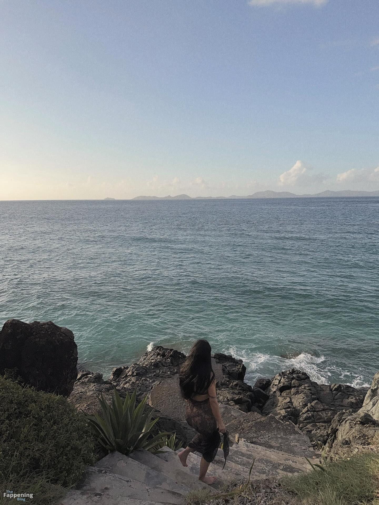 Kim Kardashian está em um ensaio fotográfico à beira da praia, usando um vestido de renda transparente, mostrando seus seios e bumbum.