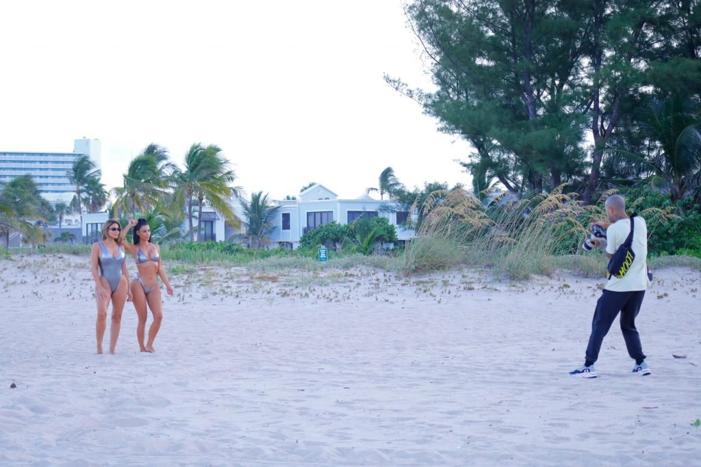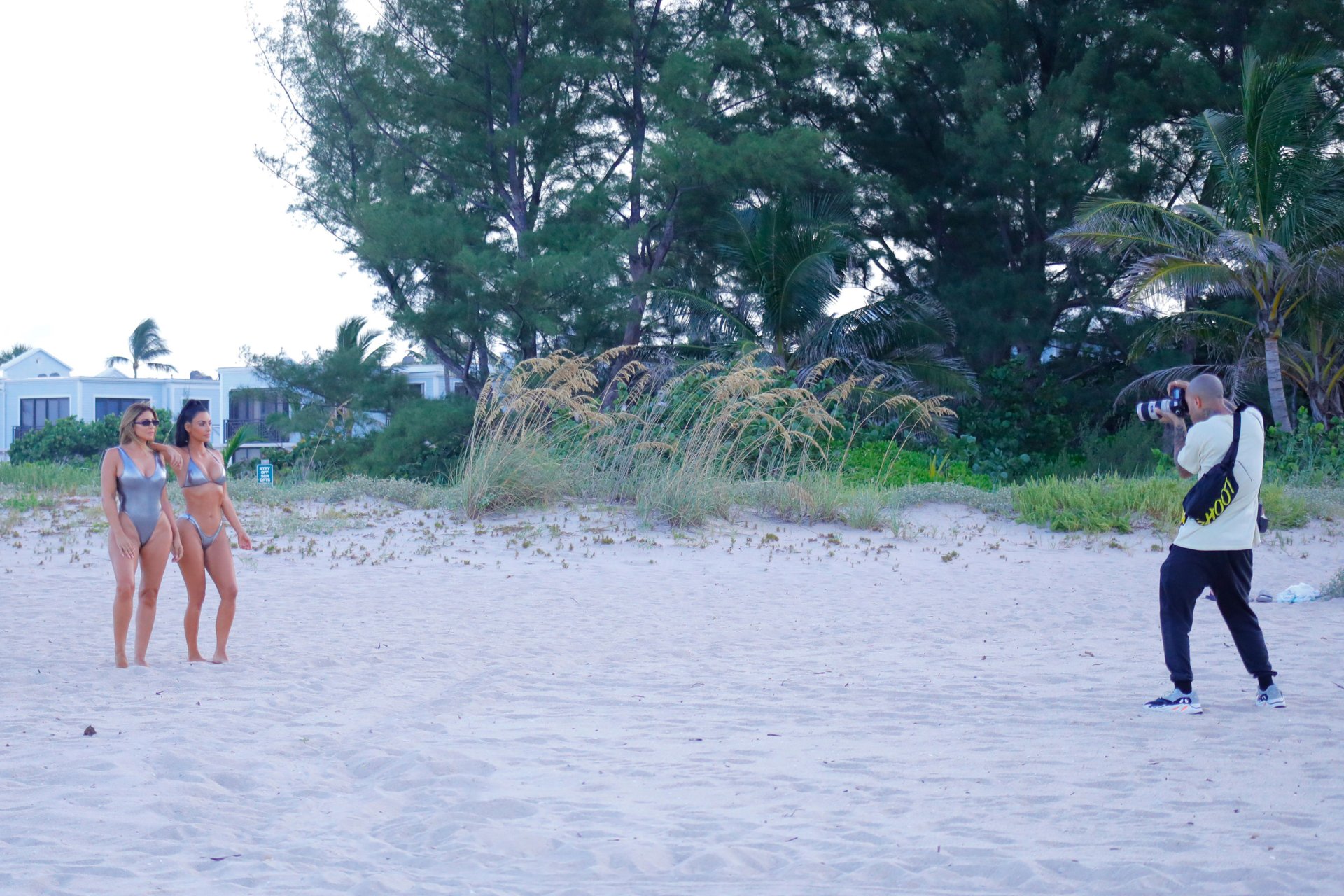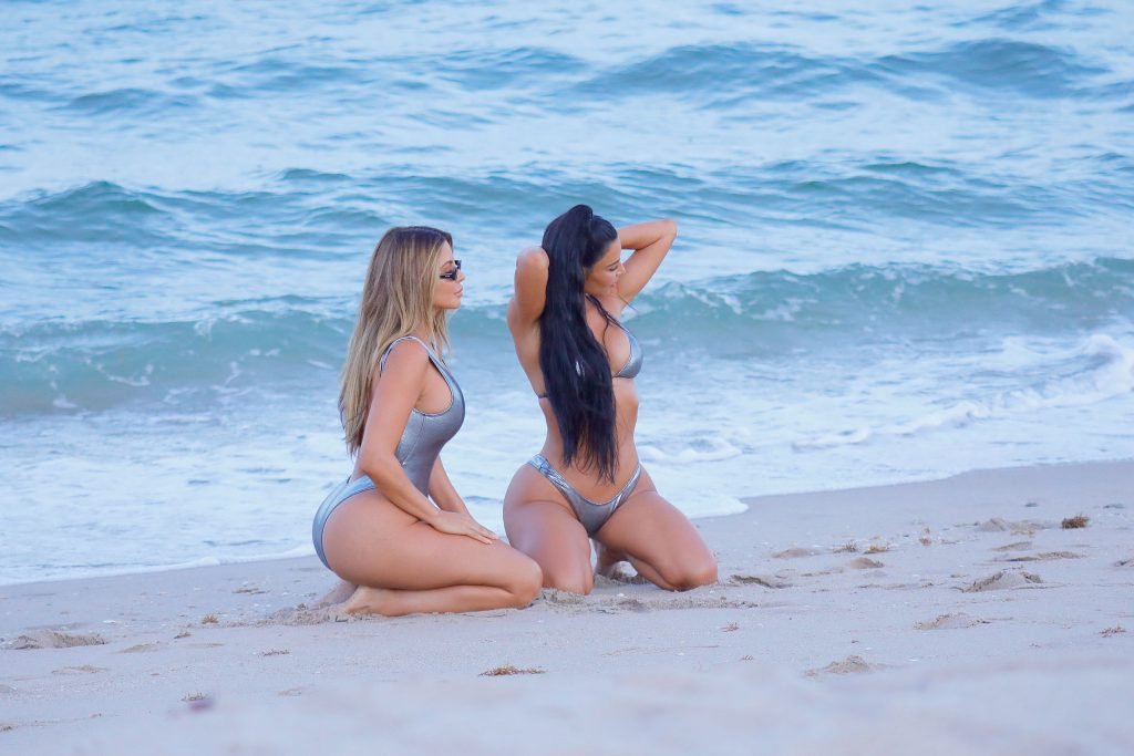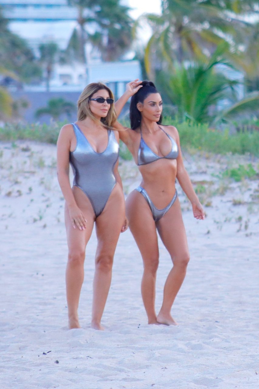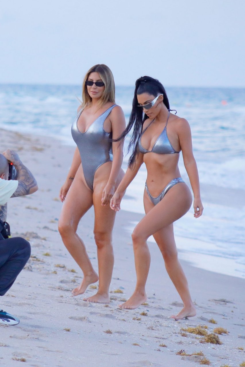 Amigas curvilíneas Kim Kardashian & Larsa Pippen aproveitam um dia usando biquíni/maiô prateado combinando durante um ensaio fotográfico em Miami, 18/08/2018.