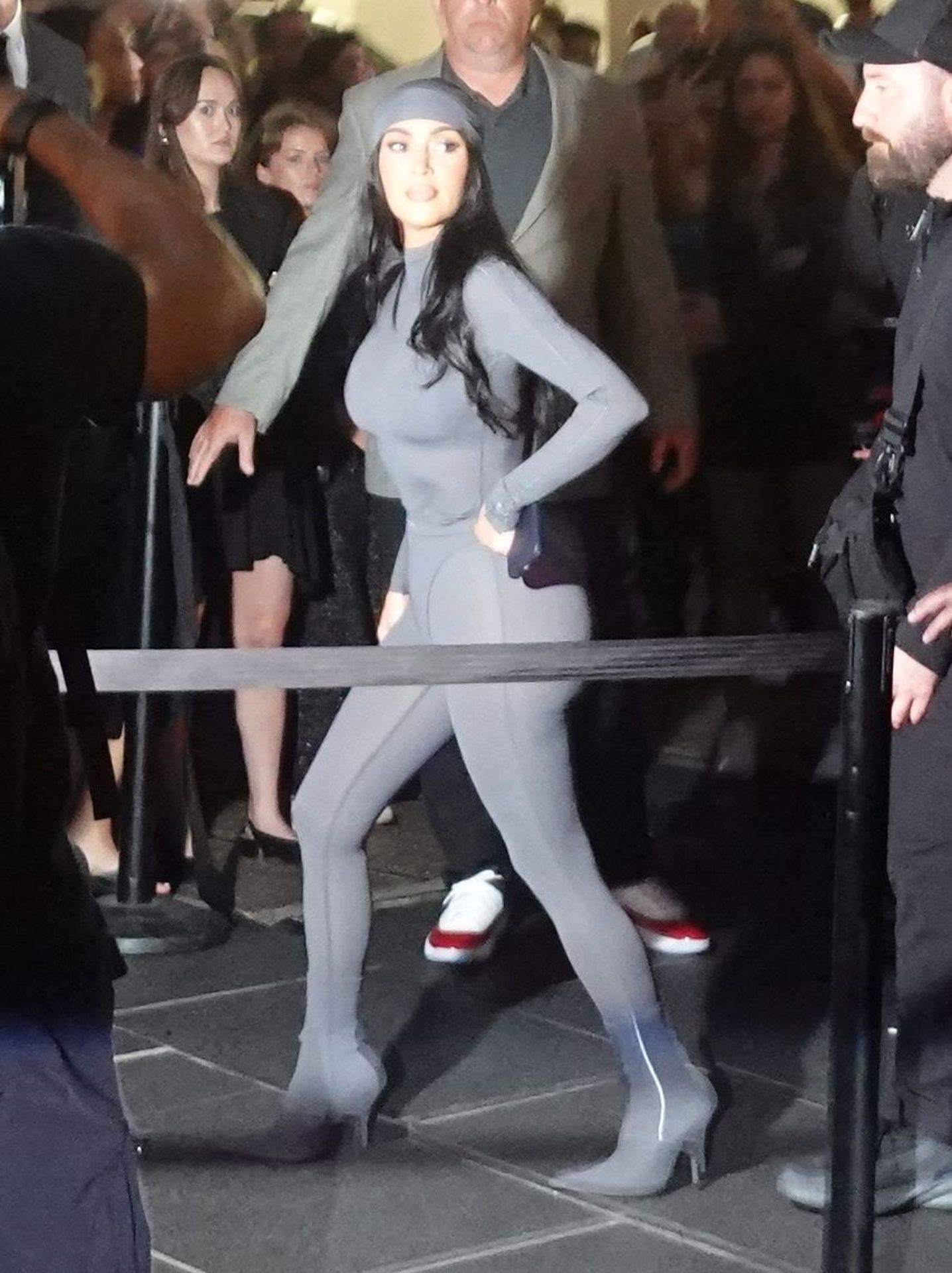 Kim Kardashian was seen arriving at the Nike store in New York City to promote her Skims brand. She wore a sleek, fitted gray bodysuit with white seam detailing, paired with a matching gray headscarf.