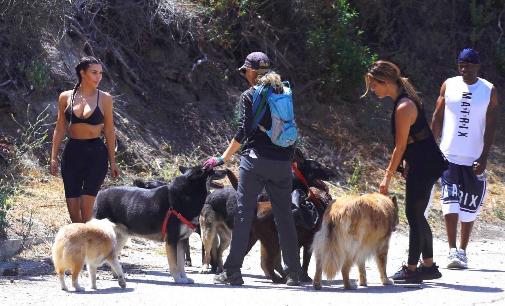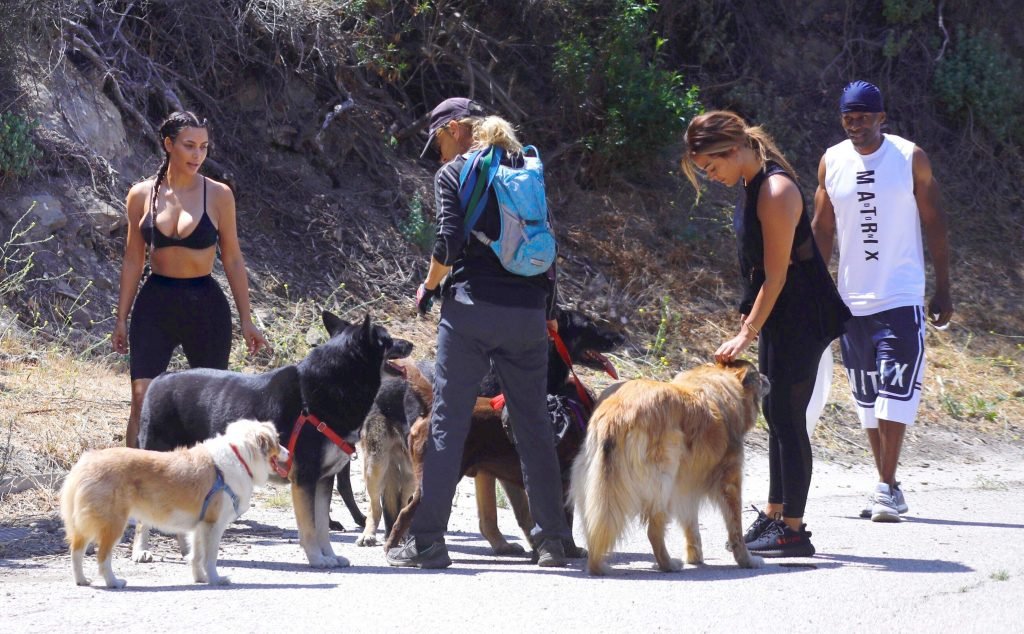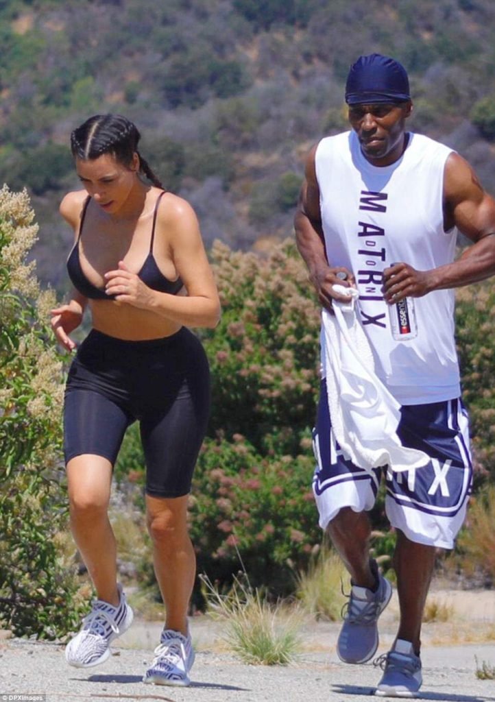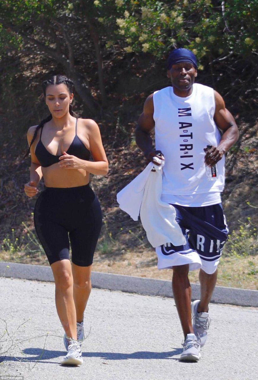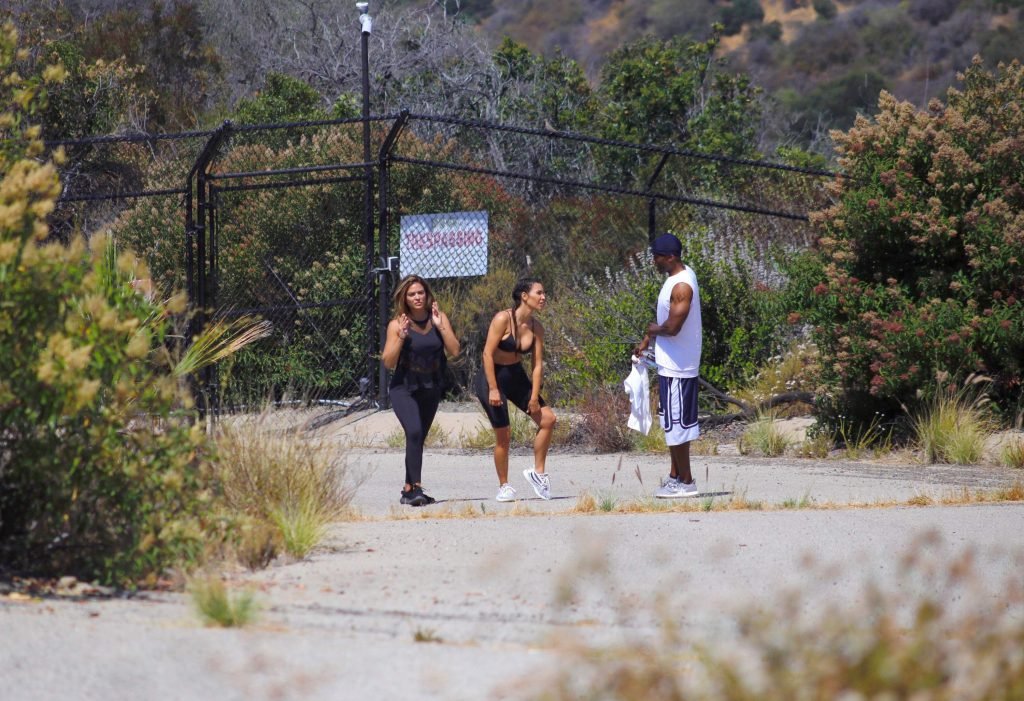 A estrela de TV Kim Kardashian exibe sua figura falsa com top de sutiã esportivo e shorts em uma caminhada extenuante no Fryman Canyon, 07/07/2017.