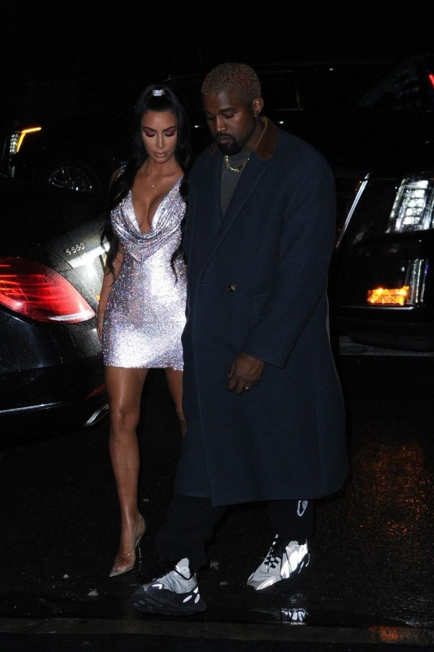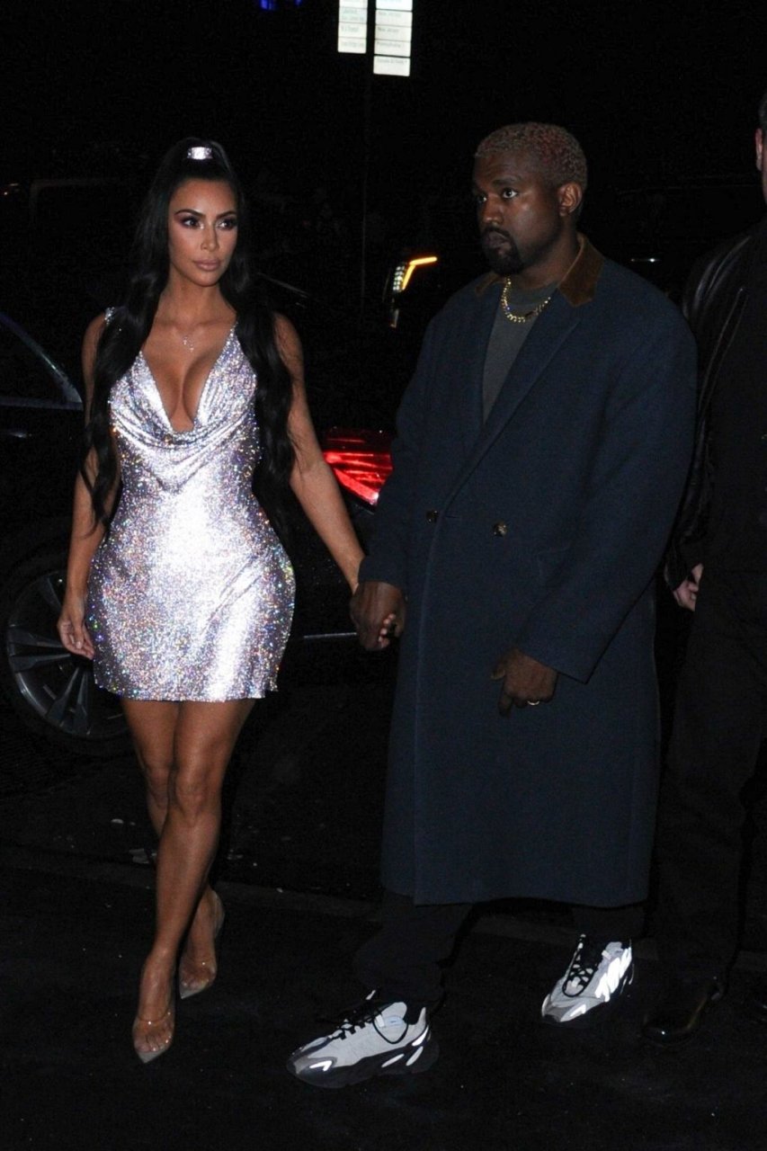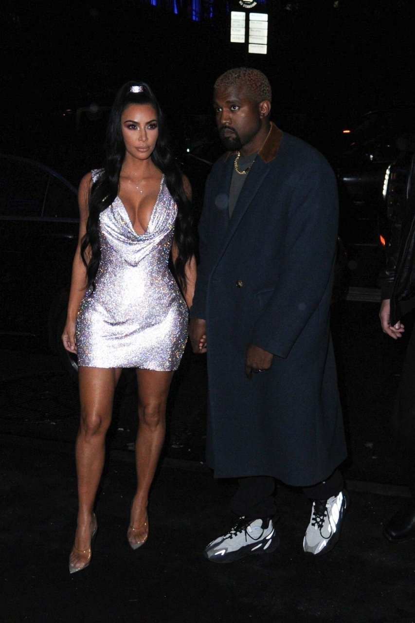 Kim Kardashian e Kanye West chegam ao desfile de moda da Versace em Nova York, 12/02/2018. Kim não deixou o frio pará-la, exibindo suas curvas em um mini vestido prateado brilhante e saltos transparentes Yeezy.