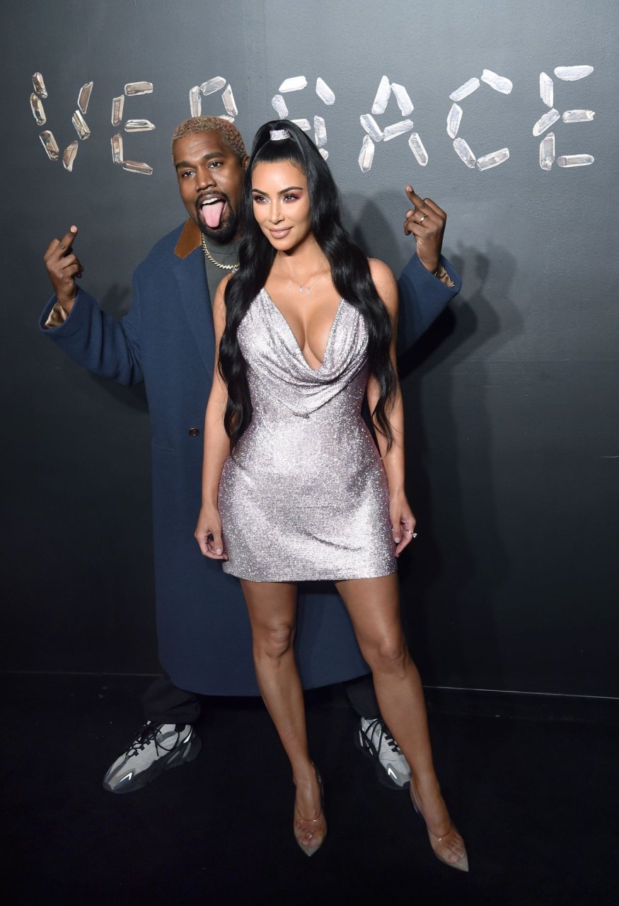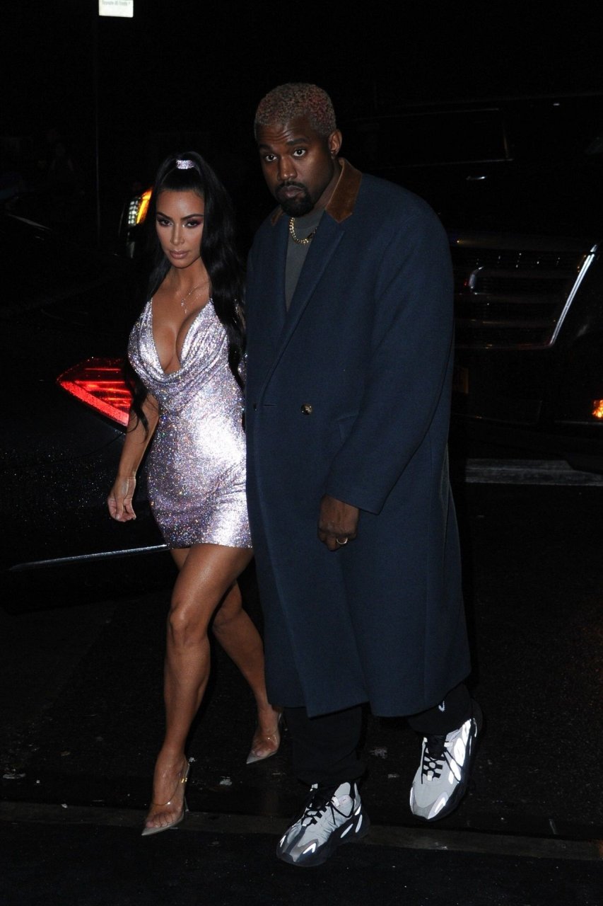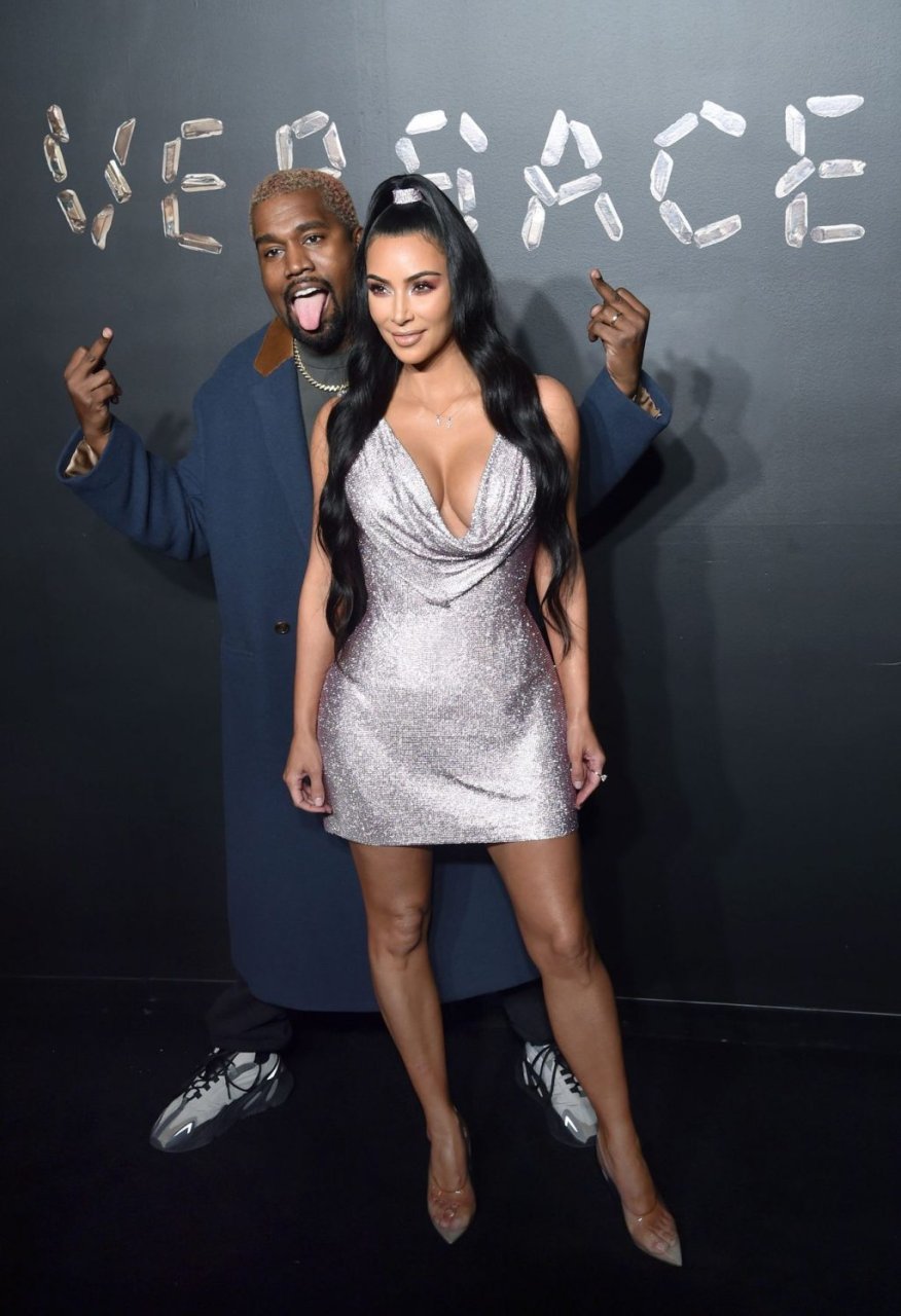 Kim Kardashian e Kanye West chegam ao desfile de moda da Versace em Nova York, 12/02/2018. Kim não deixou o frio pará-la, exibindo suas curvas em um mini vestido prateado brilhante e saltos transparentes Yeezy.