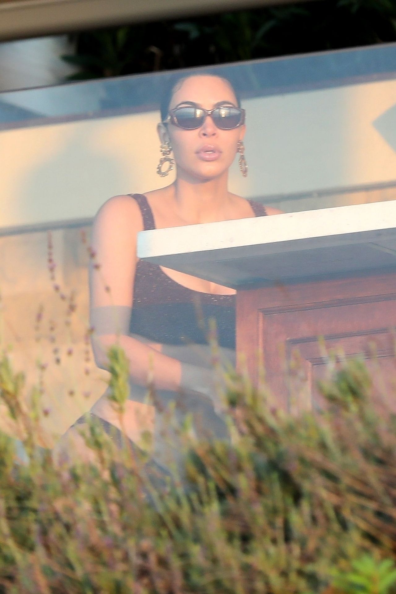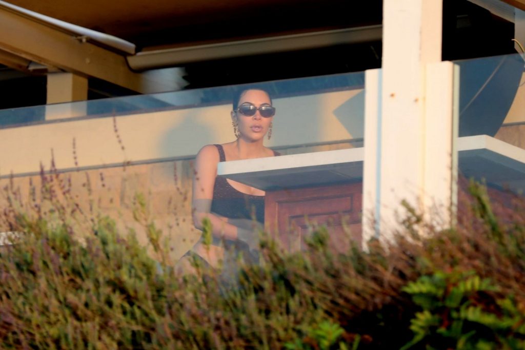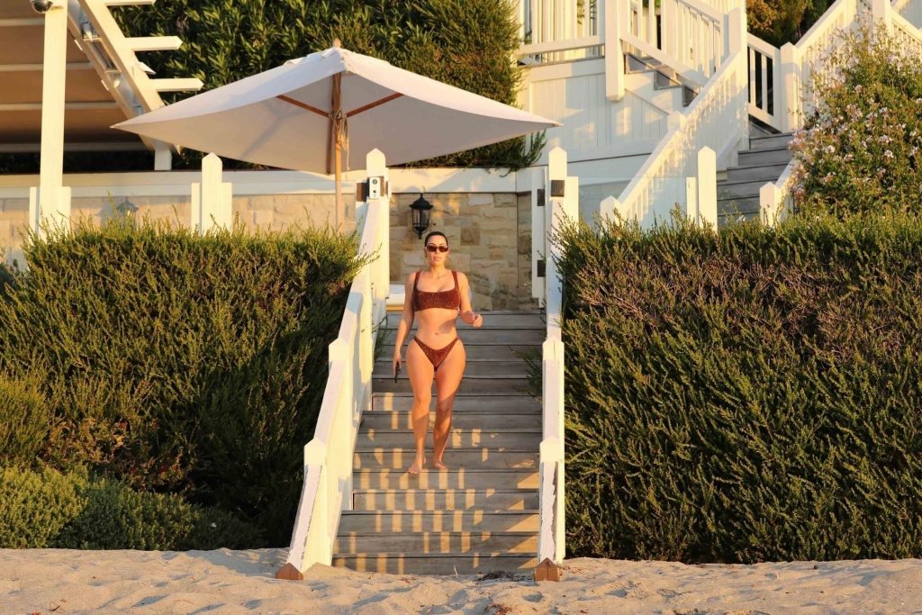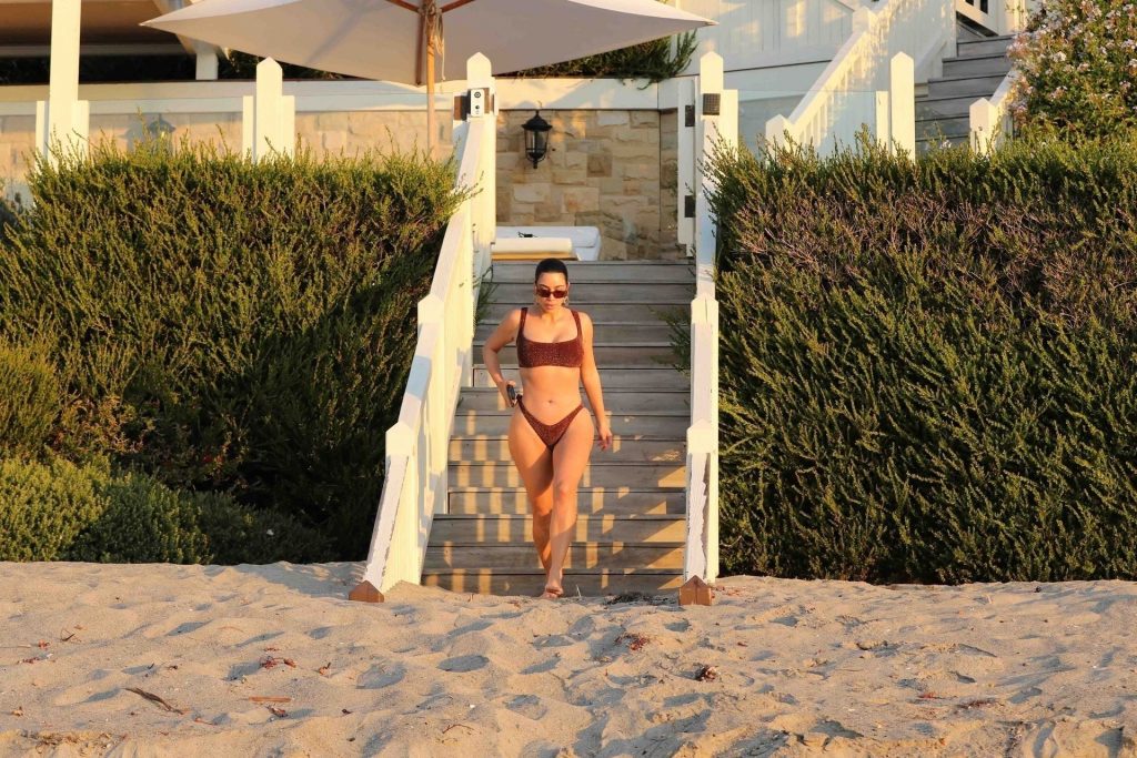 Kim Kardashian acorda cedo para uma caminhada matinal ao nascer do sol usando um biquíni vinho que destaca suas famosas curvas sensuais em Malibu, 05/05/2020.