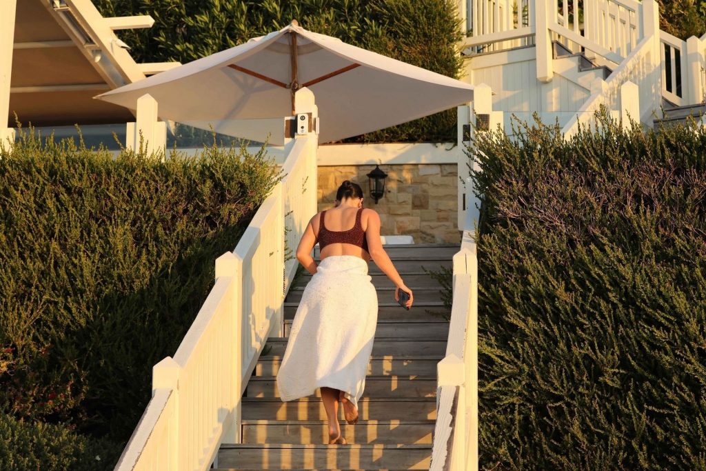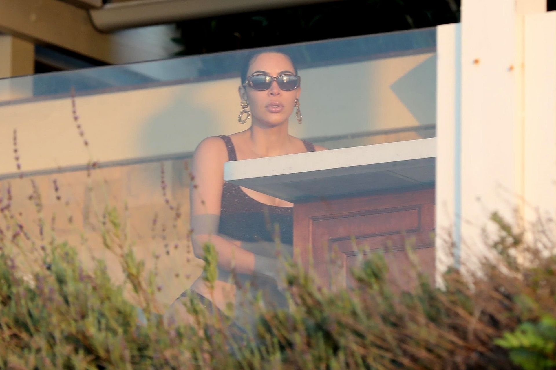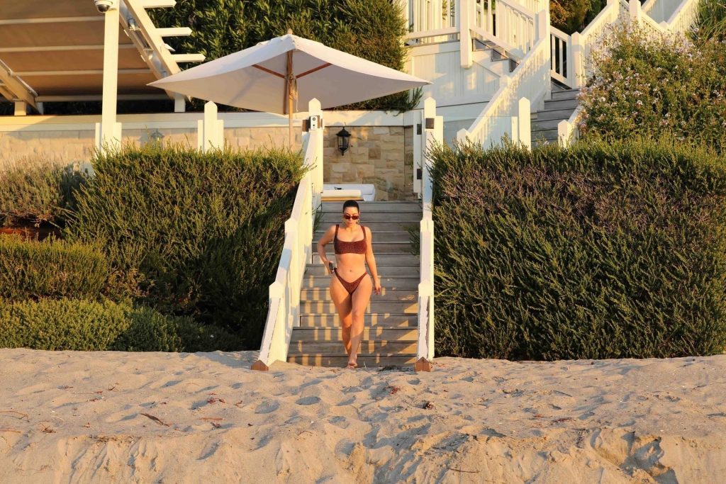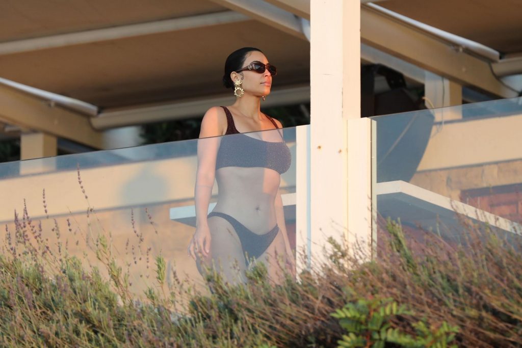 Kim Kardashian acorda cedo para uma caminhada matinal ao nascer do sol usando um biquíni vinho que destaca suas famosas curvas sensuais em Malibu, 05/05/2020.