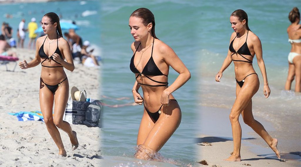 Kimberley Garner exibe seu corpo deslumbrante em um biquíni preto cruzado enquanto aproveita um mergulho no mar em Miami.