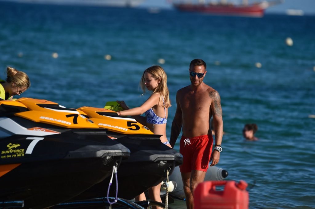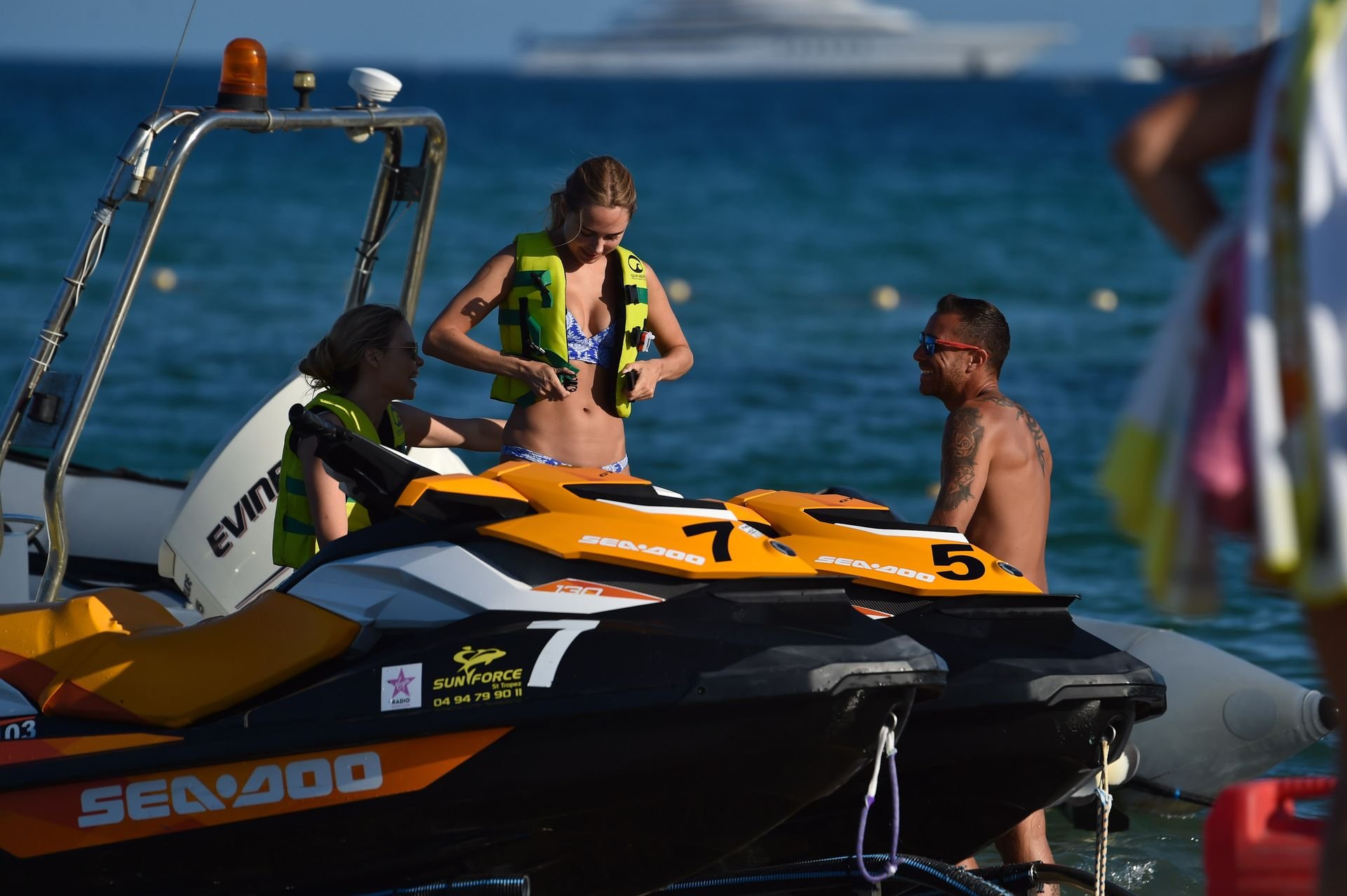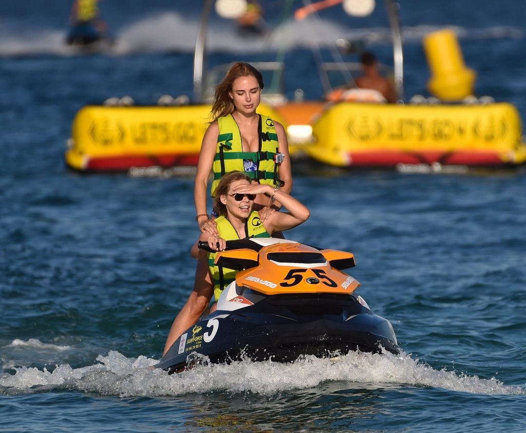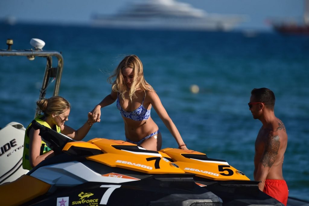 Kimberley Garner é vista andando de jet ski com um amigo em St Tropez, 13/08/2019. Com a pele bronzeada e dourada em suas férias de verão, Kimberley parecia incrível em um biquíni azul pequeno.