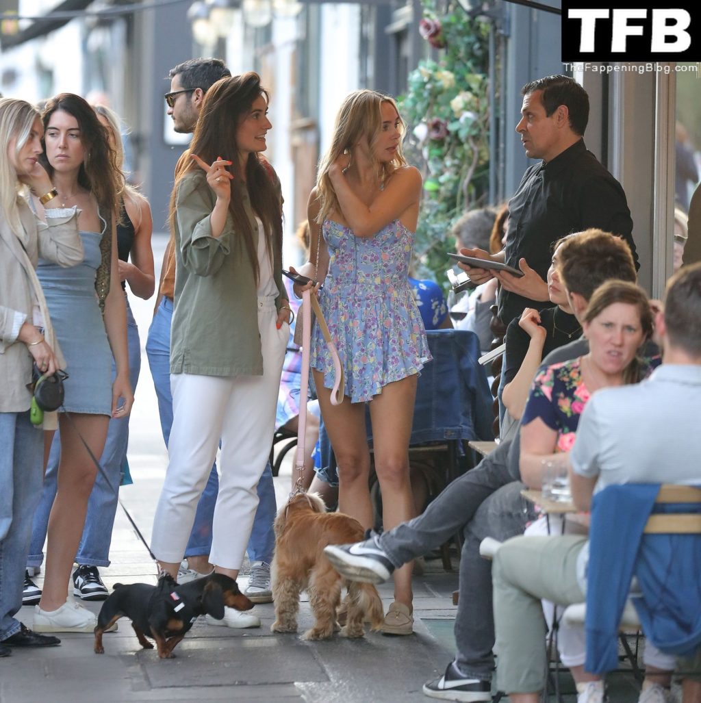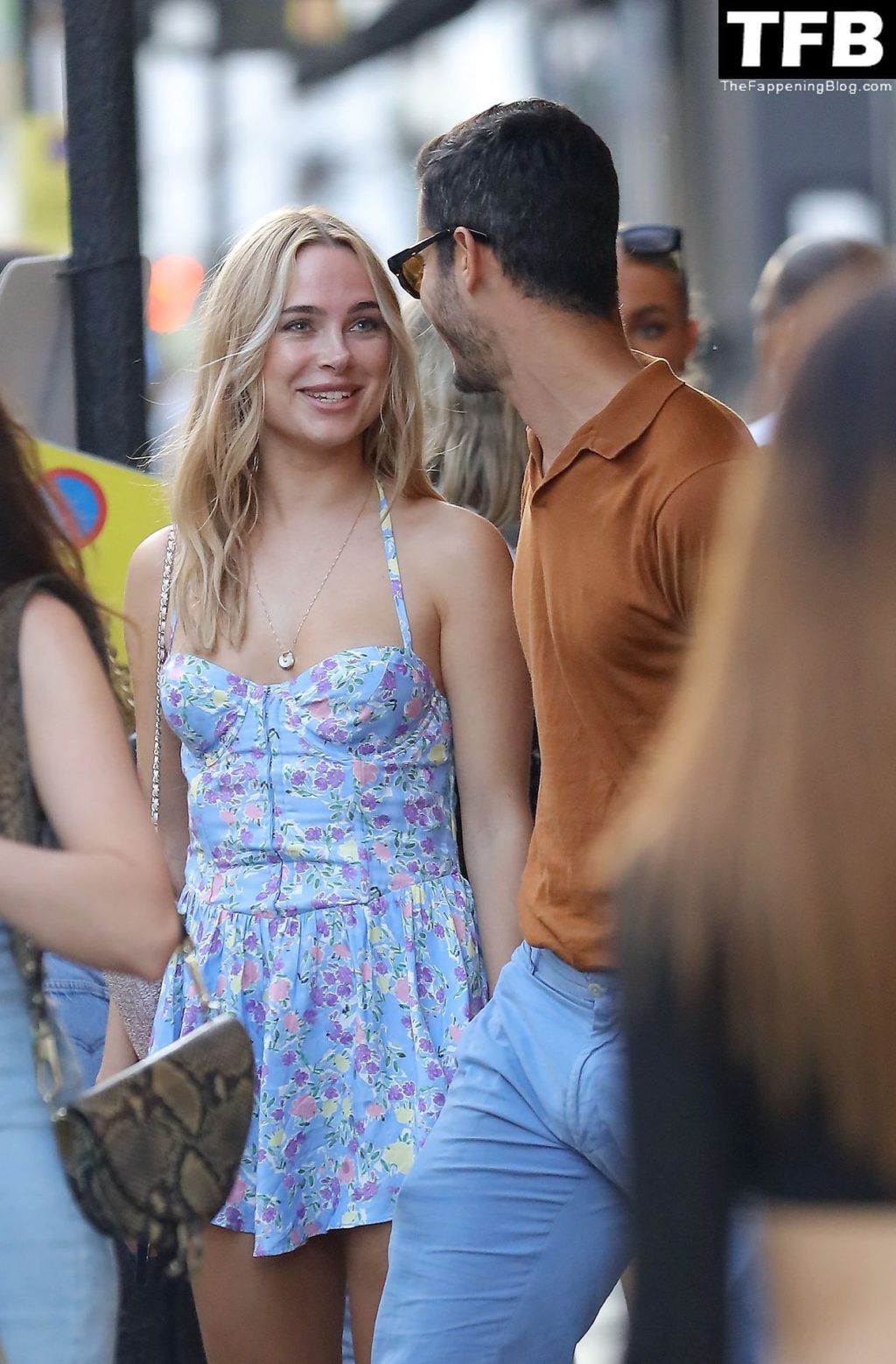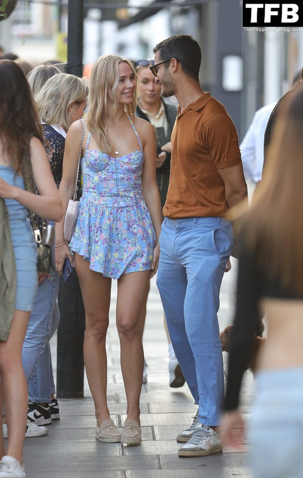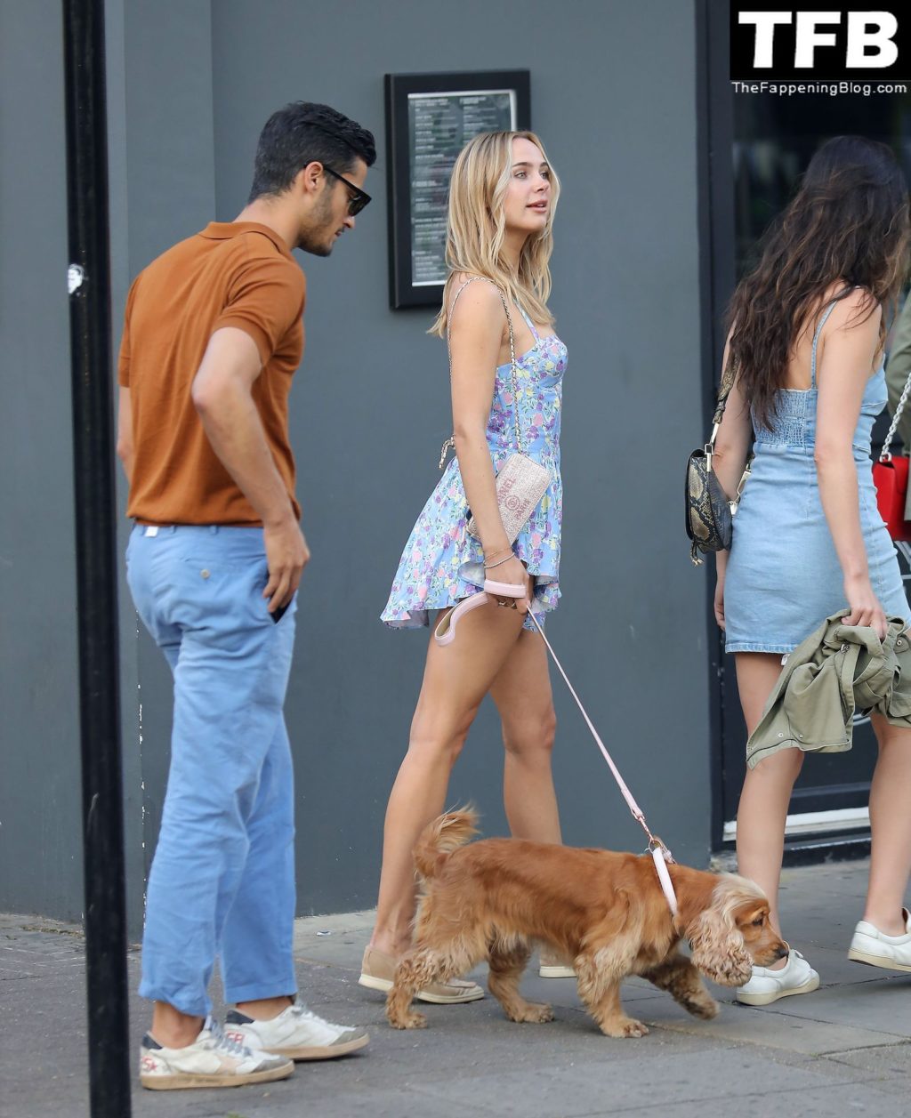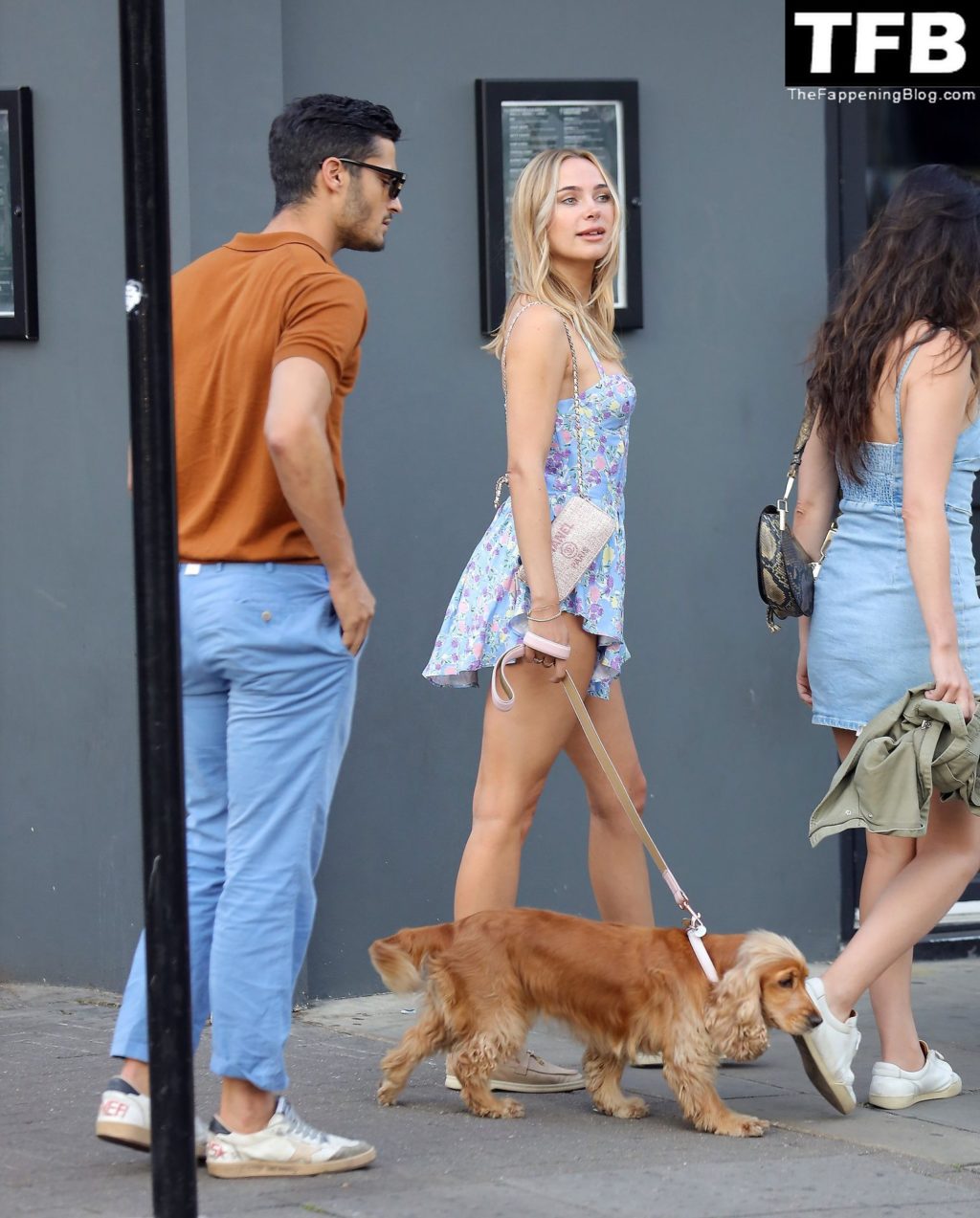 A ex-estrela de “Made In Chelsea” usava um vestido azul de verão, que era bastante curto, fazendo com que ela mostrasse seu bumbum.