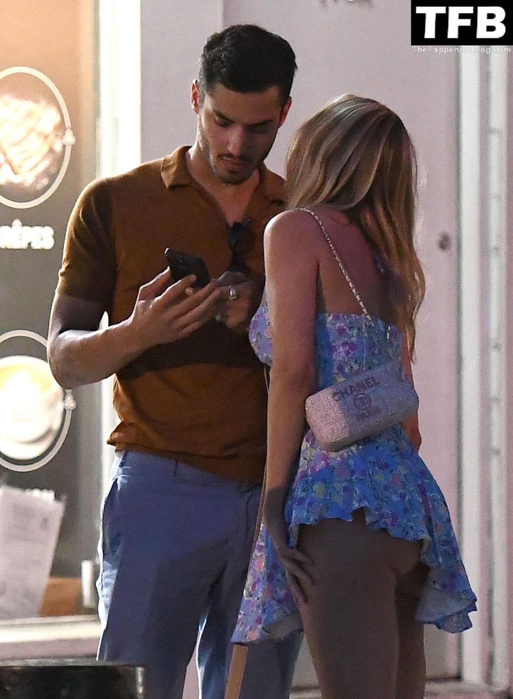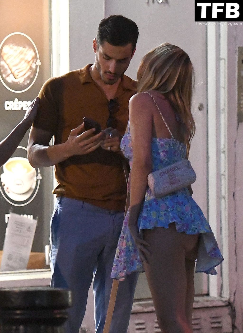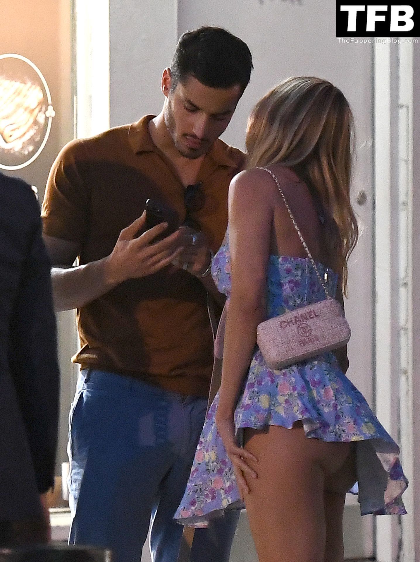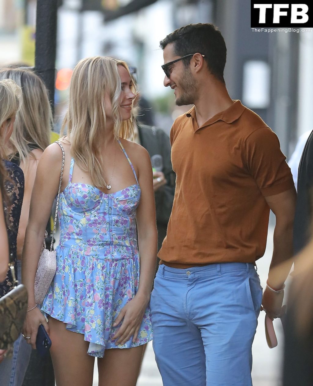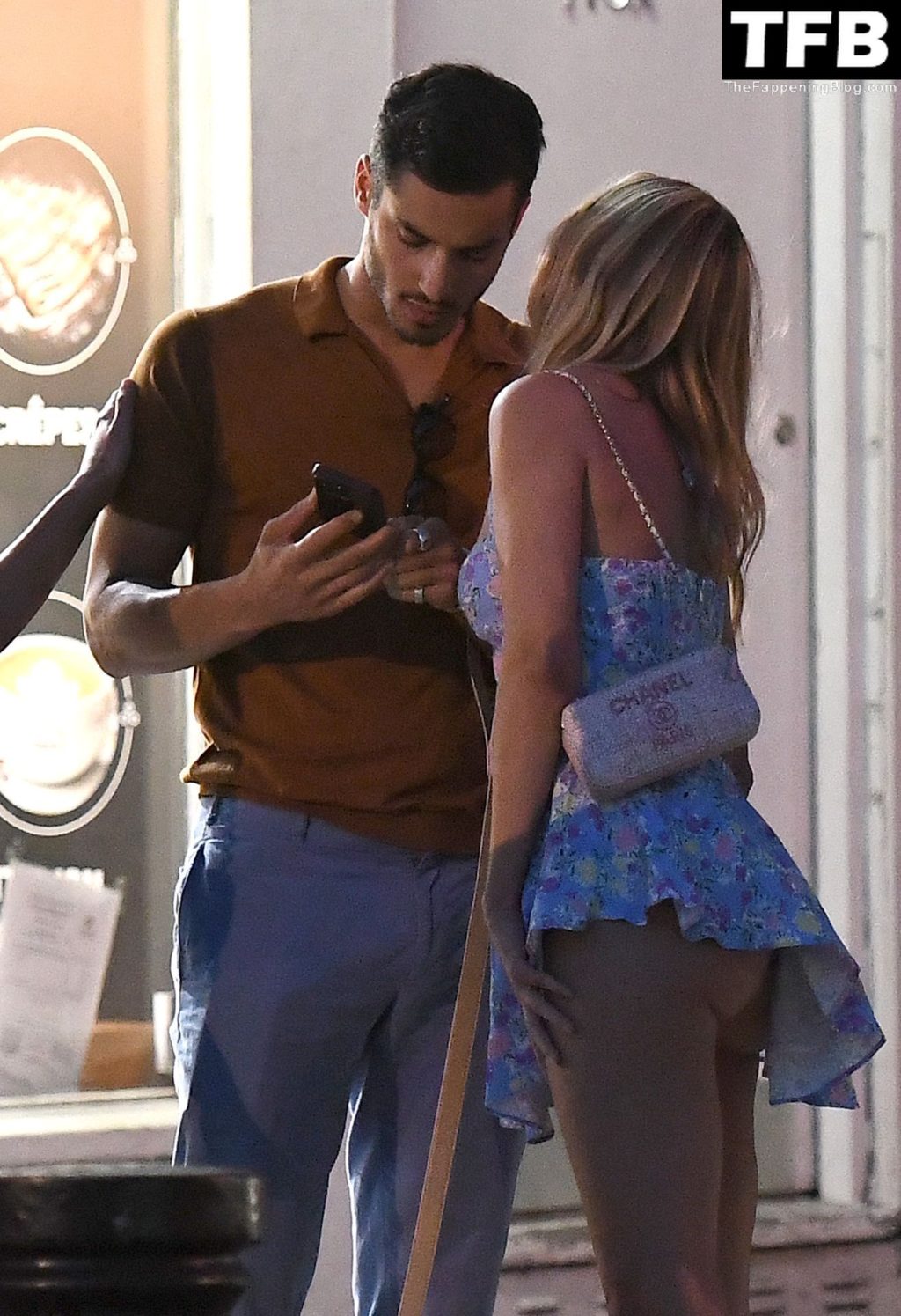 A ex-estrela de “Made In Chelsea” usava um vestido azul de verão, que era bastante curto, fazendo com que ela mostrasse seu bumbum.
