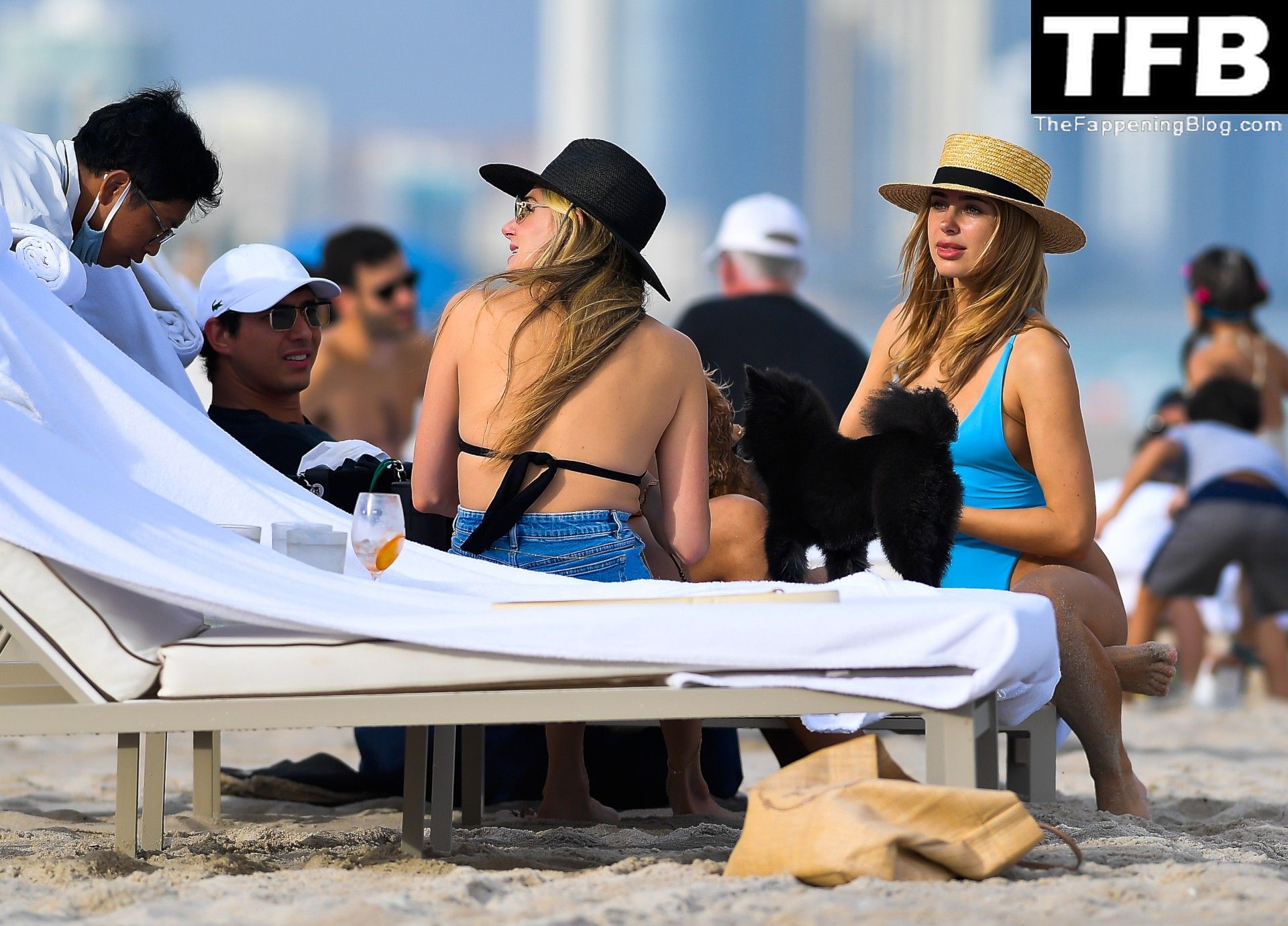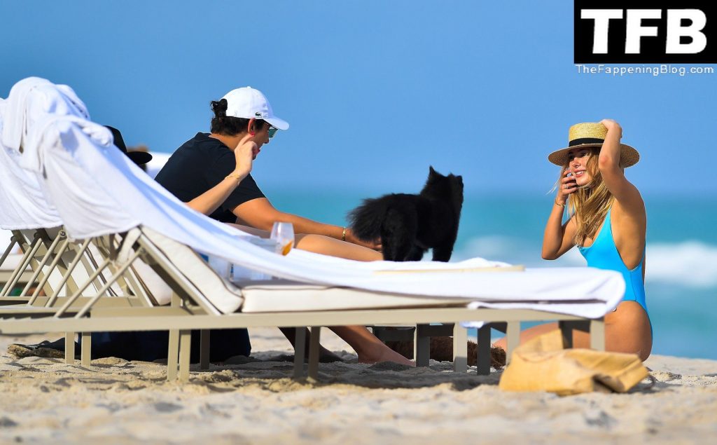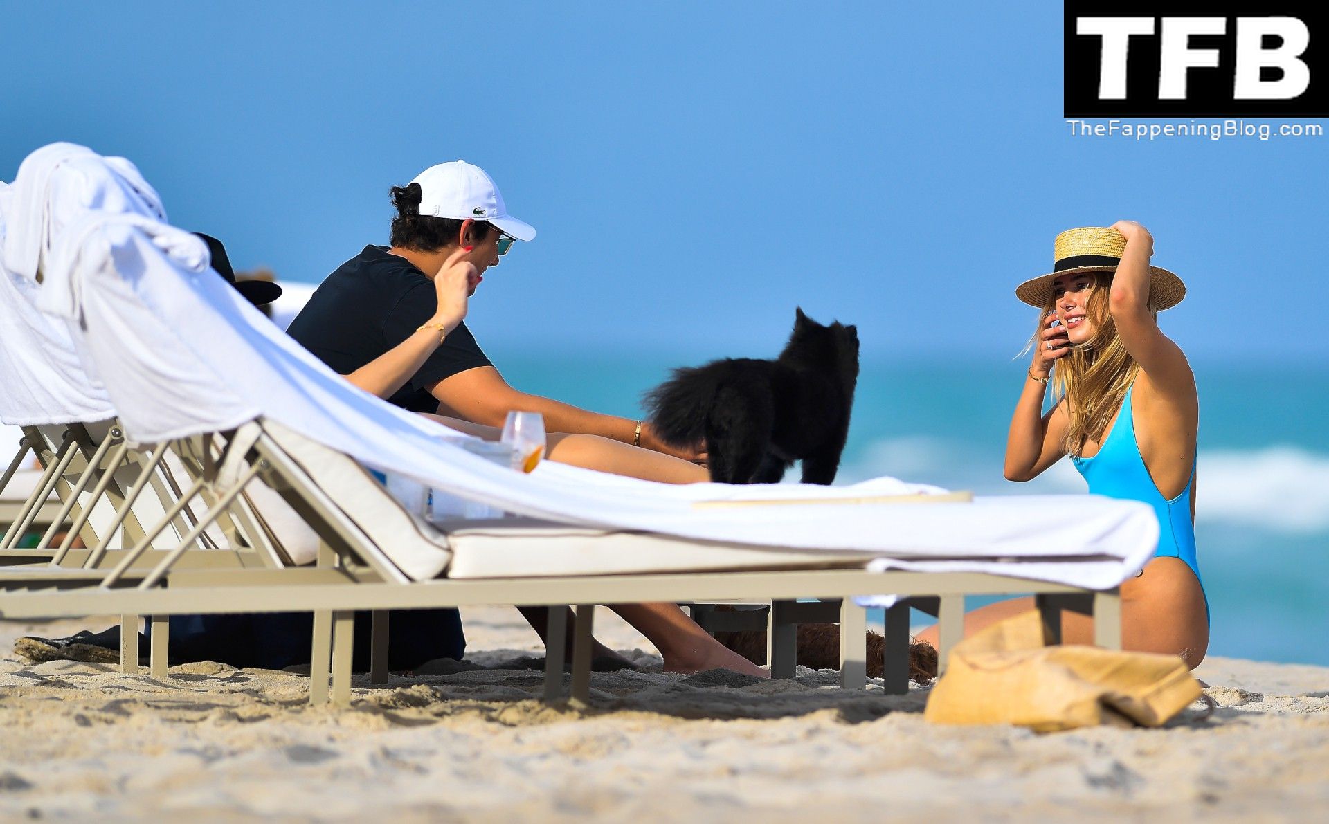 Modelo e estilista de roupas de banho Kimberley Garner exibe sua incrível figura em um maiô azul justo enquanto brinca no mar durante viagem a Miami, 19/12/2021.