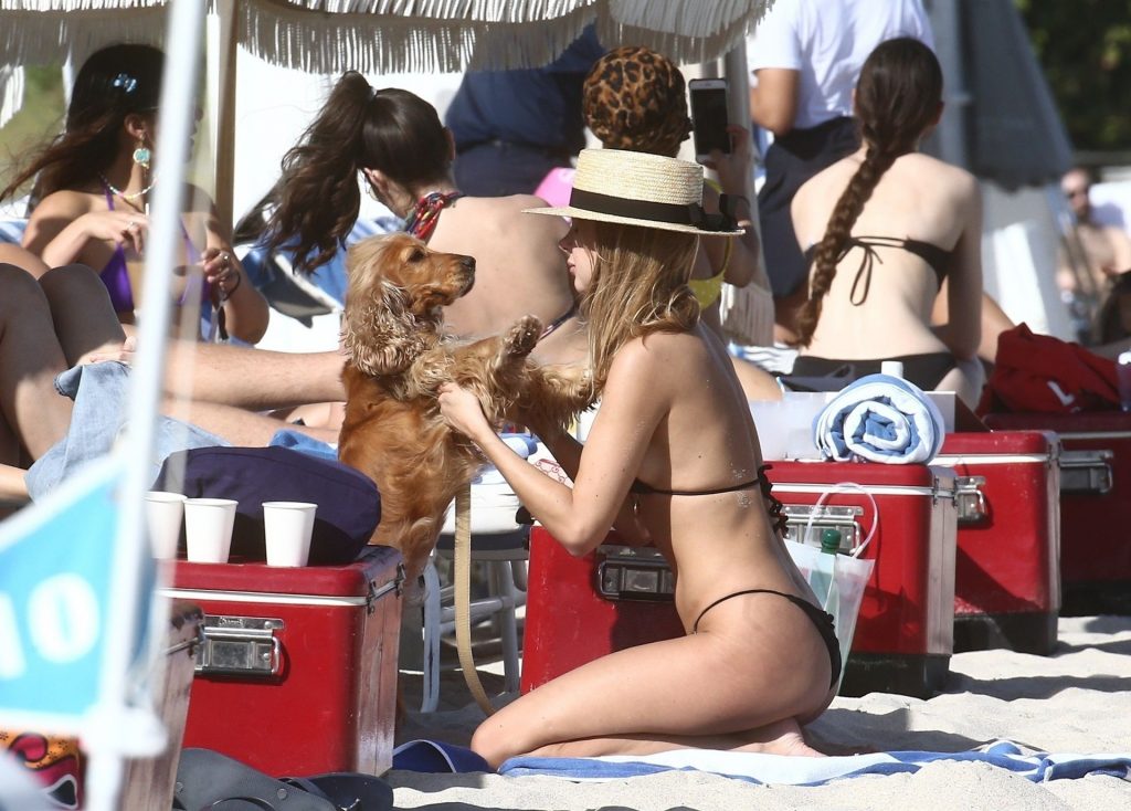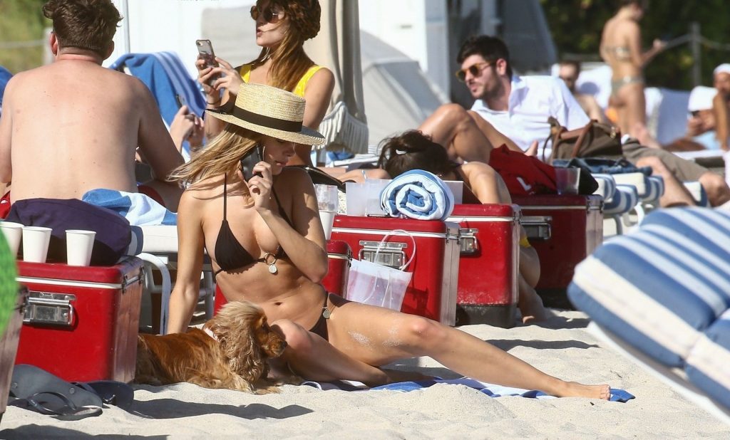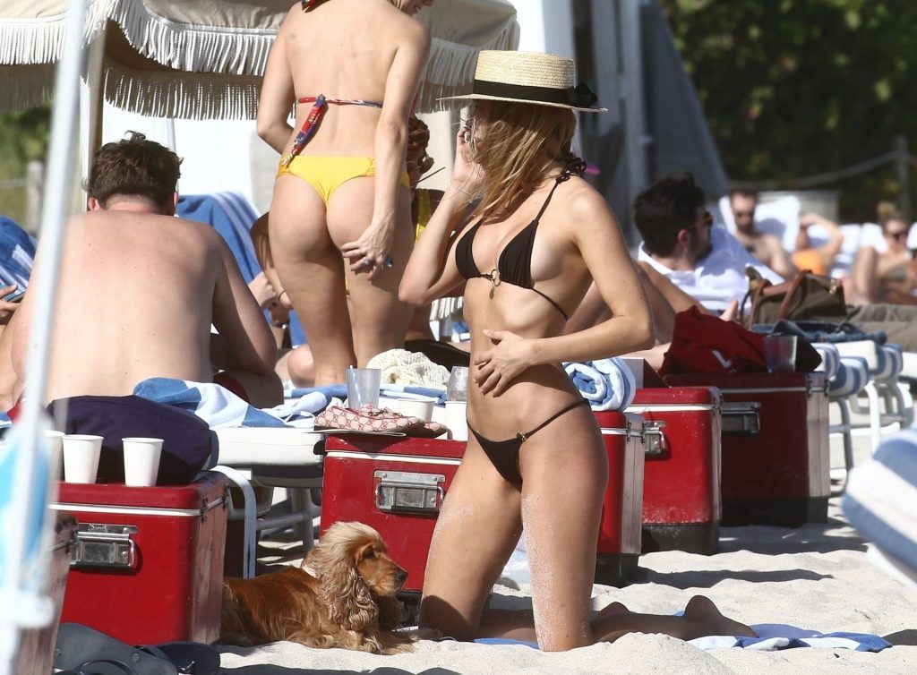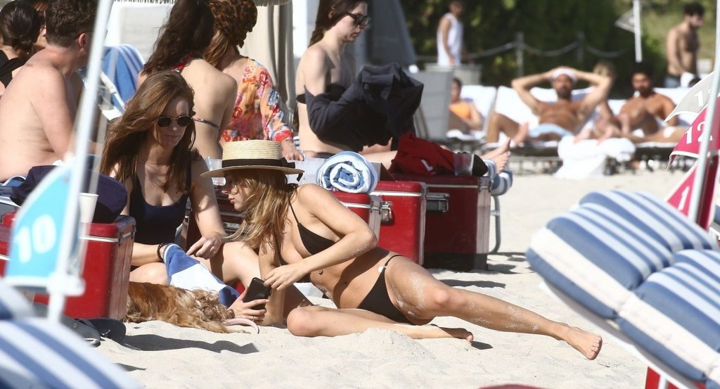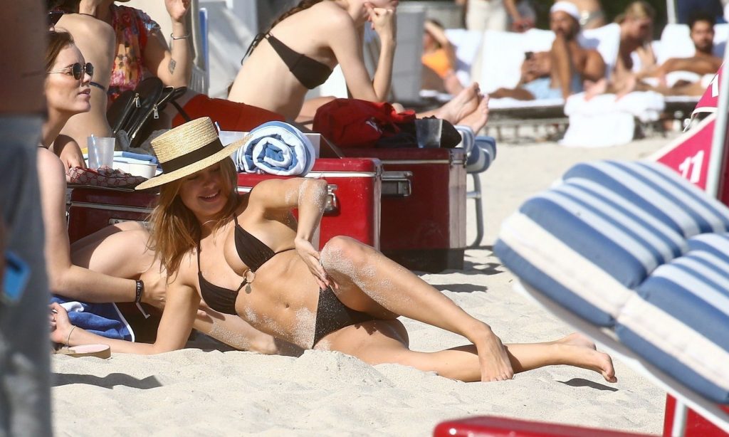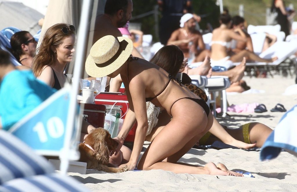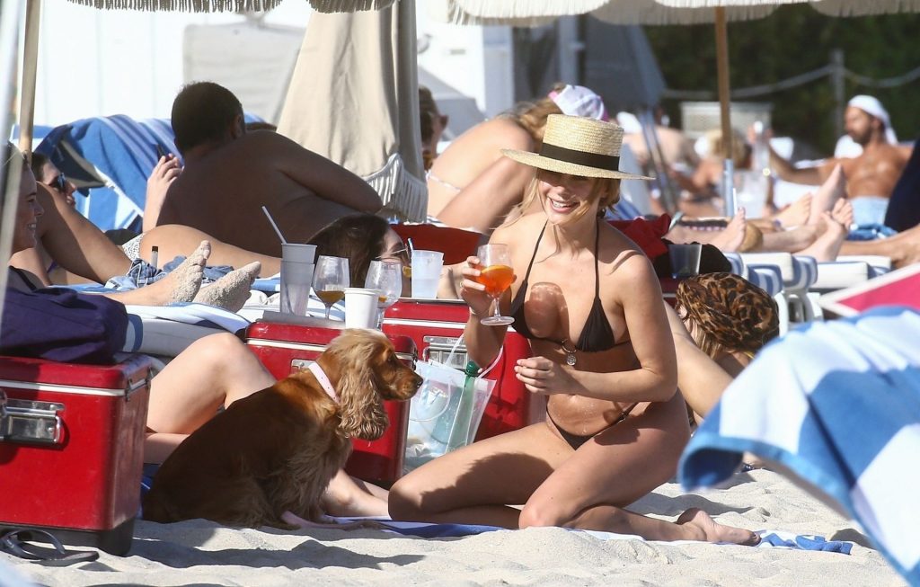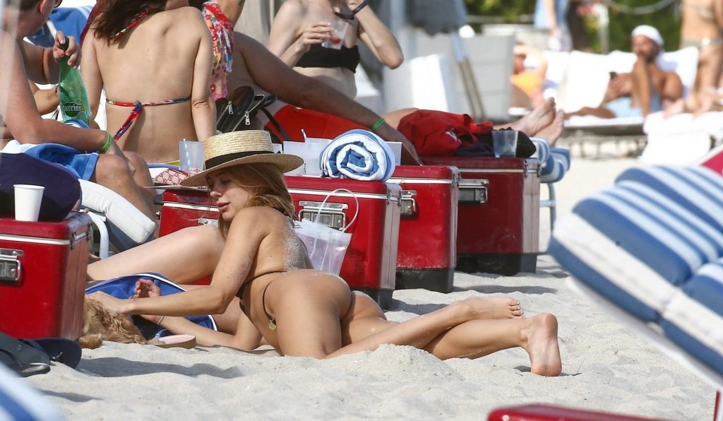 A designer de moda praia Kimberley Garner está exibindo sua figura extremamente tonificada enquanto relaxa na areia da ensolarada Miami Beach, em 13/01/2020. A influenciadora britânica de moda depois vai para o chuveiro ao ar livre para limpar seu bumbum com areia.
