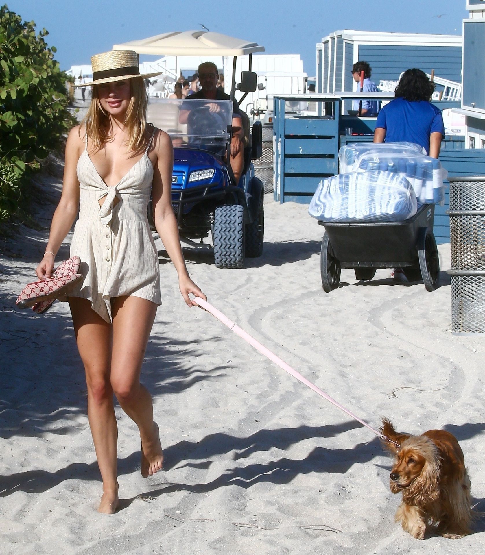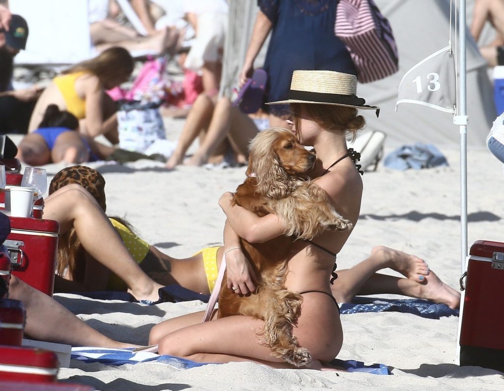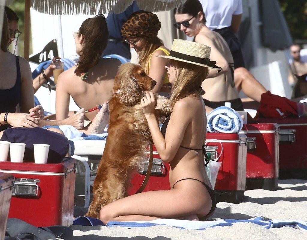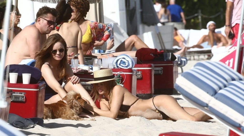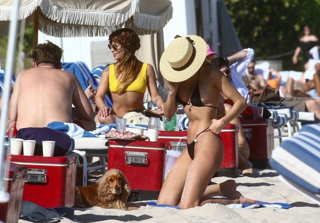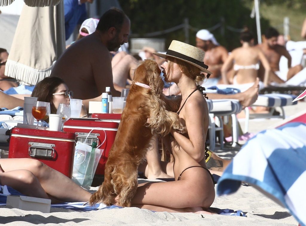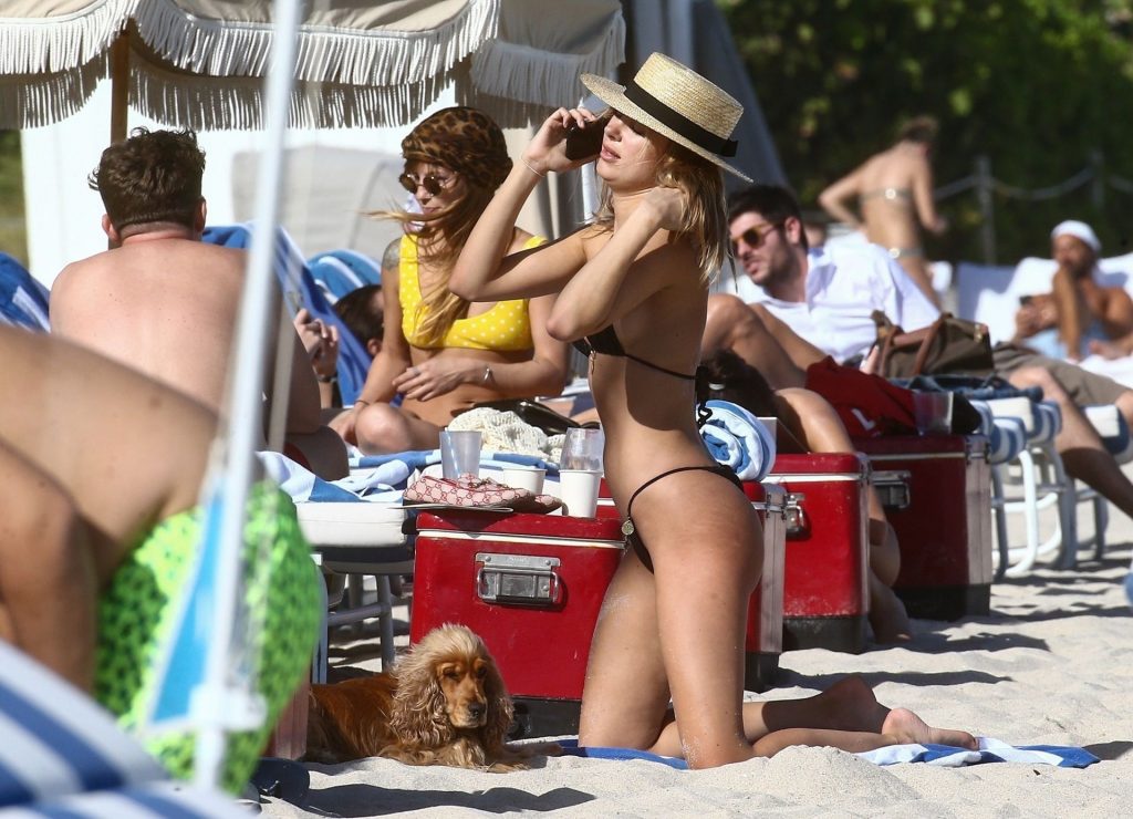 A designer de moda praia Kimberley Garner está exibindo sua figura extremamente tonificada enquanto relaxa na areia da ensolarada Miami Beach, em 13/01/2020. A influenciadora britânica de moda depois vai para o chuveiro ao ar livre para limpar seu bumbum com areia.