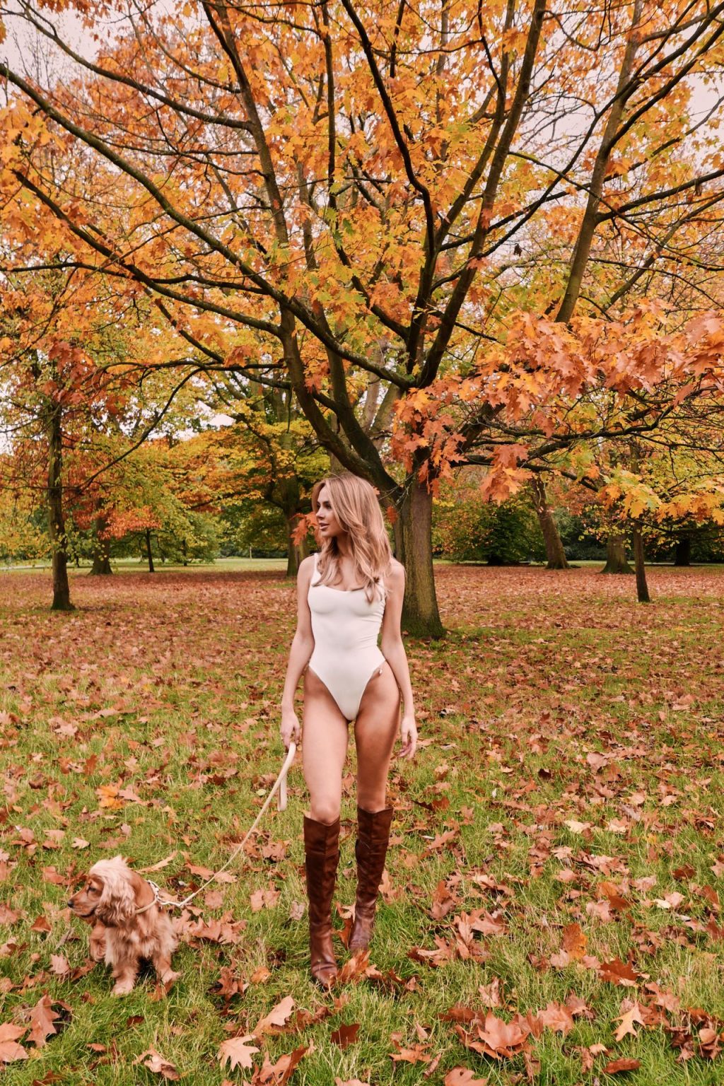 Kimberley Garner exibe seu corpo sexy e bumbum suculento enquanto posa com um maiô branco no Hyde Park em Londres, 21/11/2019.