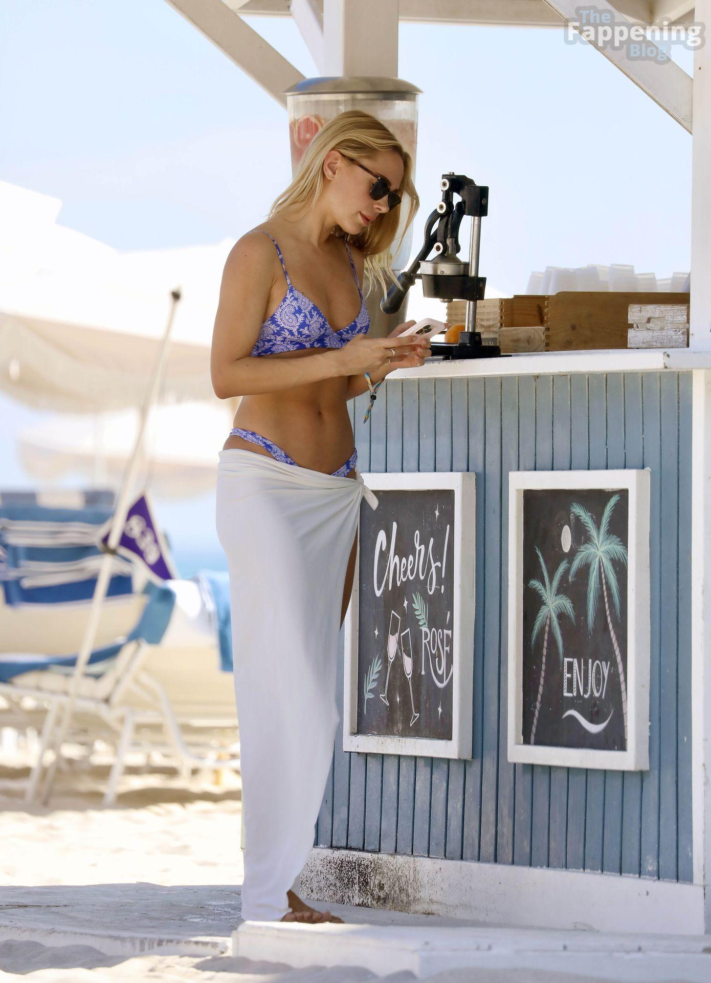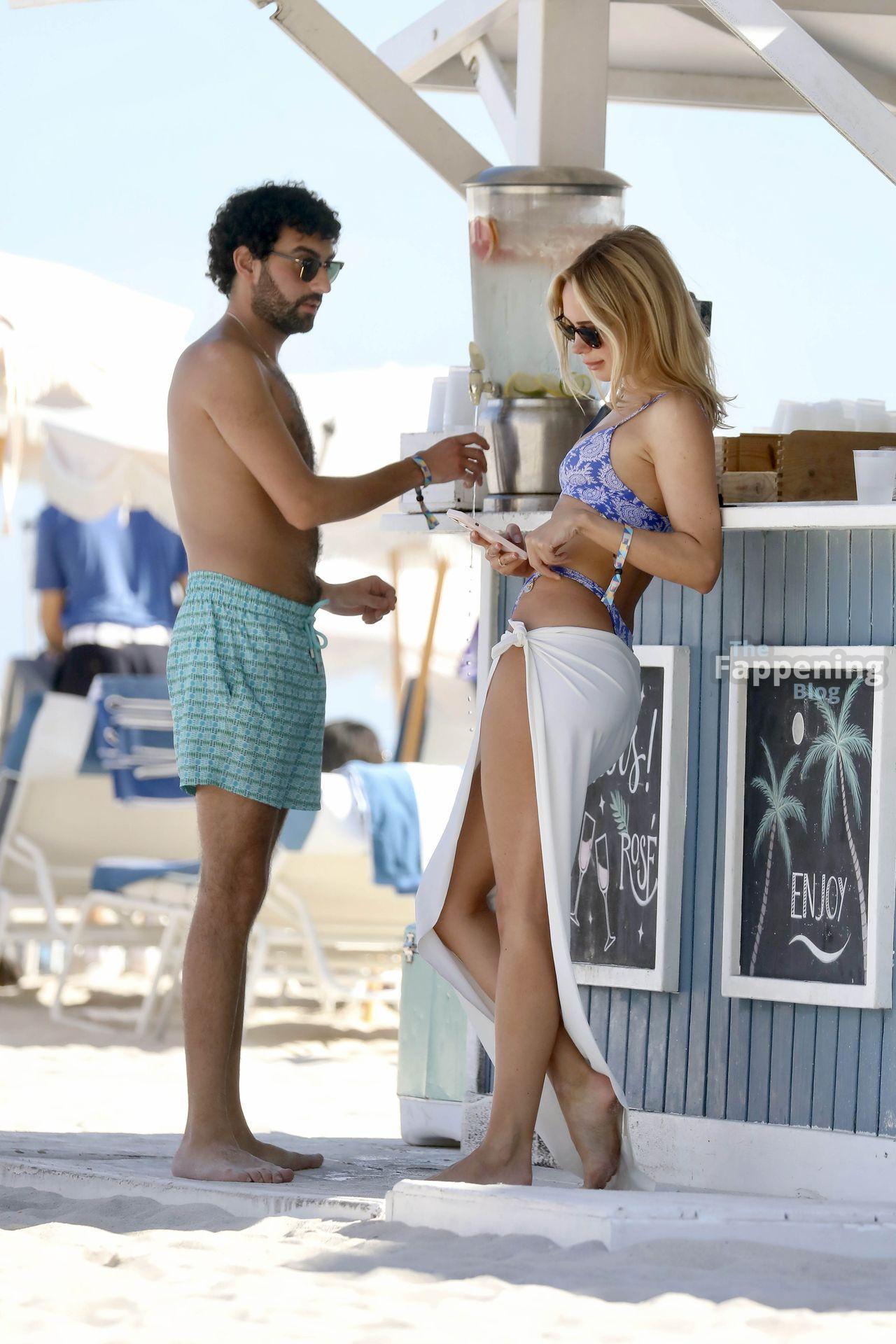 Kimberley Garner exibe sua silhueta tonificada enquanto curte a praia com a família em Miami, Flórida. A estrela de Made in Chelsea usou um pequeno biquíni azul de duas peças enquanto aproveitava um dia ensolarado.