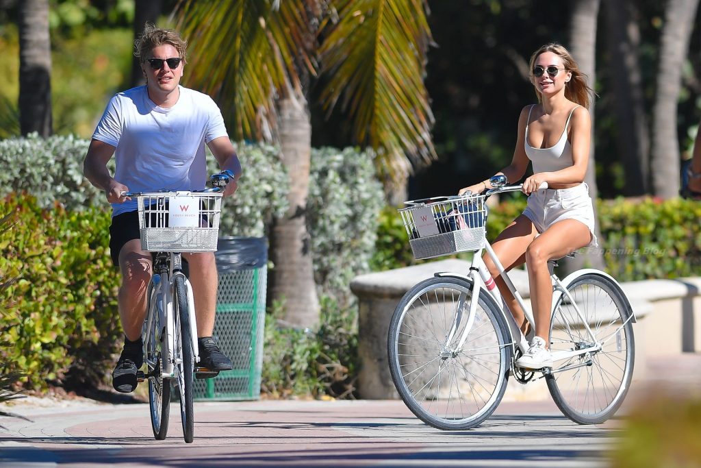 A deslumbrante britânica Kimberley Garner usa branco brilhante para um passeio de bicicleta ensolarado com seu novo namorado em Miami Beach, 28/01/2021.