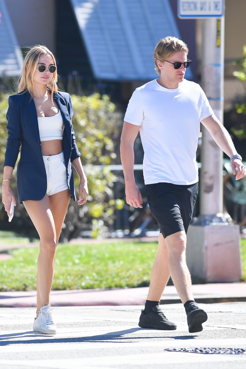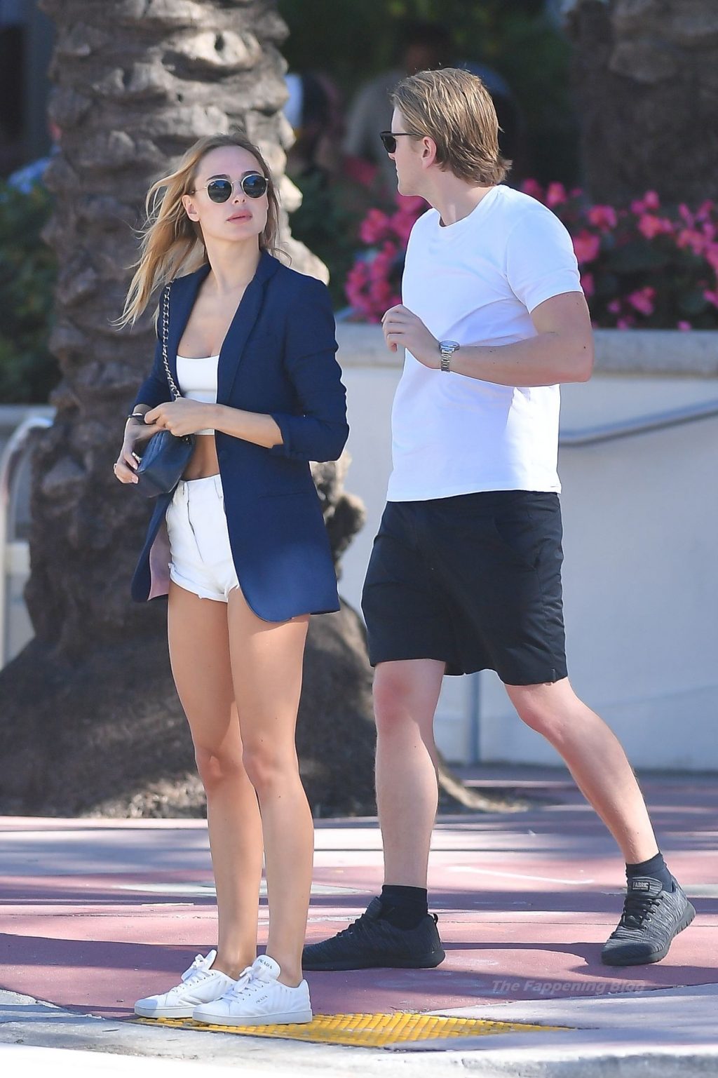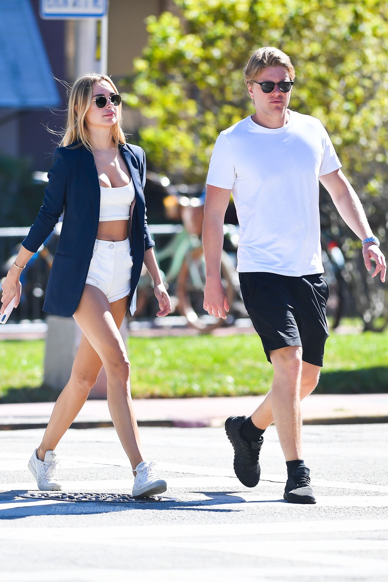 A designer de biquínis nascida em Londres exibiu sua figura impecável com uma combinação de regata curta e hotpants jeans enquanto pedalava pelo famoso calçadão da South Beach com seu homem misterioso.