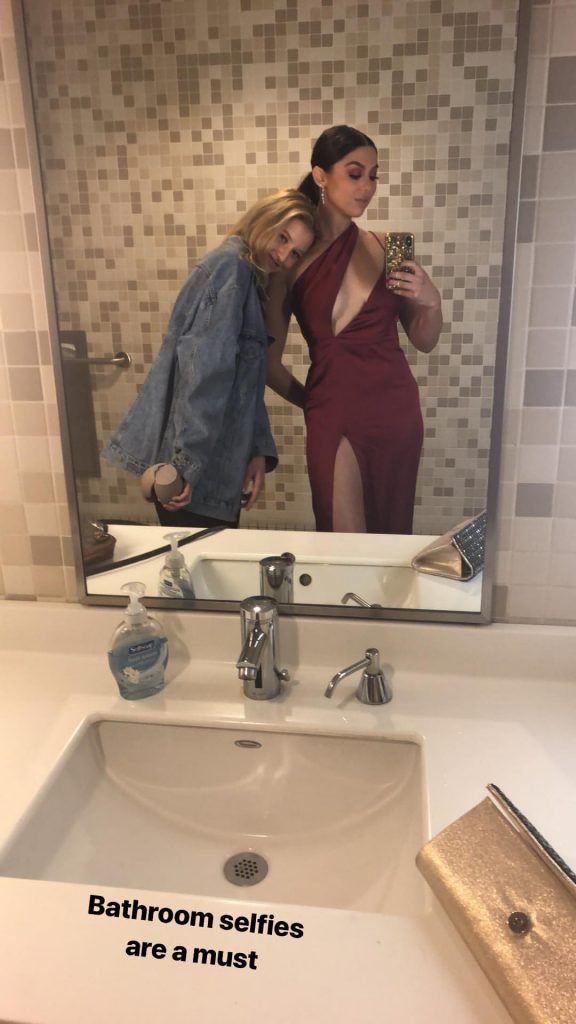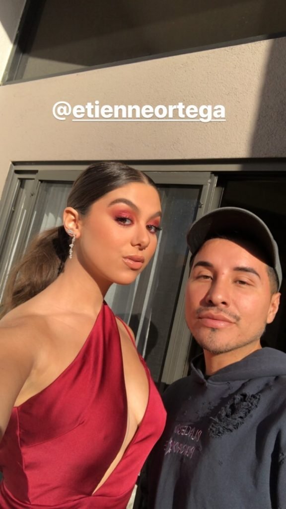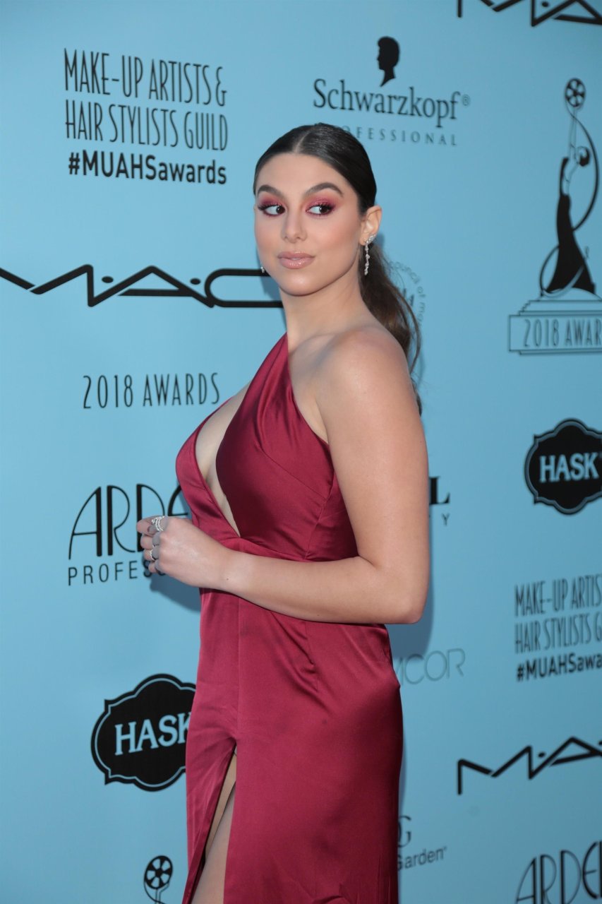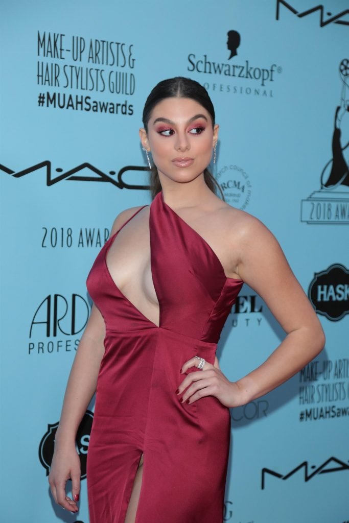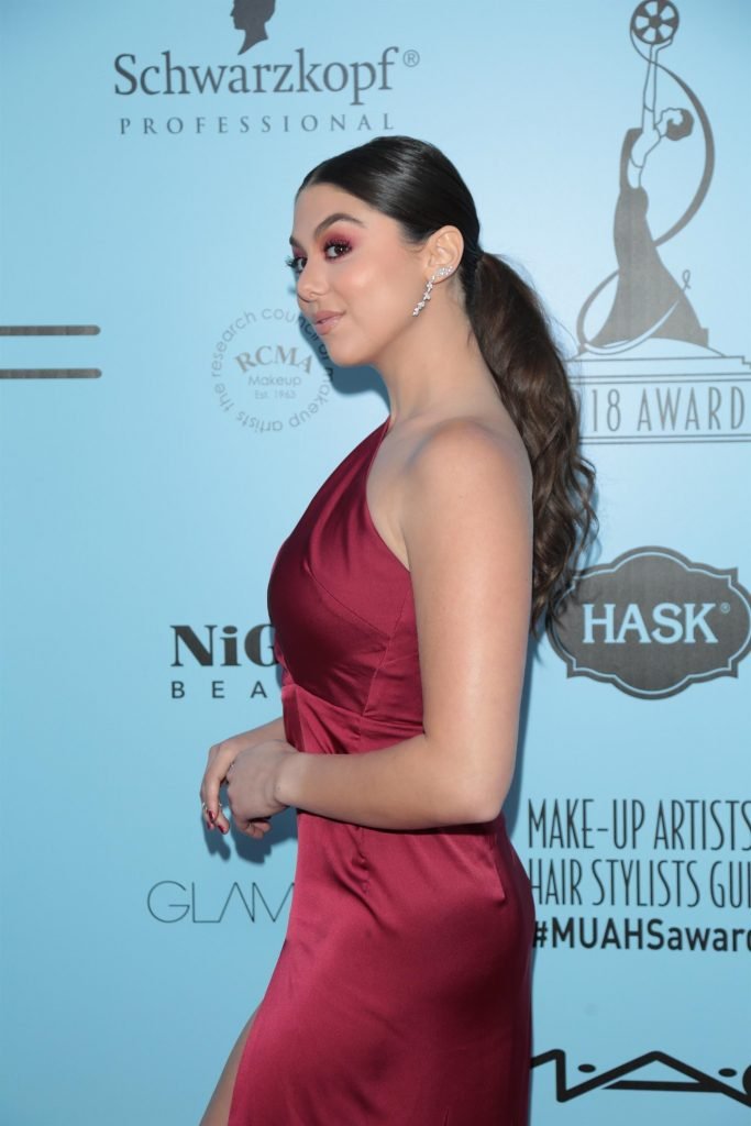 Kira Kosarin usa um vestido vermelho sem sutiã no The Make-Up Artists and Hair Stylists Guild Awards em Los Angeles, 24/02/2018. Kira Kosarin é atriz e cantora. Idade – 20 anos.