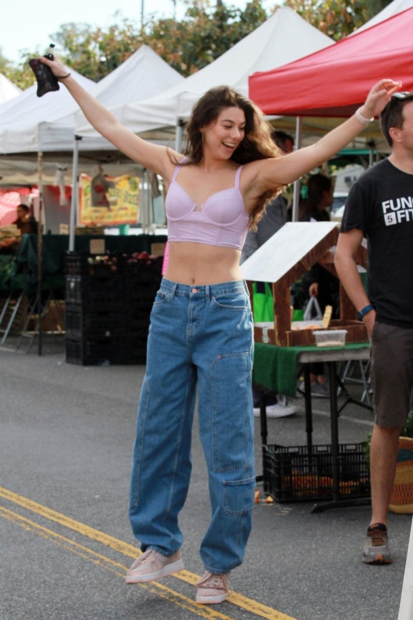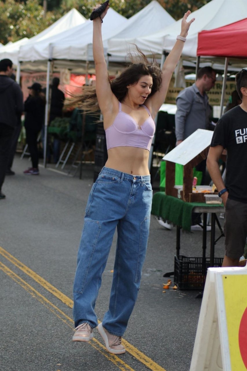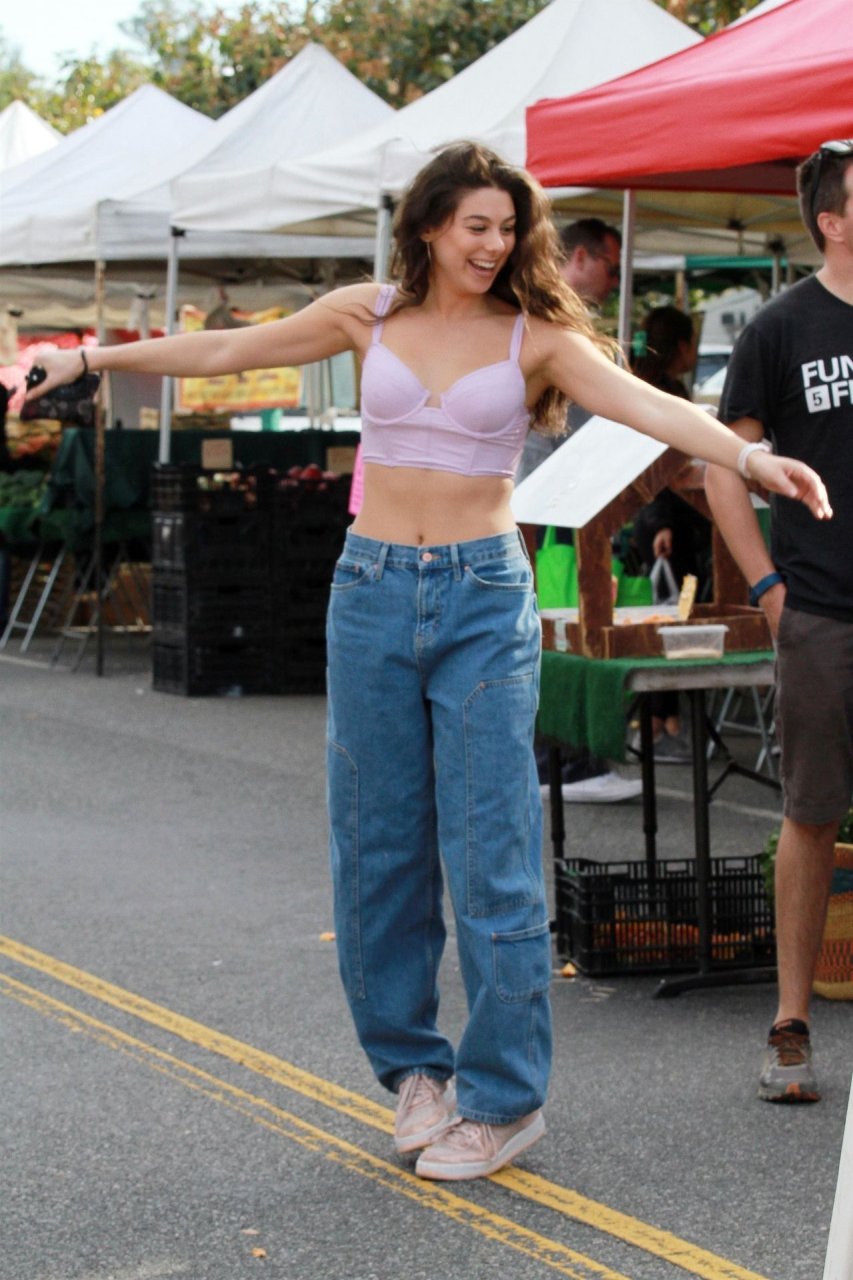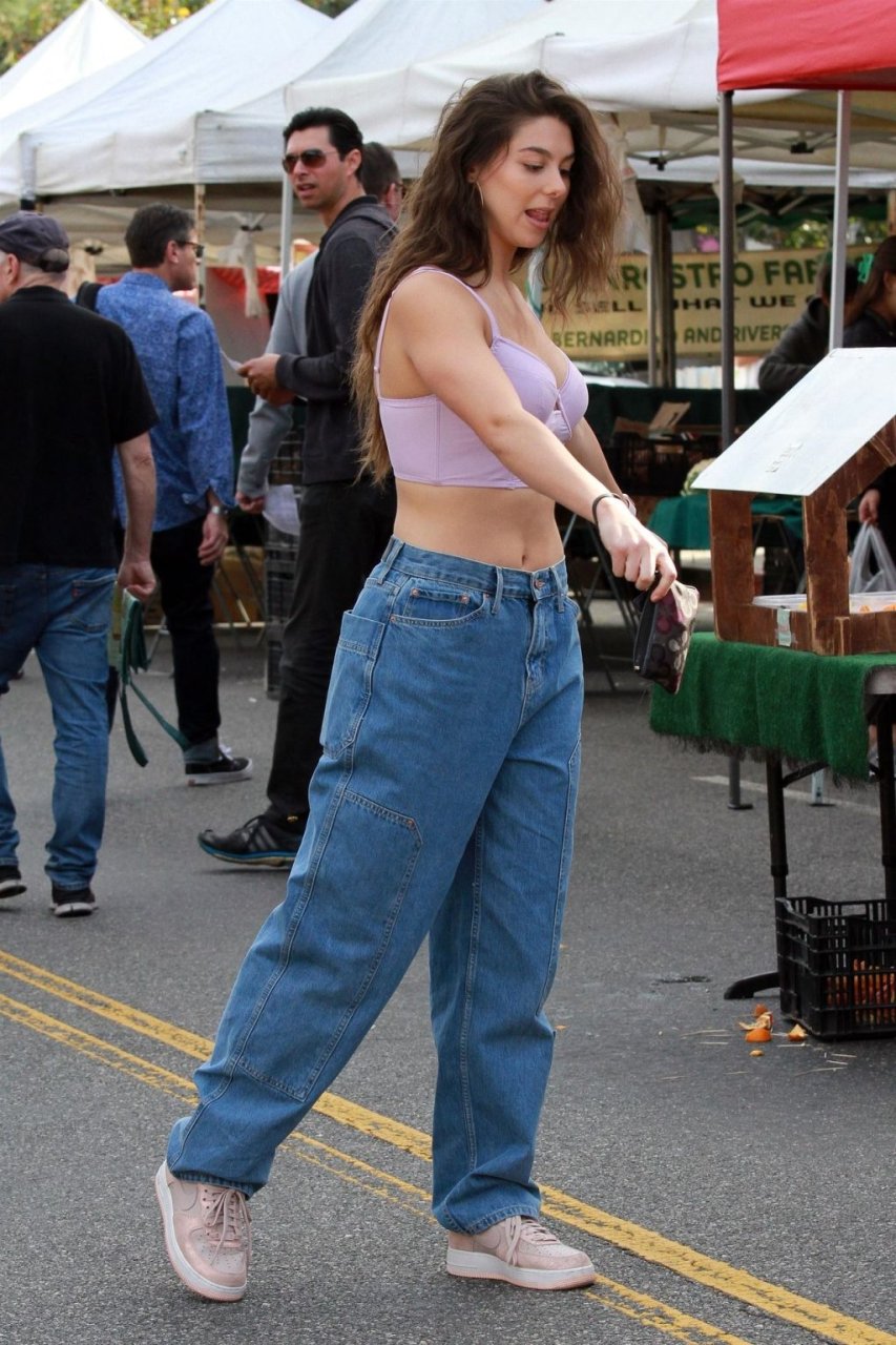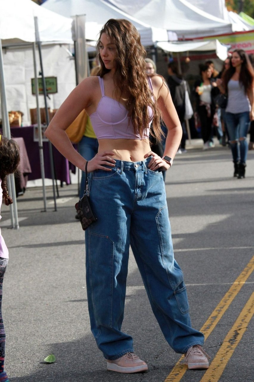 A atriz Kira Kosarin exibe seu físico em forma enquanto faz compras no Farmer’s Market em Studio City, 16/12/2018. Kira está ótima com um top de sutiã corset lilás, jeans de perna larga e tênis.