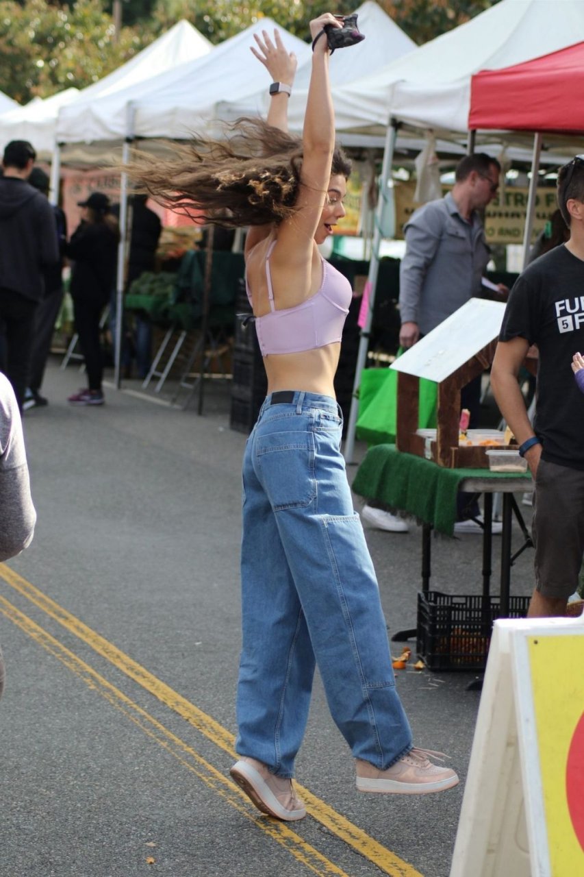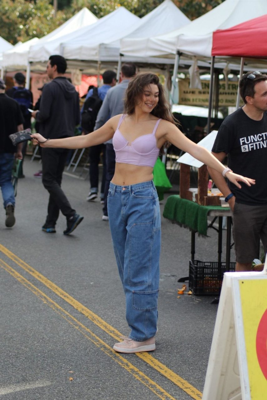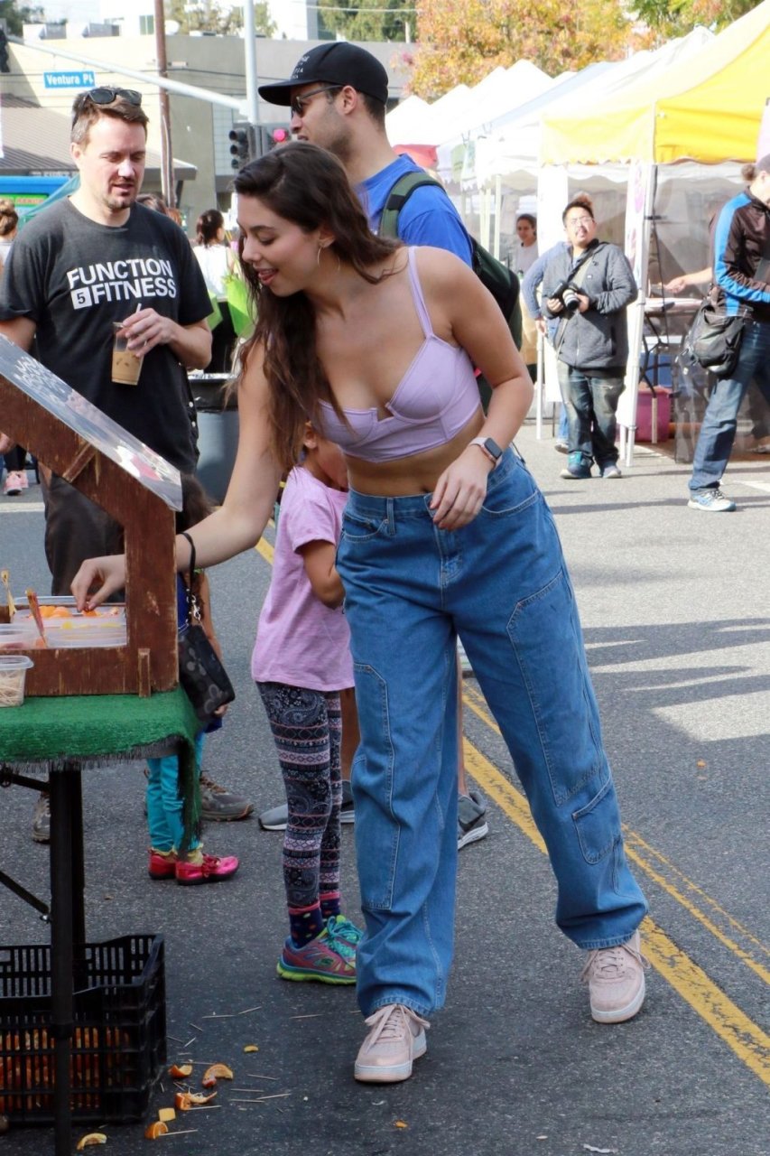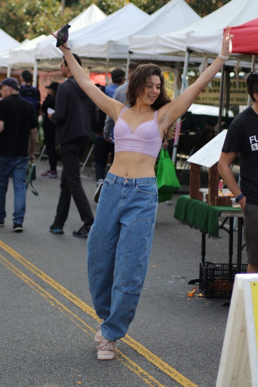 A atriz Kira Kosarin exibe seu físico em forma enquanto faz compras no Farmer’s Market em Studio City, 16/12/2018. Kira está ótima com um top de sutiã corset lilás, jeans de perna larga e tênis.