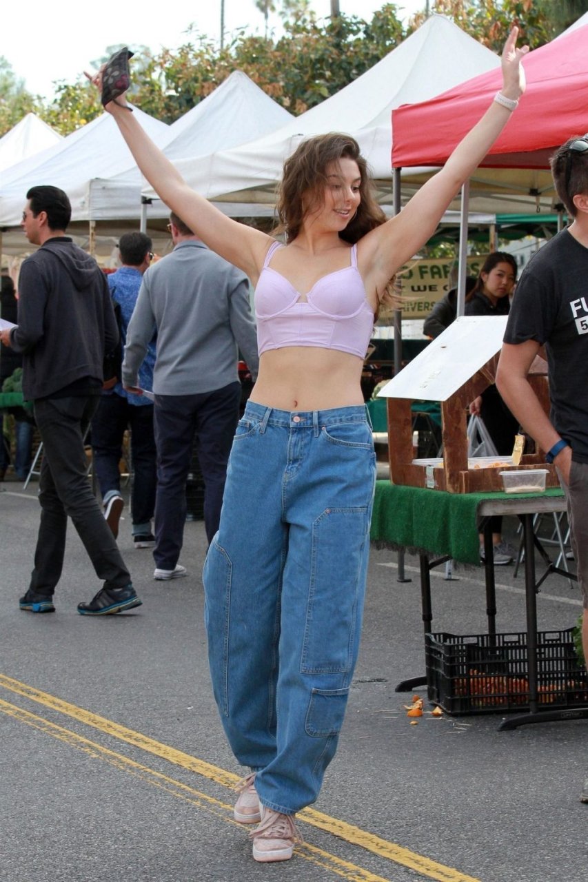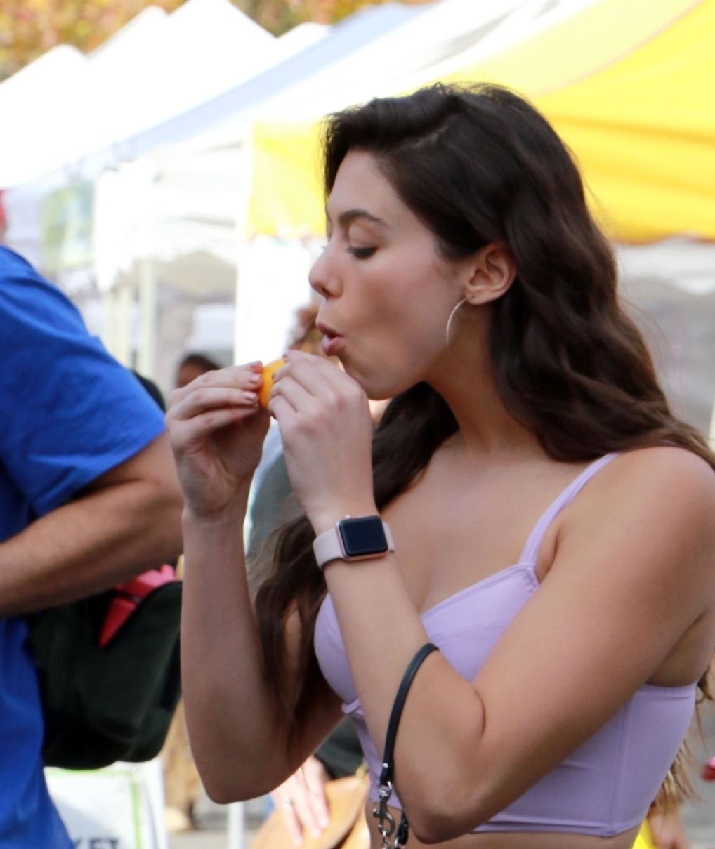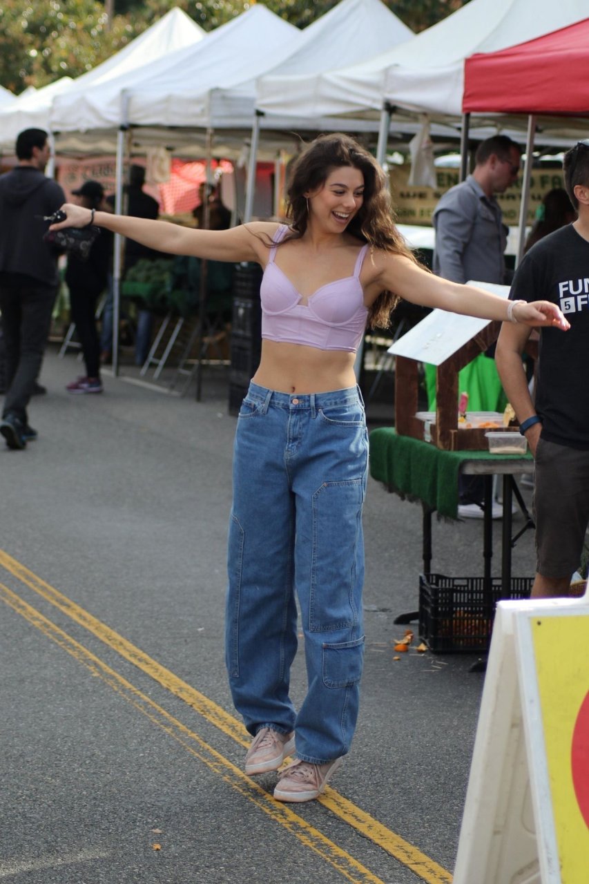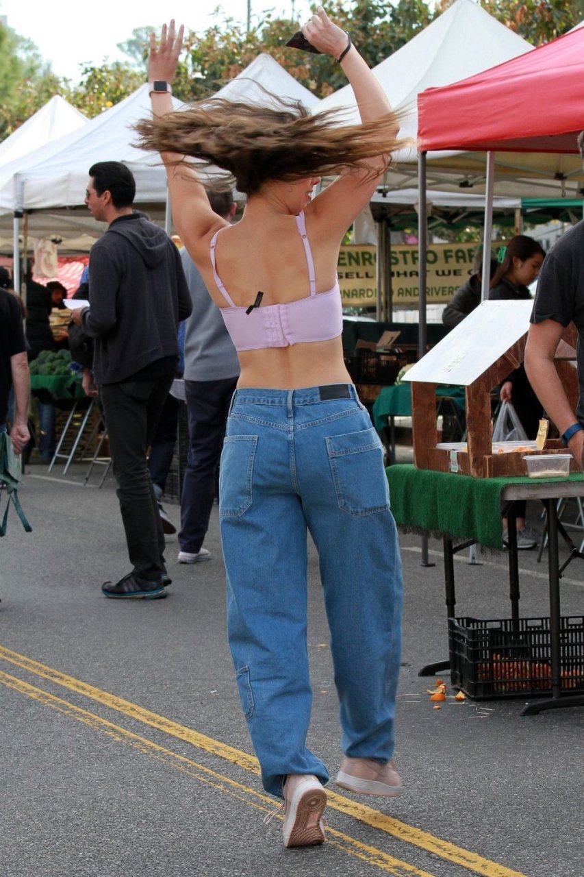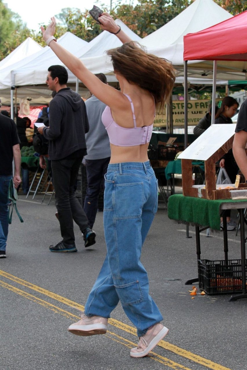 A atriz Kira Kosarin exibe seu físico em forma enquanto faz compras no Farmer’s Market em Studio City, 16/12/2018. Kira está ótima com um top de sutiã corset lilás, jeans de perna larga e tênis.