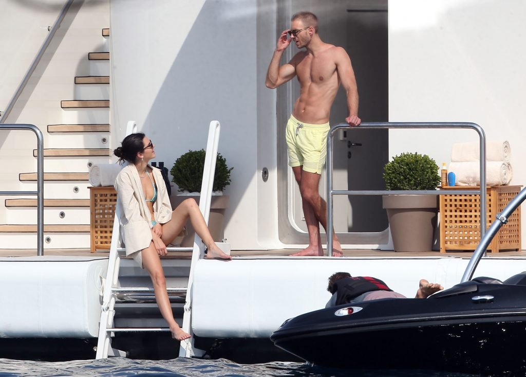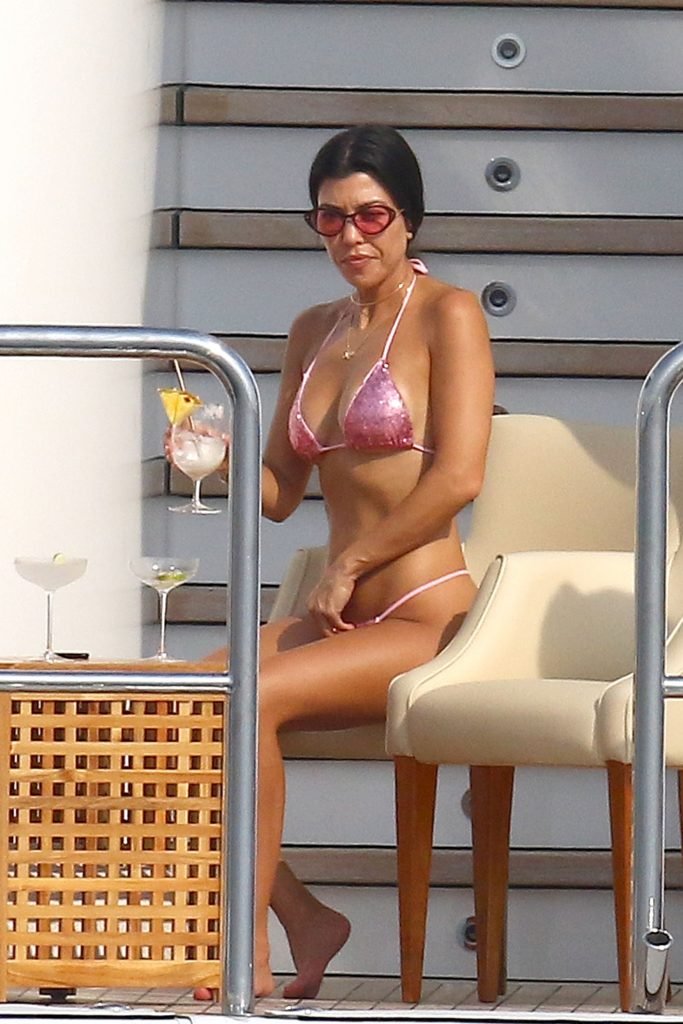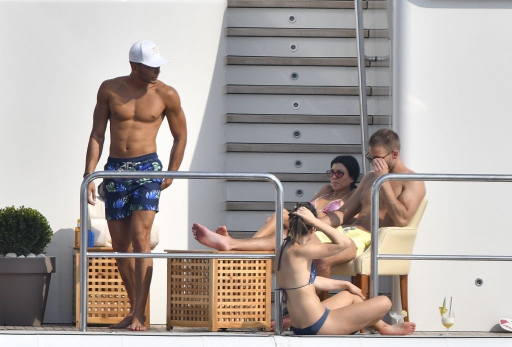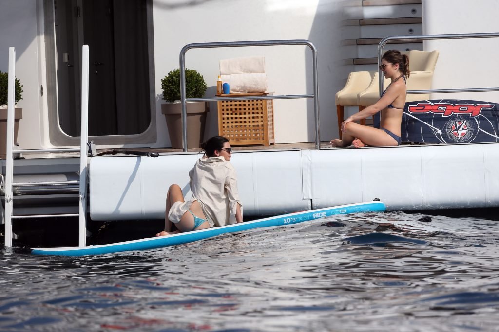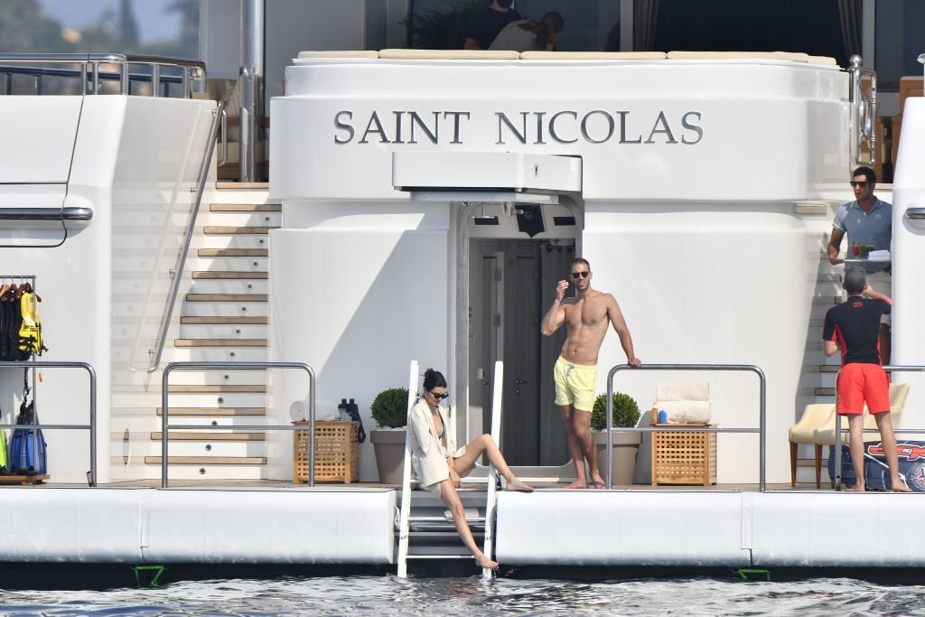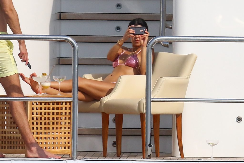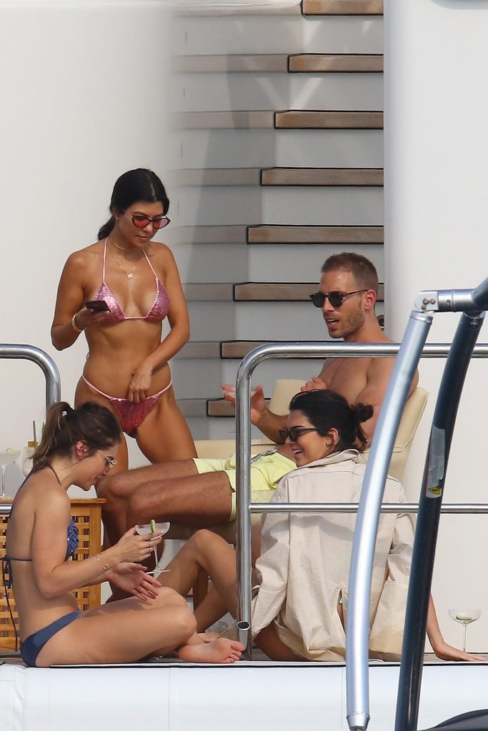 Kourtney Kardashian e Kendall Jenner aproveitam um bom momento em um iate em Antibes durante o festival de cinema de Cannes, 25/05/2017. Kourtney Kardashian é uma estrela americana do programa ‘Keeping Up with the Kardashians’, socialite, modelo. Idade: 38 anos.