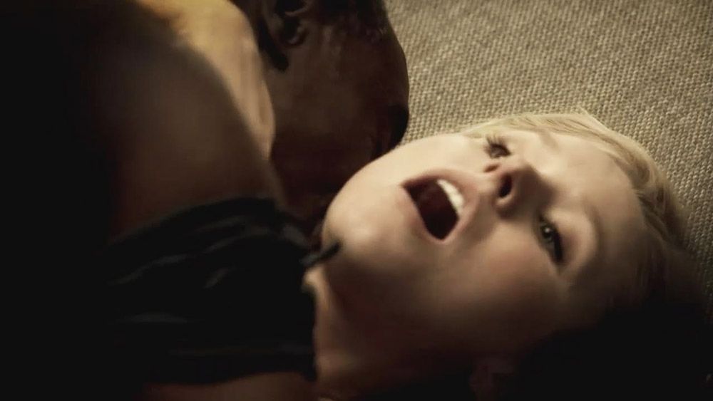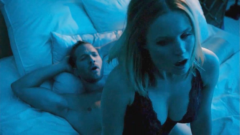 Here is Kristen Bell showing ass and cleavage in black lingerie. She rides a guy in reverse and reaches back to shove her hand in his mouth. They have sex, as she is bouncing in his lap as he lies on a bed.