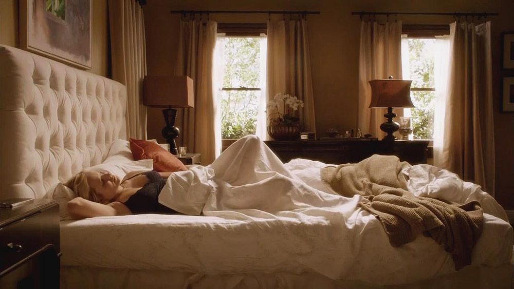 Kristen Bell is showing butt and tits as waking up in bed in a black nightie. It shows some cleavage as she reaches her hand down under the sheets and begins to masturbate.