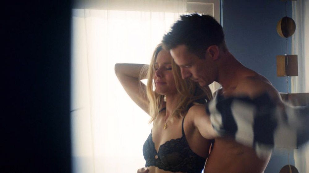 Kristen Bell being pushed up against a wall, kissing a guy passionately. They’re seen having sex on a bed with him on top of her.