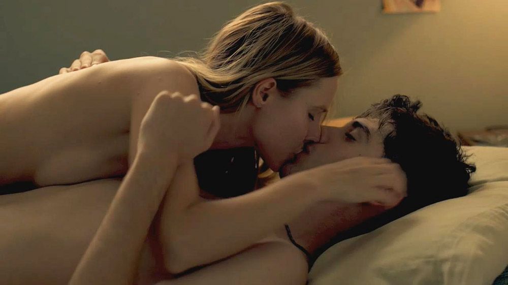 Then Kristen Bell is seen making out with a guy again, showing her boobs and ass in porn. They make their way into a bedroom. She then removes her bra, and we see her boobs as she and the guy move onto the bed and have sex with Kristen underneath him.