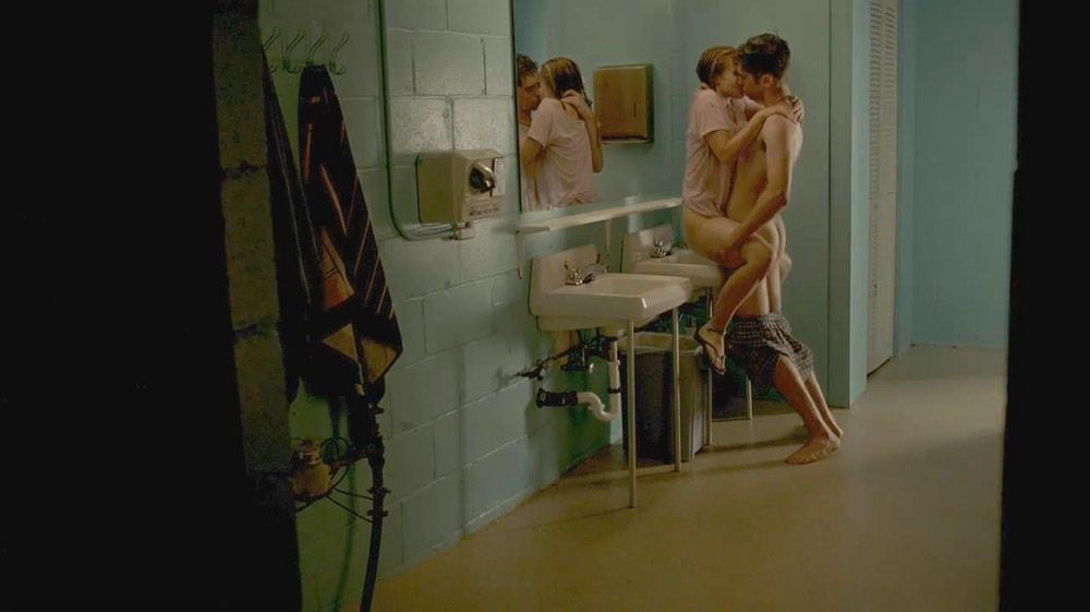 Kristen Bell, with no panties, is making out with a guy in a bathroom. The guy is shoving his hand down her and then slides her panties off entirely. she is showing her bare butt from the side. She sits on the edge of a sink, and the guy stands between her legs and picks her up as he has sex with her.