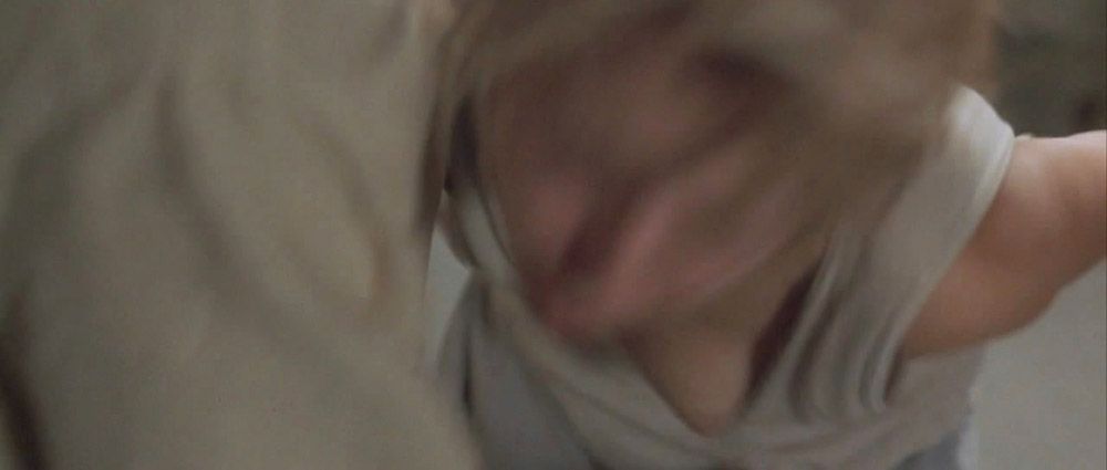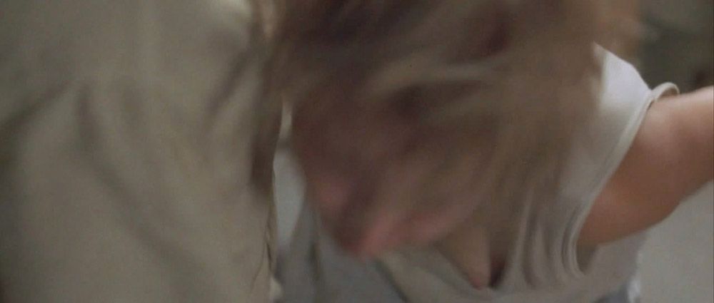 Now we can see Kristen Bell doubling over in slow motion. Her breast is popping out of her tank top in the process.