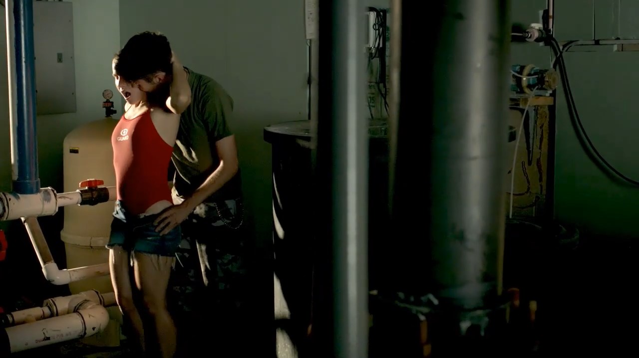 Then Kristen Bell is making out with a guy while undressing and moving toward a bedroom. There Kristen falls back on the bed almost naked as the guy pulls her jeans off. We then see Kristen Bell in her bikini doing a sexy dance.