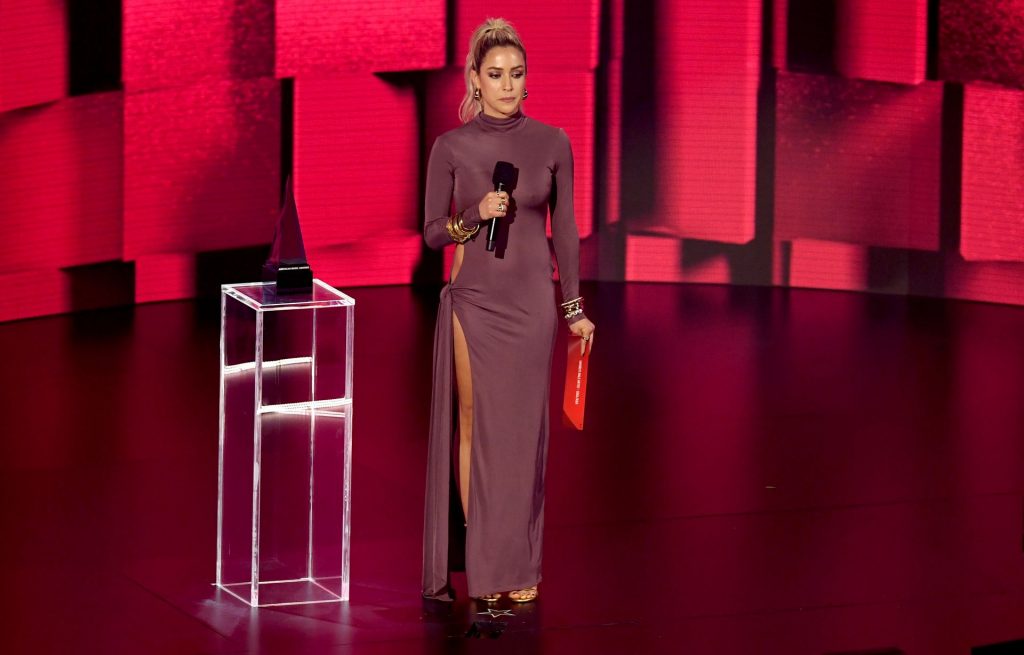 Ela usava um vestido na cor malva com uma fenda alta na coxa, mostrando suas pernas incríveis. Seu conjunto maravilhoso consistia em um vestido Attico, saltos Stuart Weitzman e joias de Grace Lee, Lady Grey, Via Saviene e brincos Uncommon James.