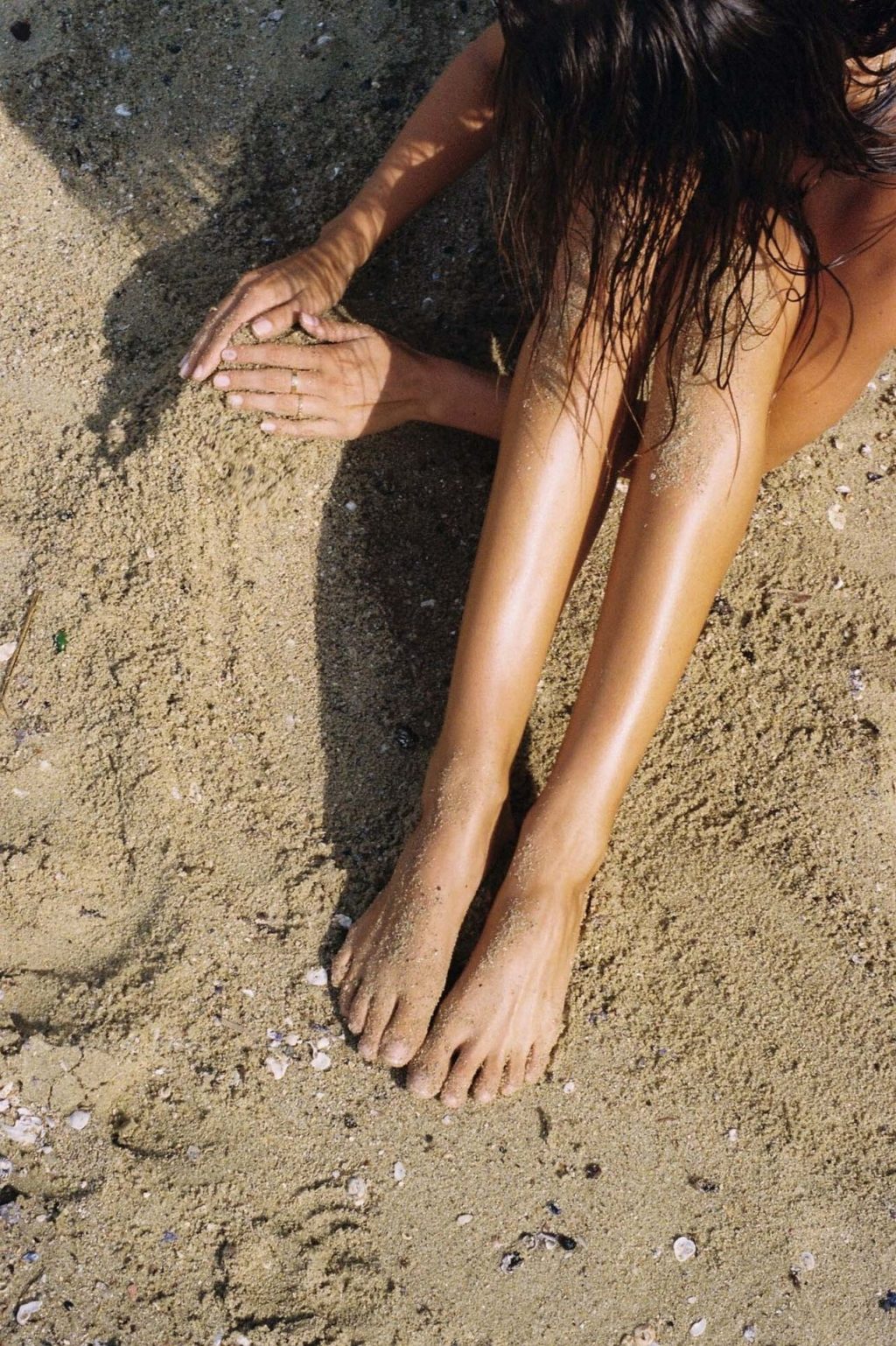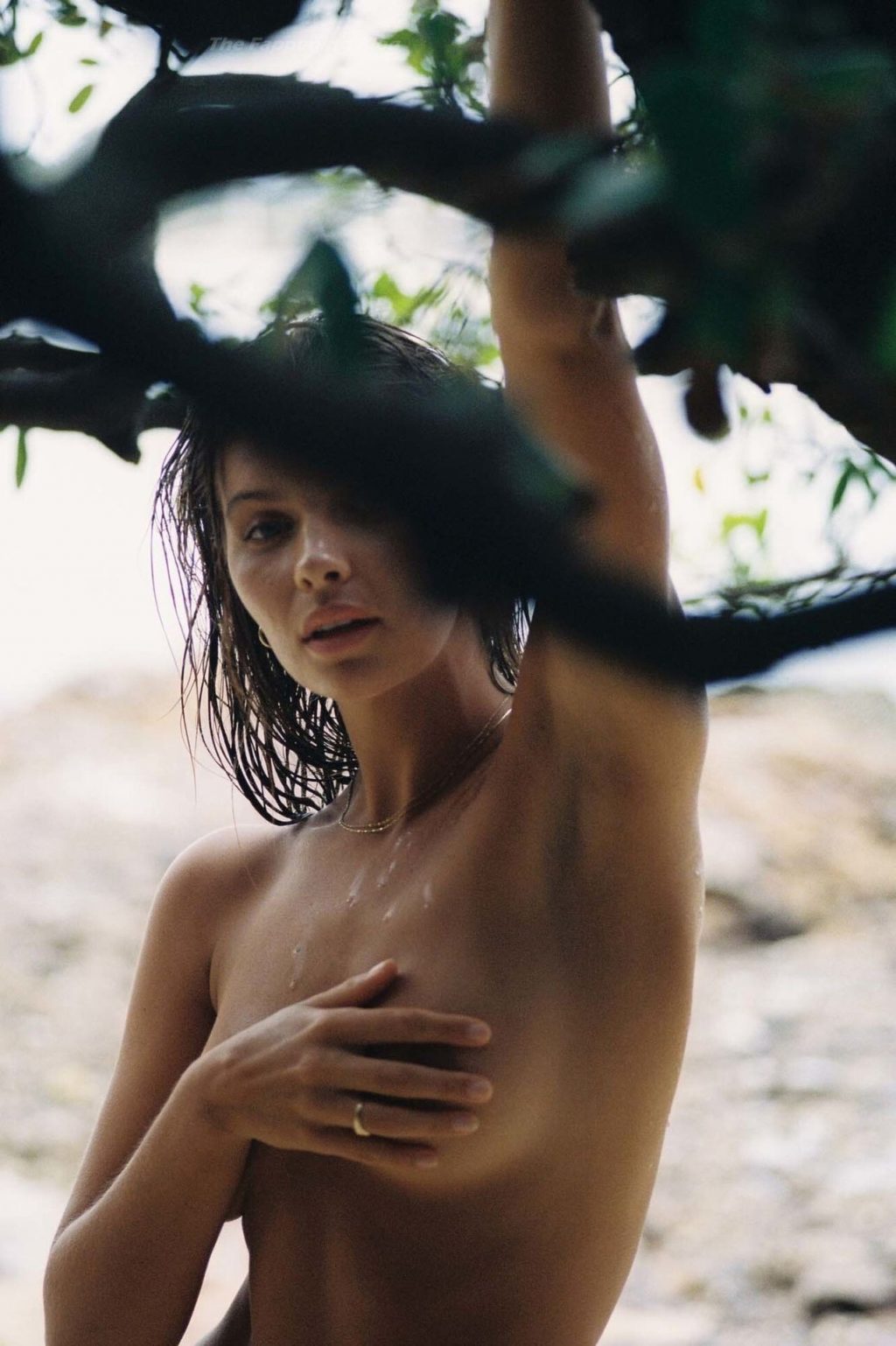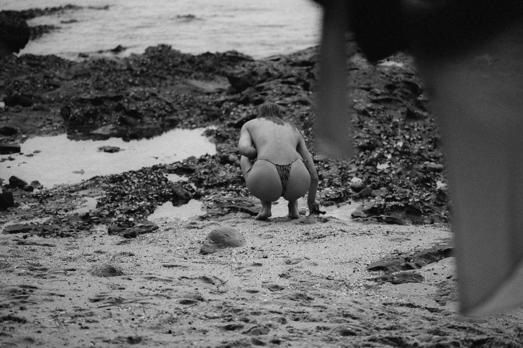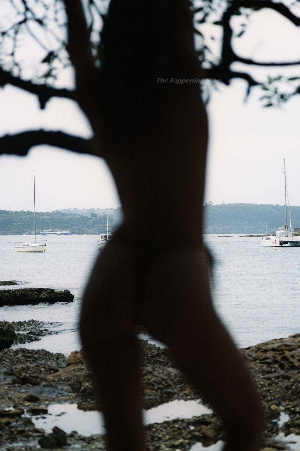 A modelo Kristina Mendonca posa topless e mostra seu biquíni minúsculo na praia em Sydney, Austrália, em um ensaio fotográfico de Jonny Seelenmeyer (2020).