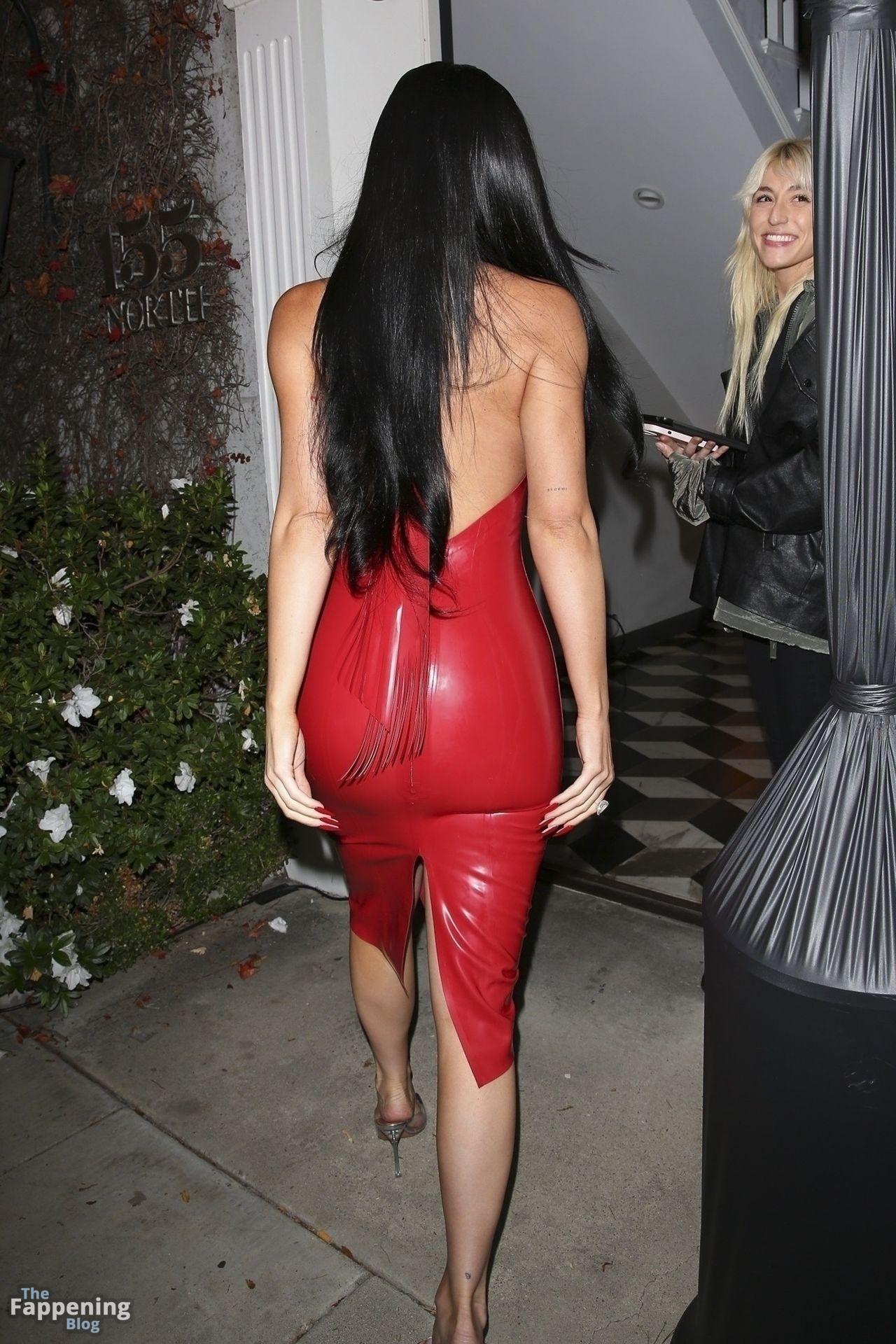 Kylie Jenner compareceu à festa de fim de ano da OBB Media em West Hollywood. A modelo apareceu com um vestido de látex vermelho sem sutiã, fazendo com que seus seios volumosos pressionassem fortemente o material brilhante.