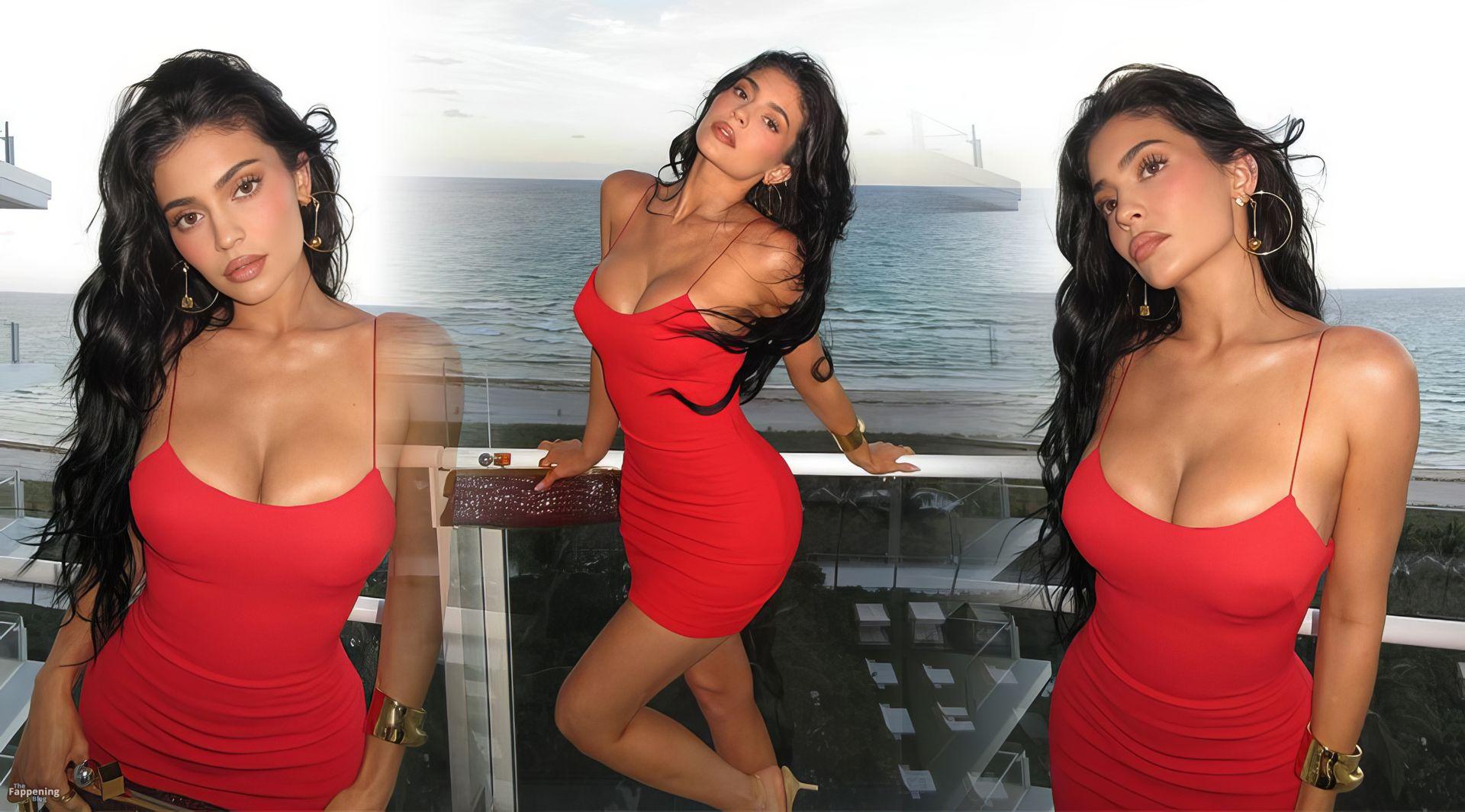 A modelo Kylie Jenner aparece posando com um vestido vermelho sexy, exibindo um decote generoso para seus seguidores no Insta.