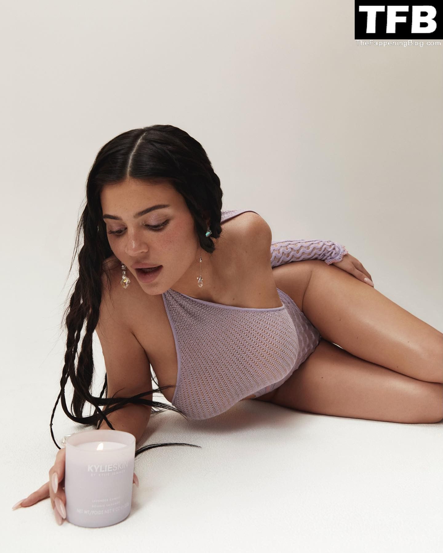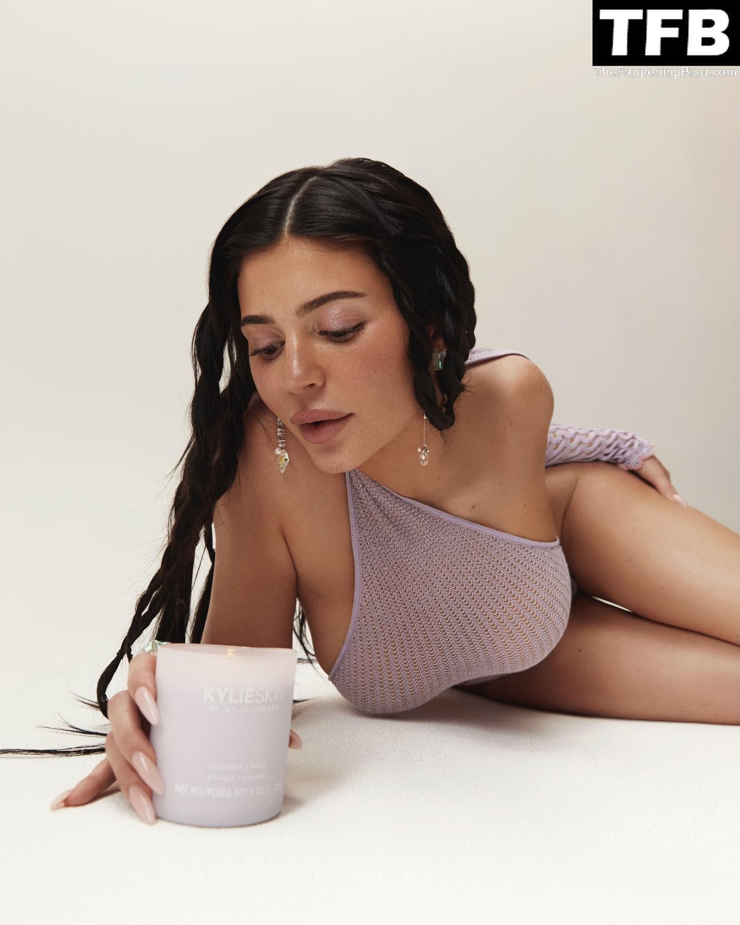 Modelo Kylie Jenner exibe curvas voluptuosas em body revelador enquanto promove sua nova coleção lavanda Kylie Skin (maio de 2022).