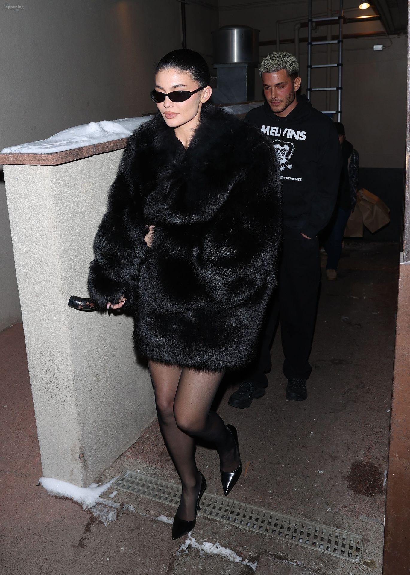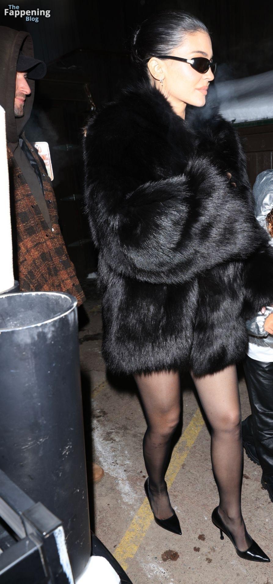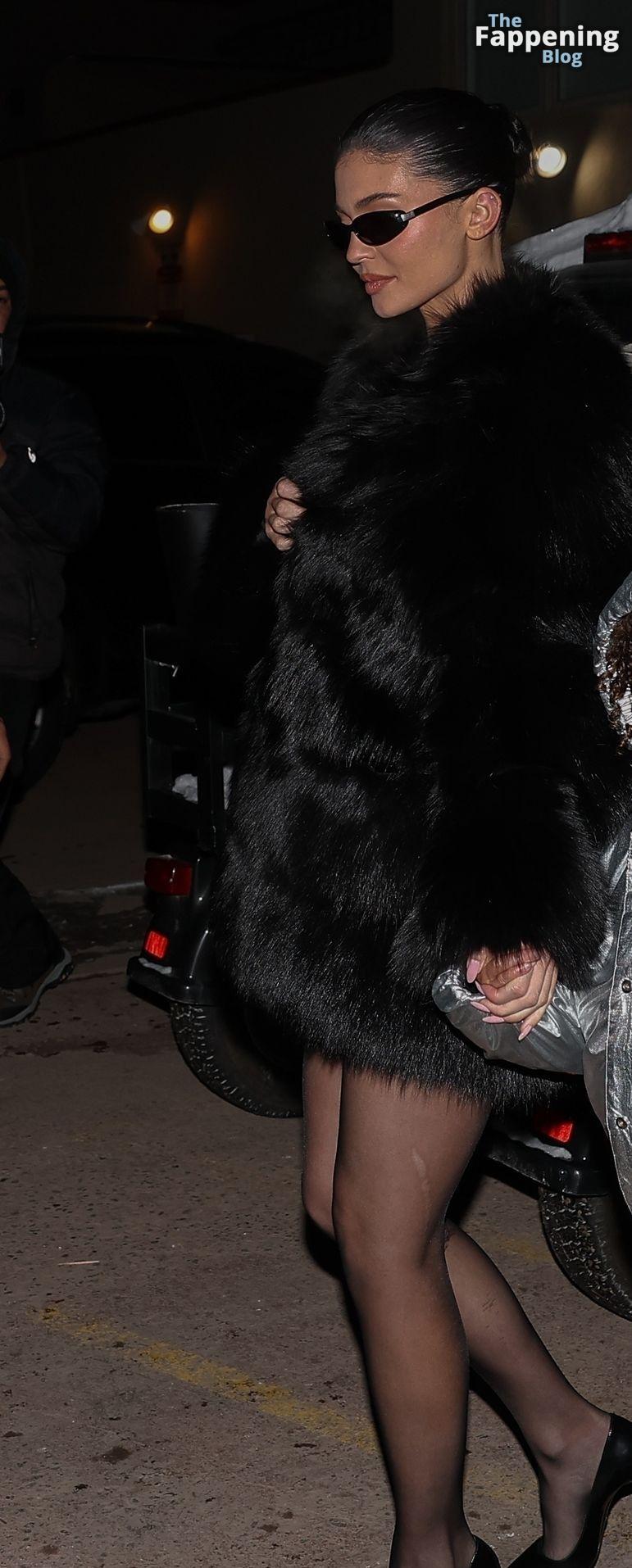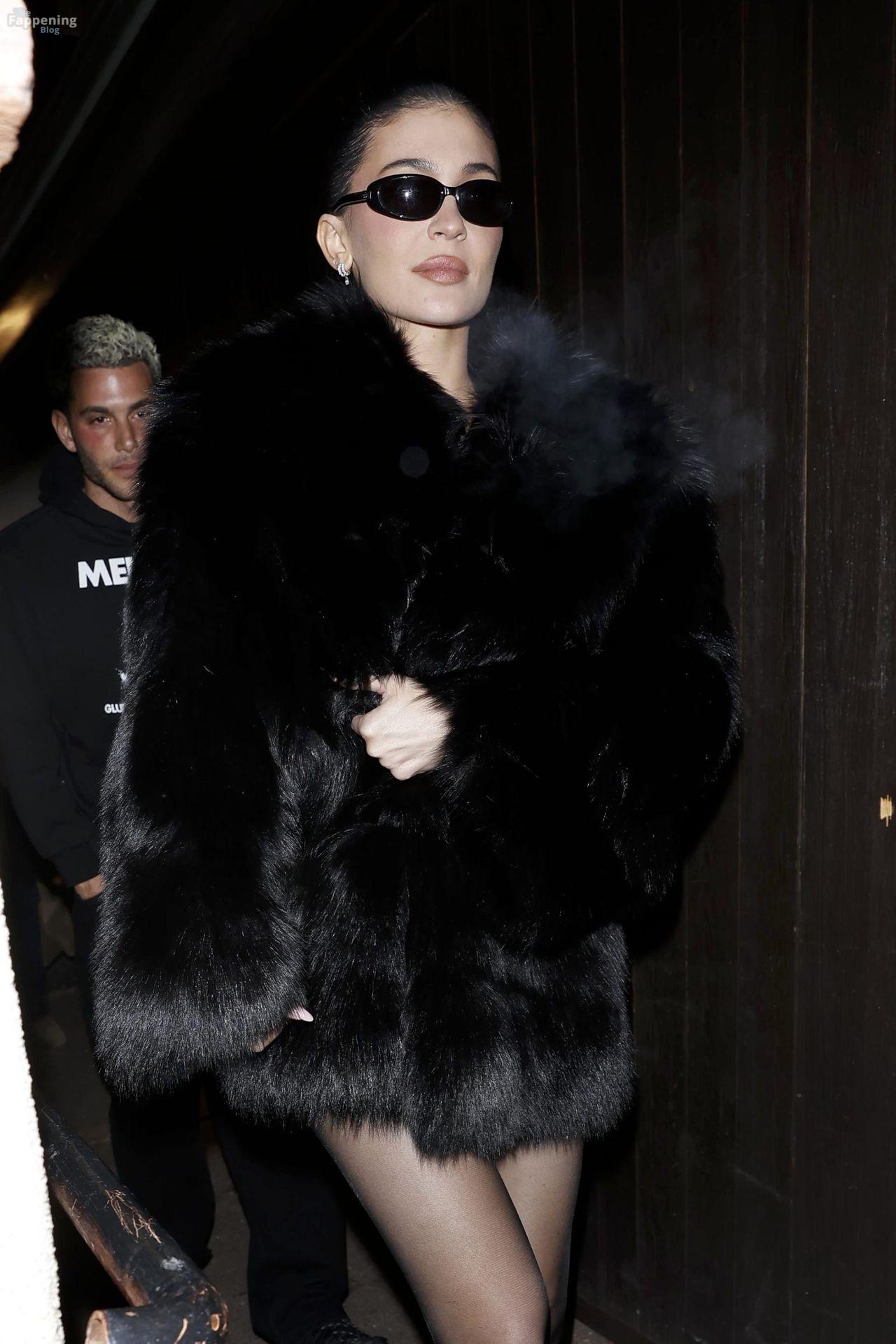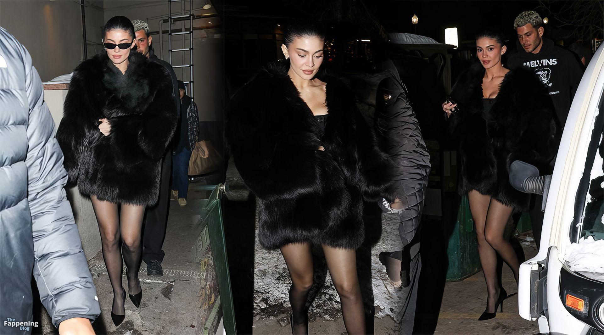 Kylie Jenner, exibindo as pernas e segurando sua filha Stormi, impressiona com um elegante casaco de pele preto ao deixar o jantar no Casa Tua em Aspen.