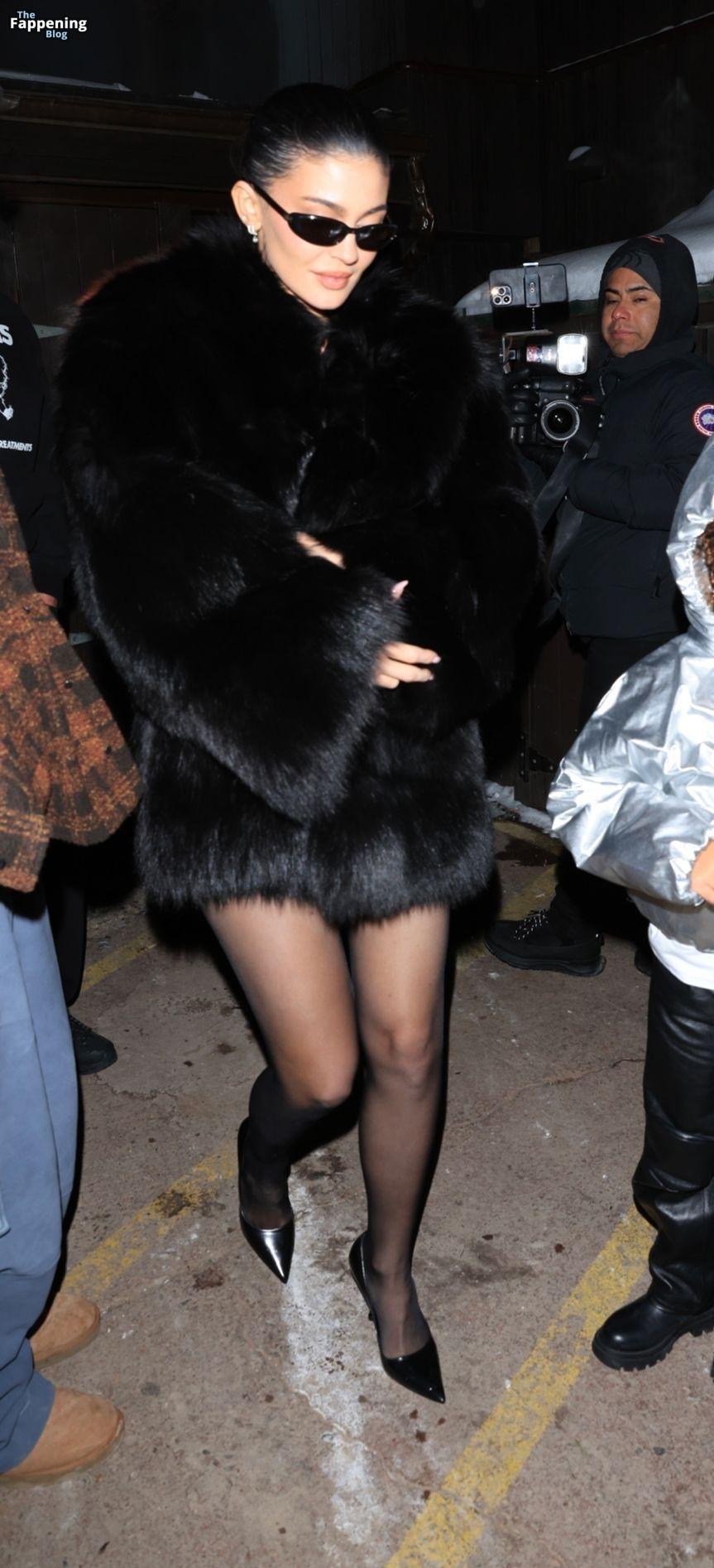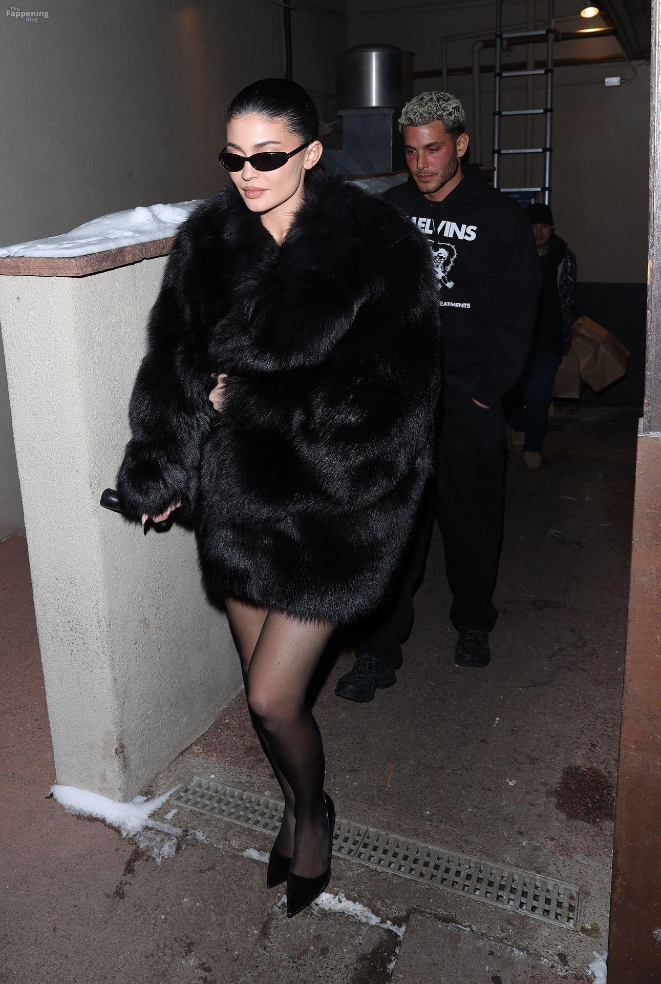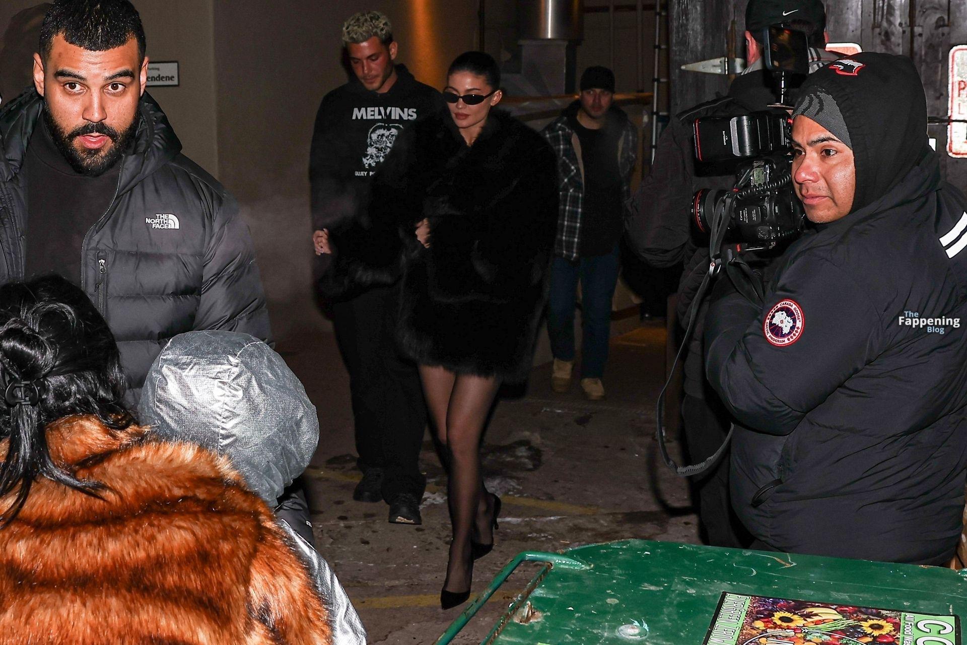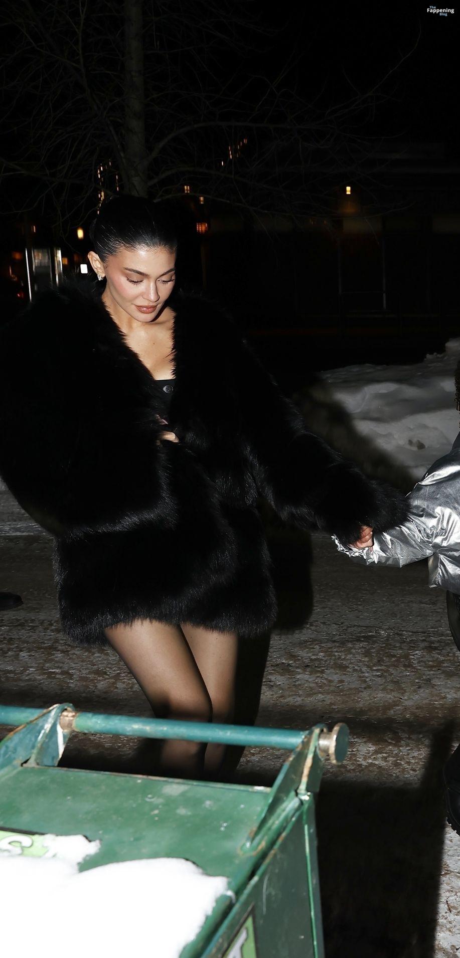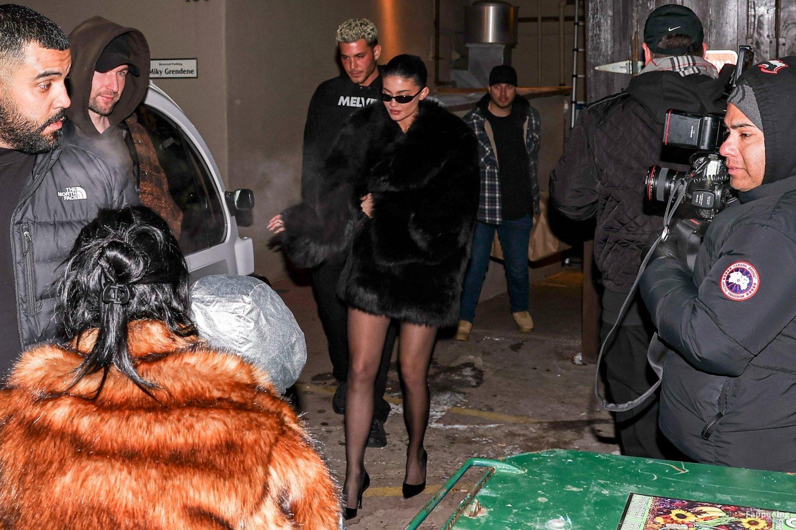 Kylie Jenner, exibindo as pernas e segurando sua filha Stormi, impressiona com um elegante casaco de pele preto ao deixar o jantar no Casa Tua em Aspen.
