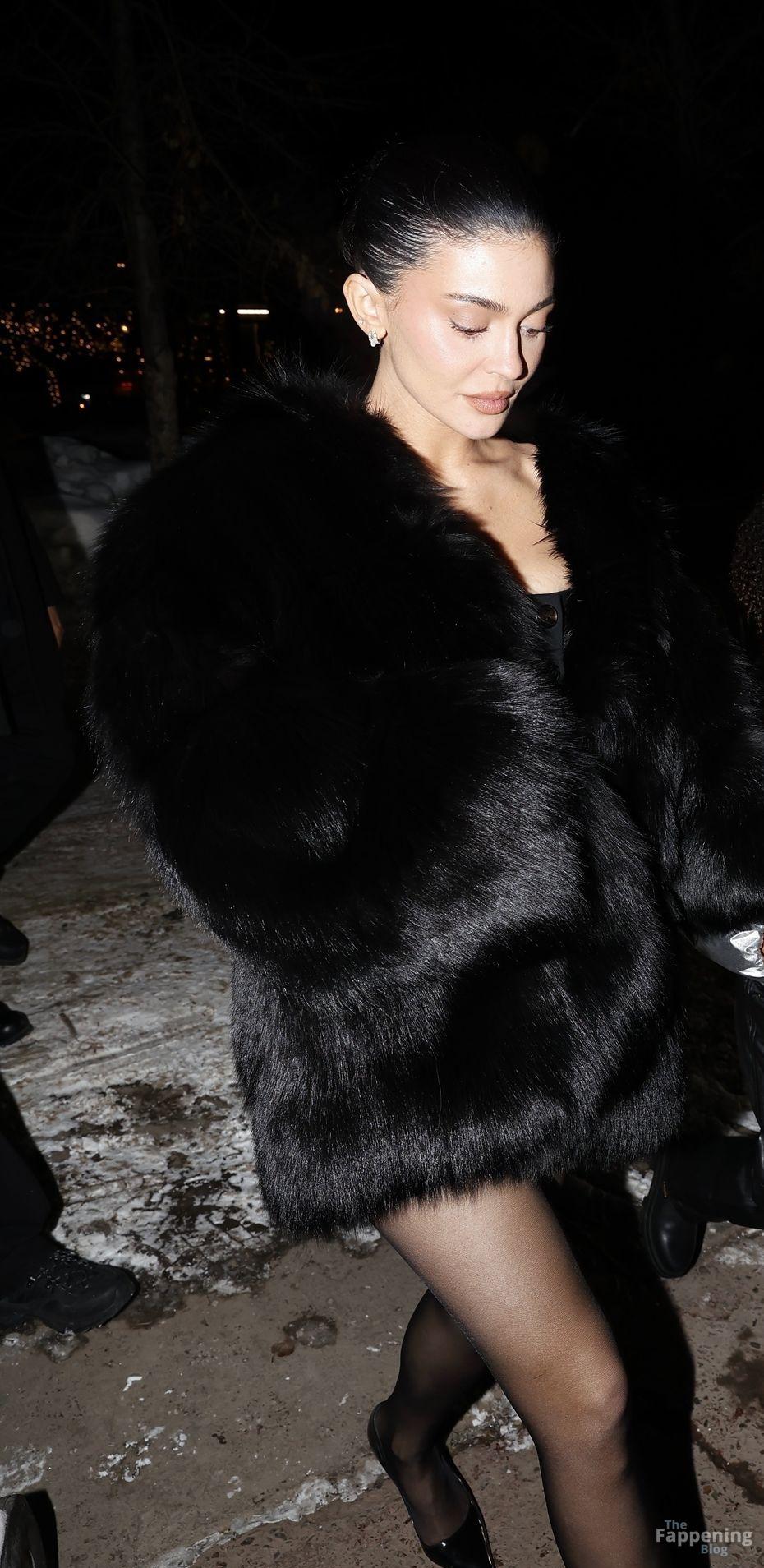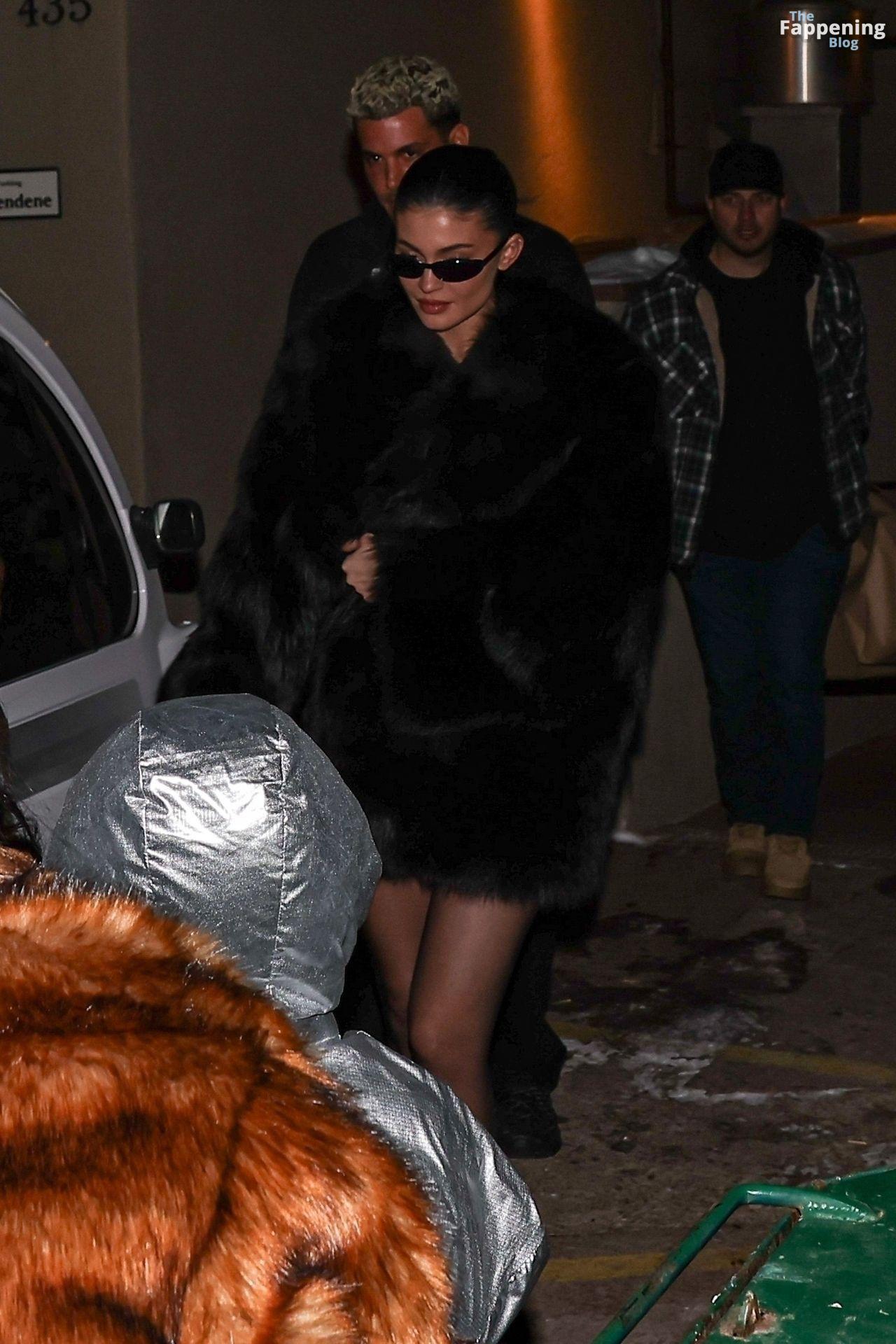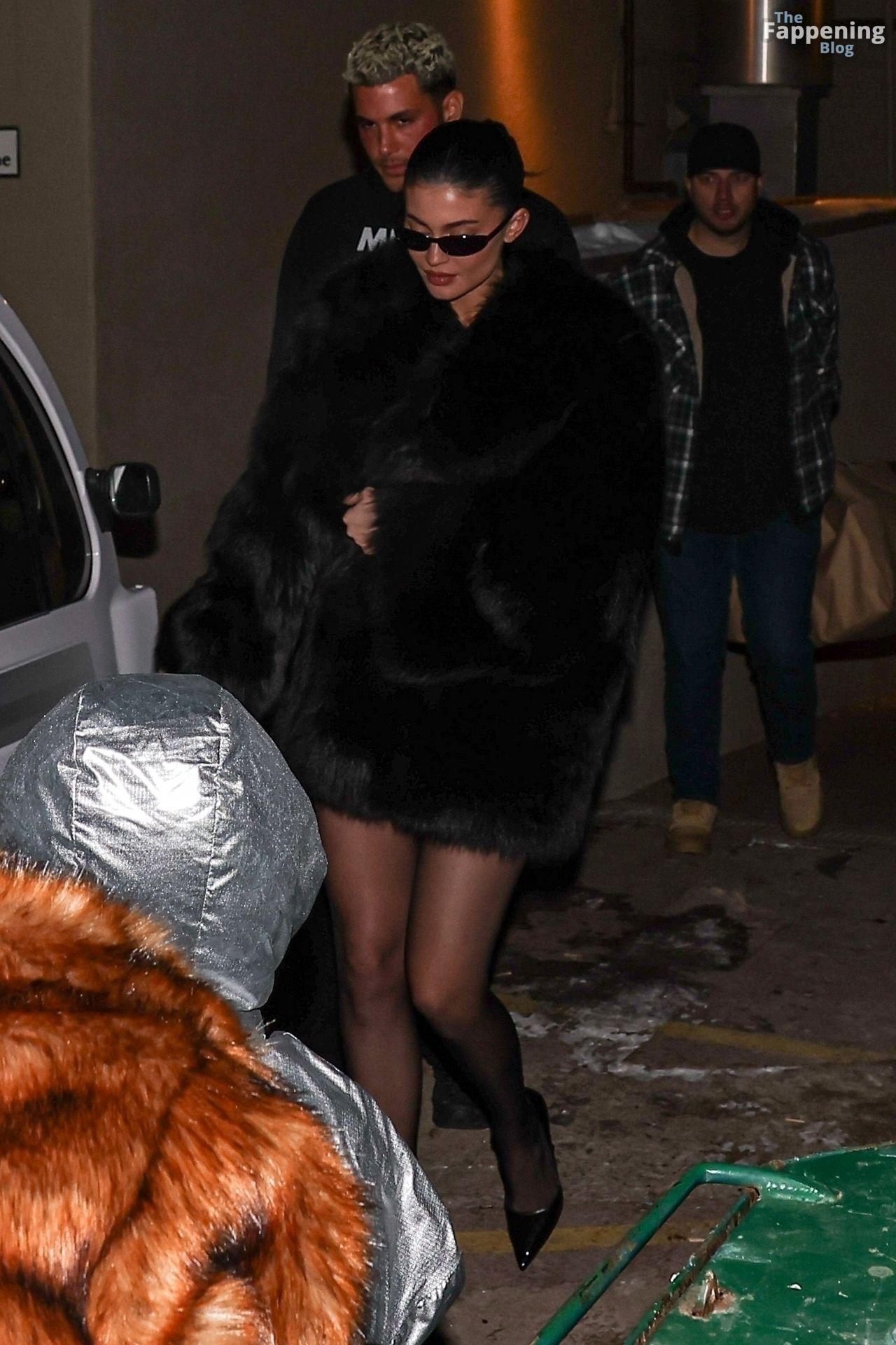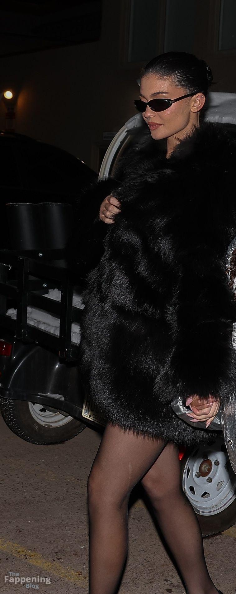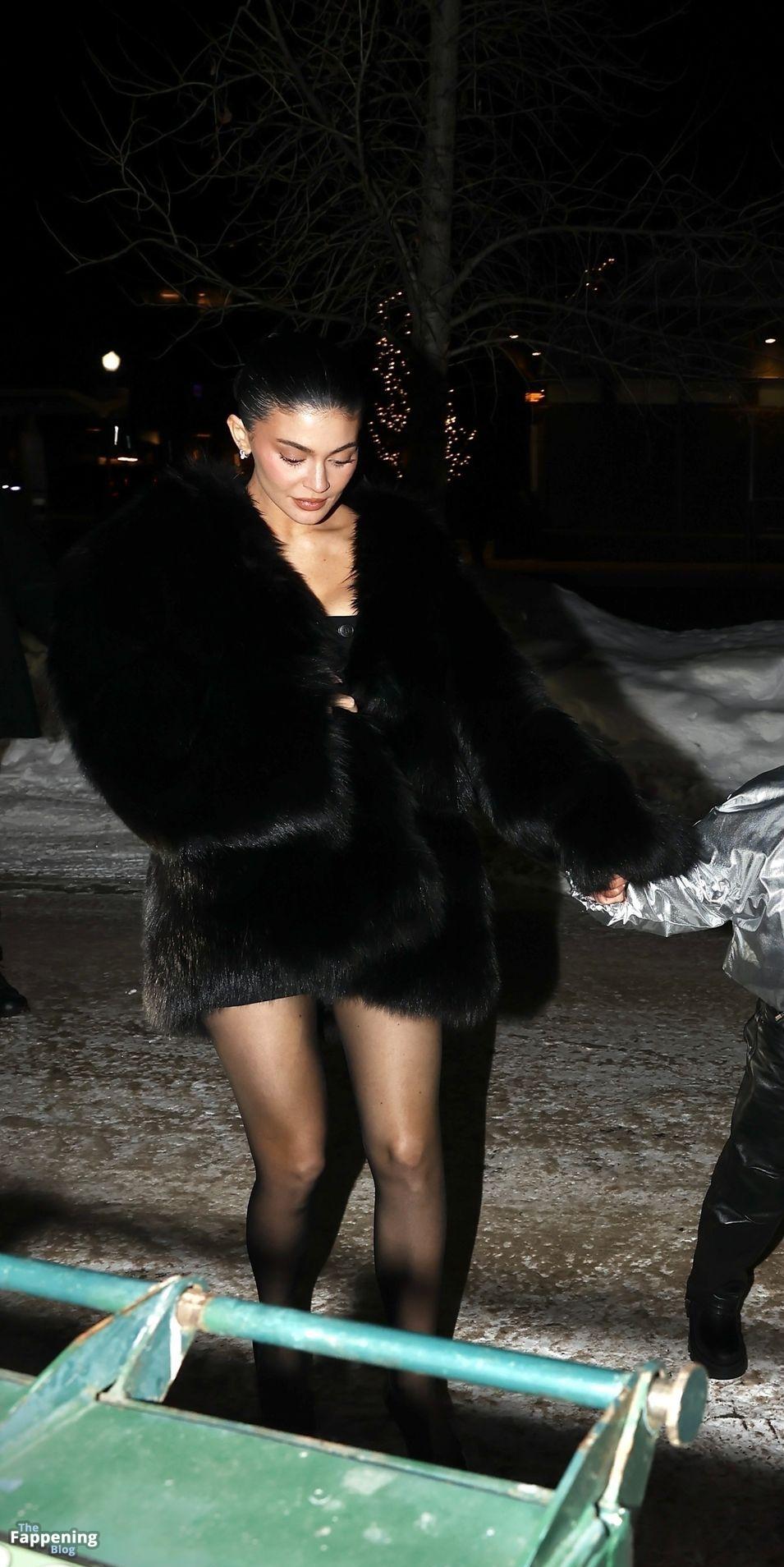 Kylie Jenner, exibindo as pernas e segurando sua filha Stormi, impressiona com um elegante casaco de pele preto ao deixar o jantar no Casa Tua em Aspen.