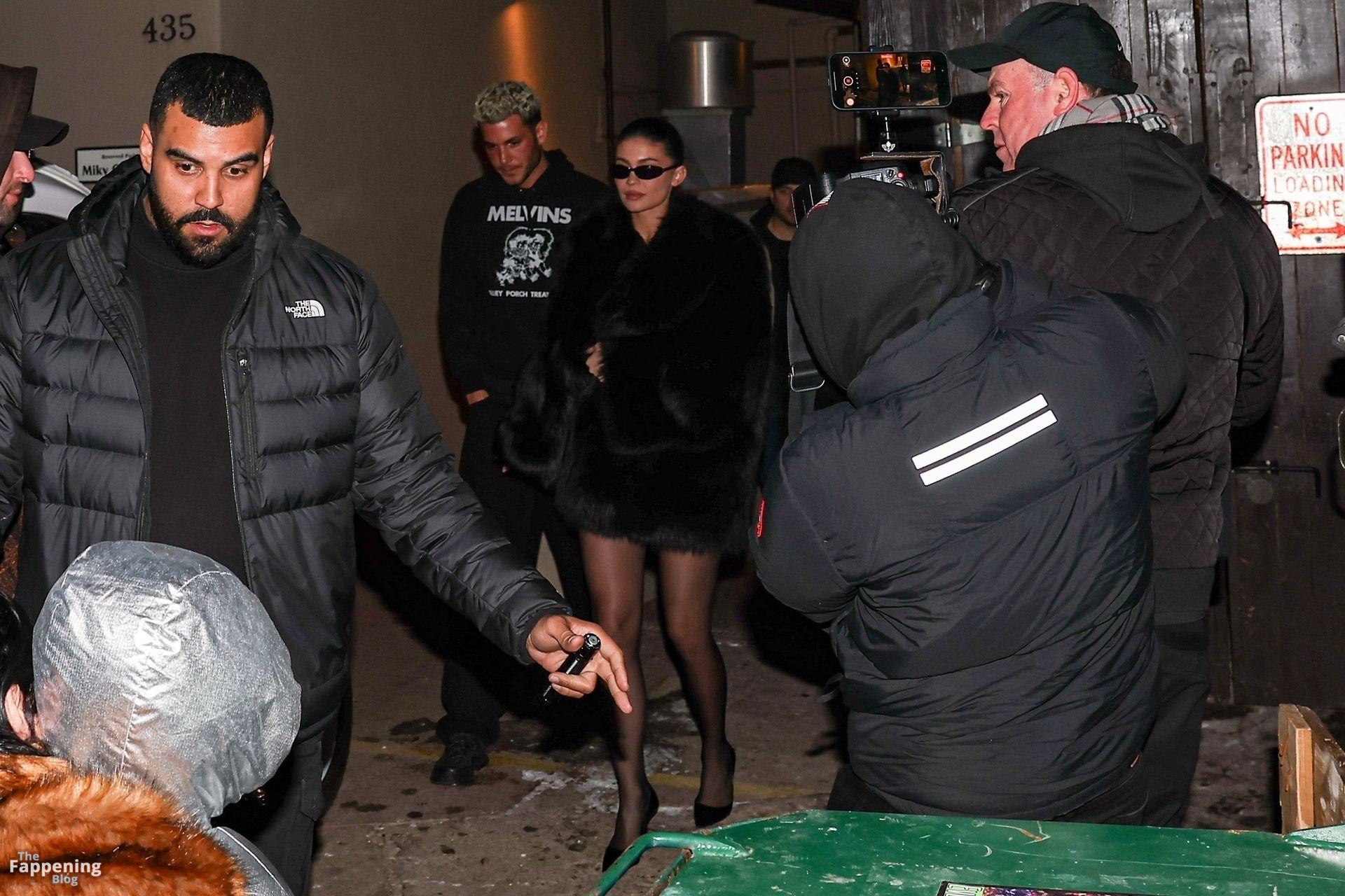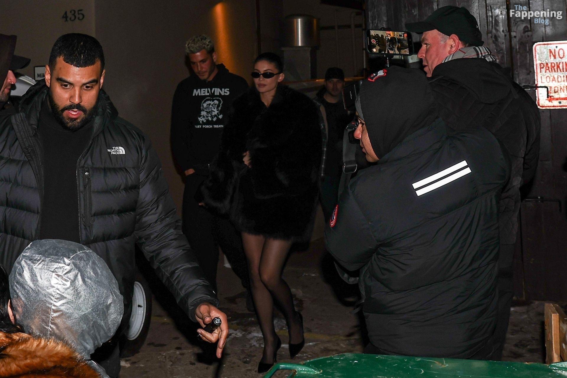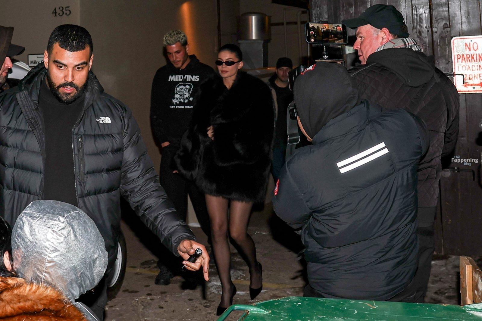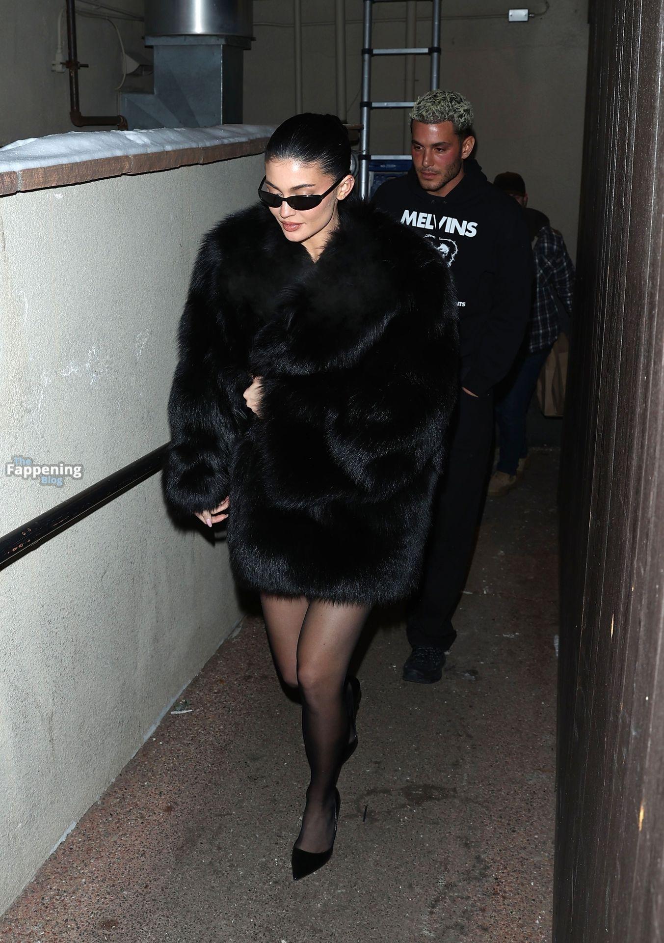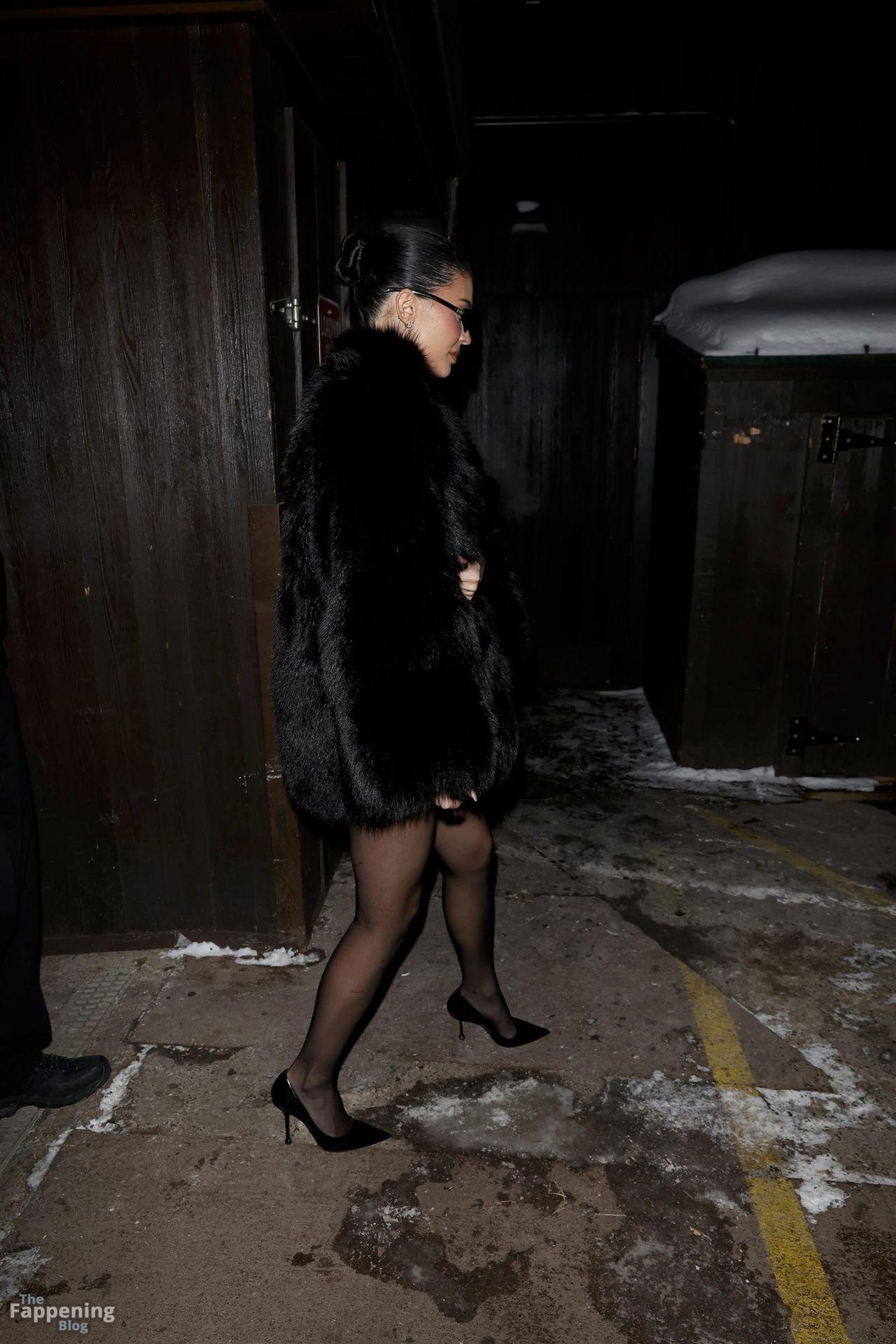 Kylie Jenner, exibindo as pernas e segurando sua filha Stormi, impressiona com um elegante casaco de pele preto ao deixar o jantar no Casa Tua em Aspen.
