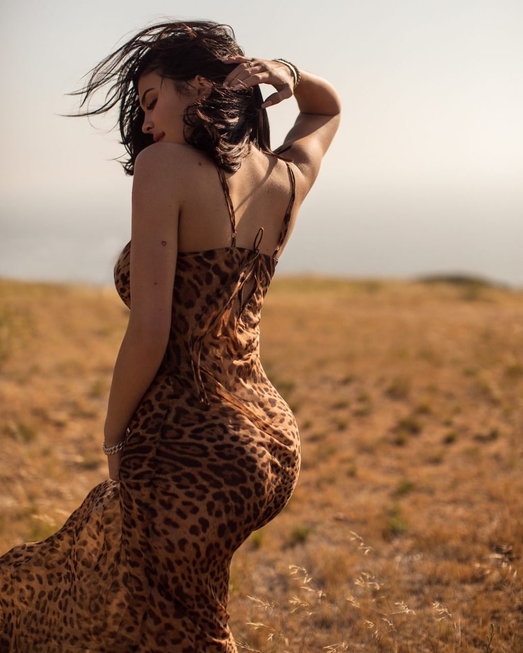 Nas fotos, Kylie Jenner posa com um body azul claro e um vestido estampado ao ar livre. As fotos da Kylie de 20 anos parecem muito delicadas.