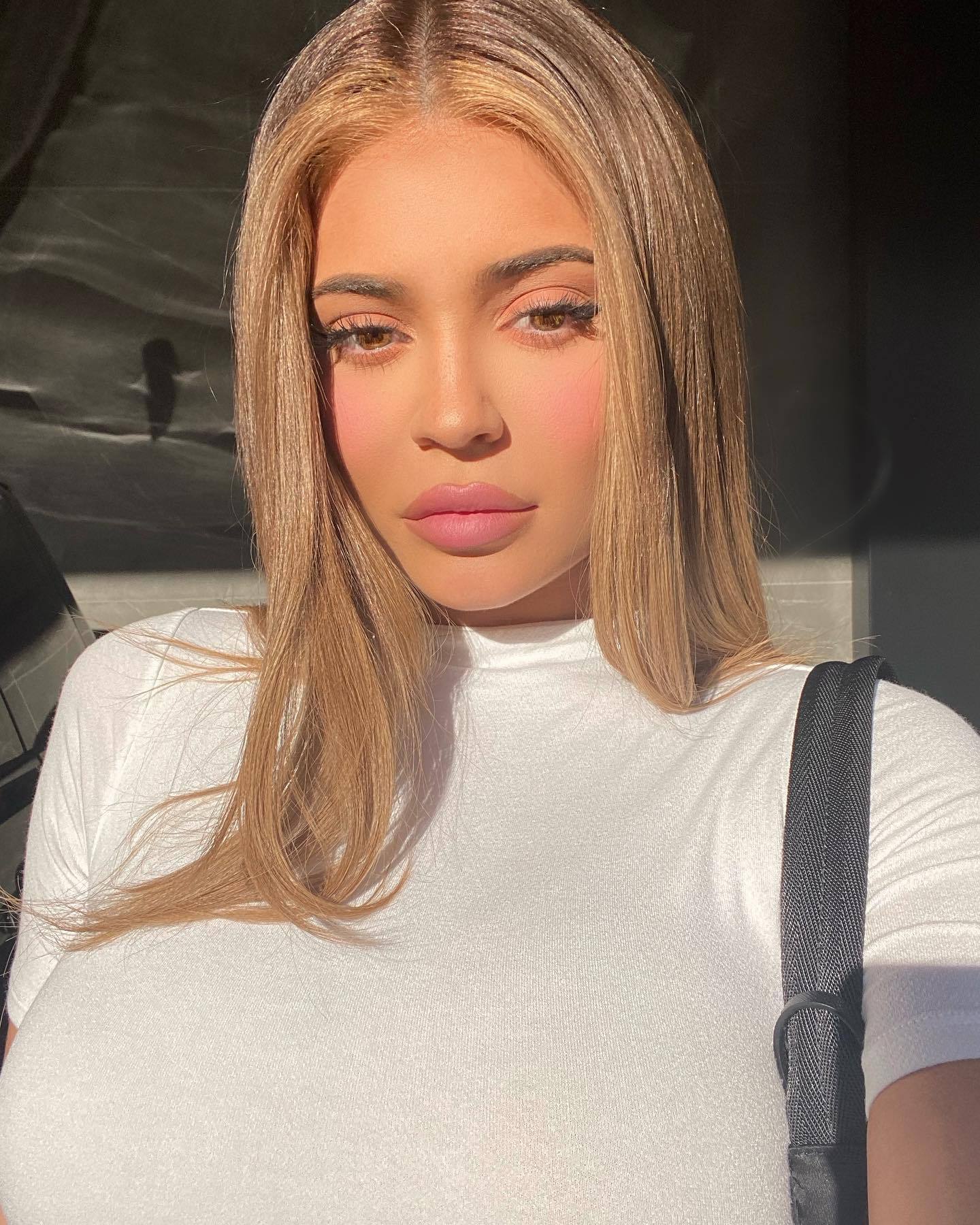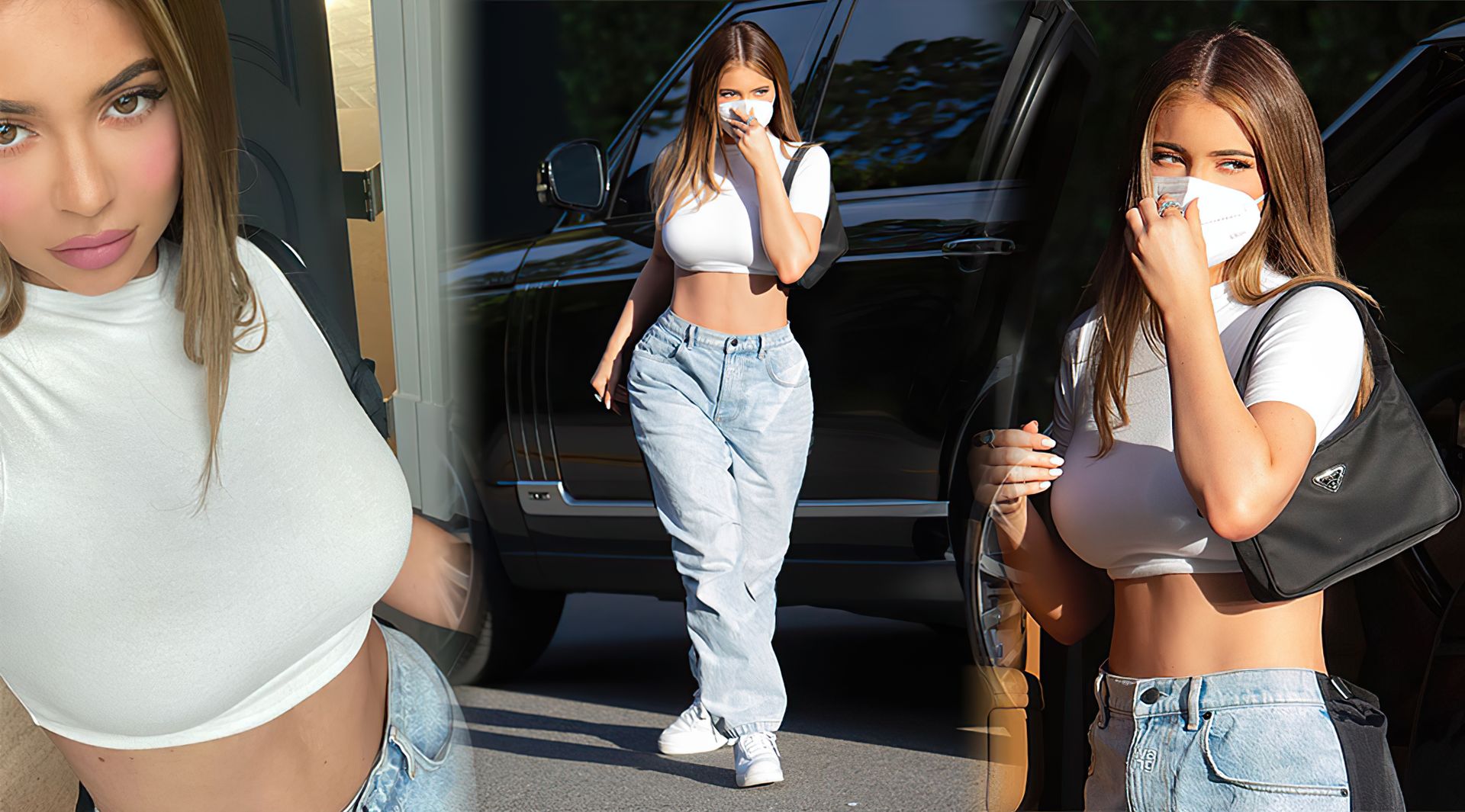 Model Kylie Jenner parece fofa usando jeans e um top cropped branco, exibindo suas curvas sexy em Beverly Hills, 24/04/2020.