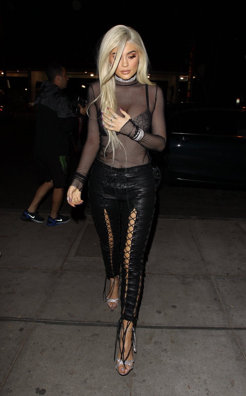 Kylie Jenner loira artificial usa uma blusa preta transparente e calças em West Hollywood, 02/11/2016. Kylie Jenner é uma personalidade da televisão reality americana, socialite, modelo e estilista. Idade: 19 (10 de agosto de 1997).