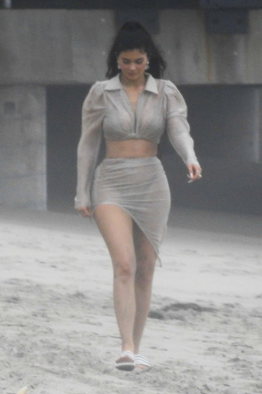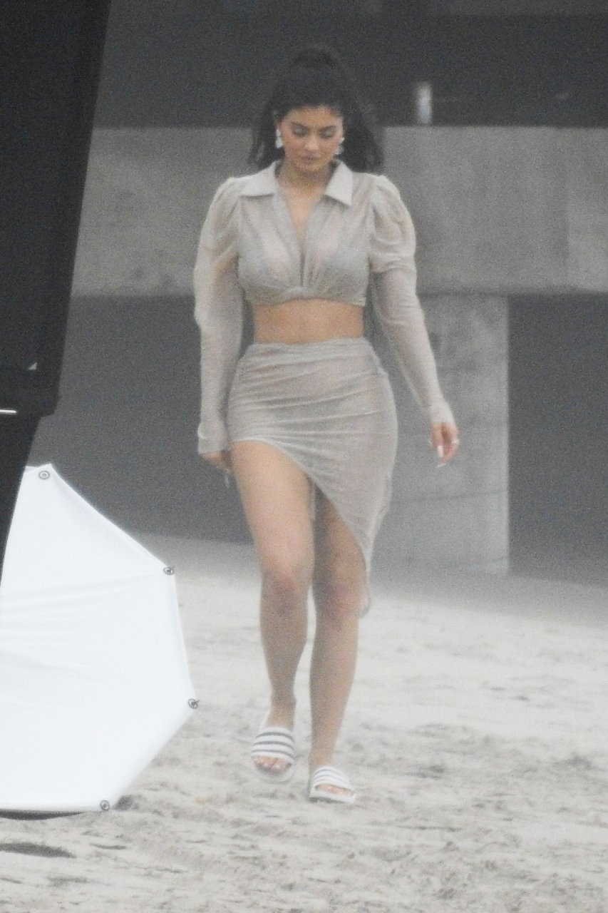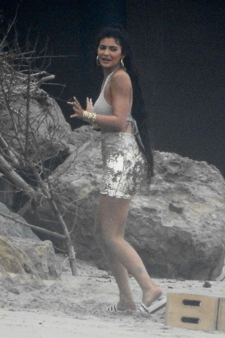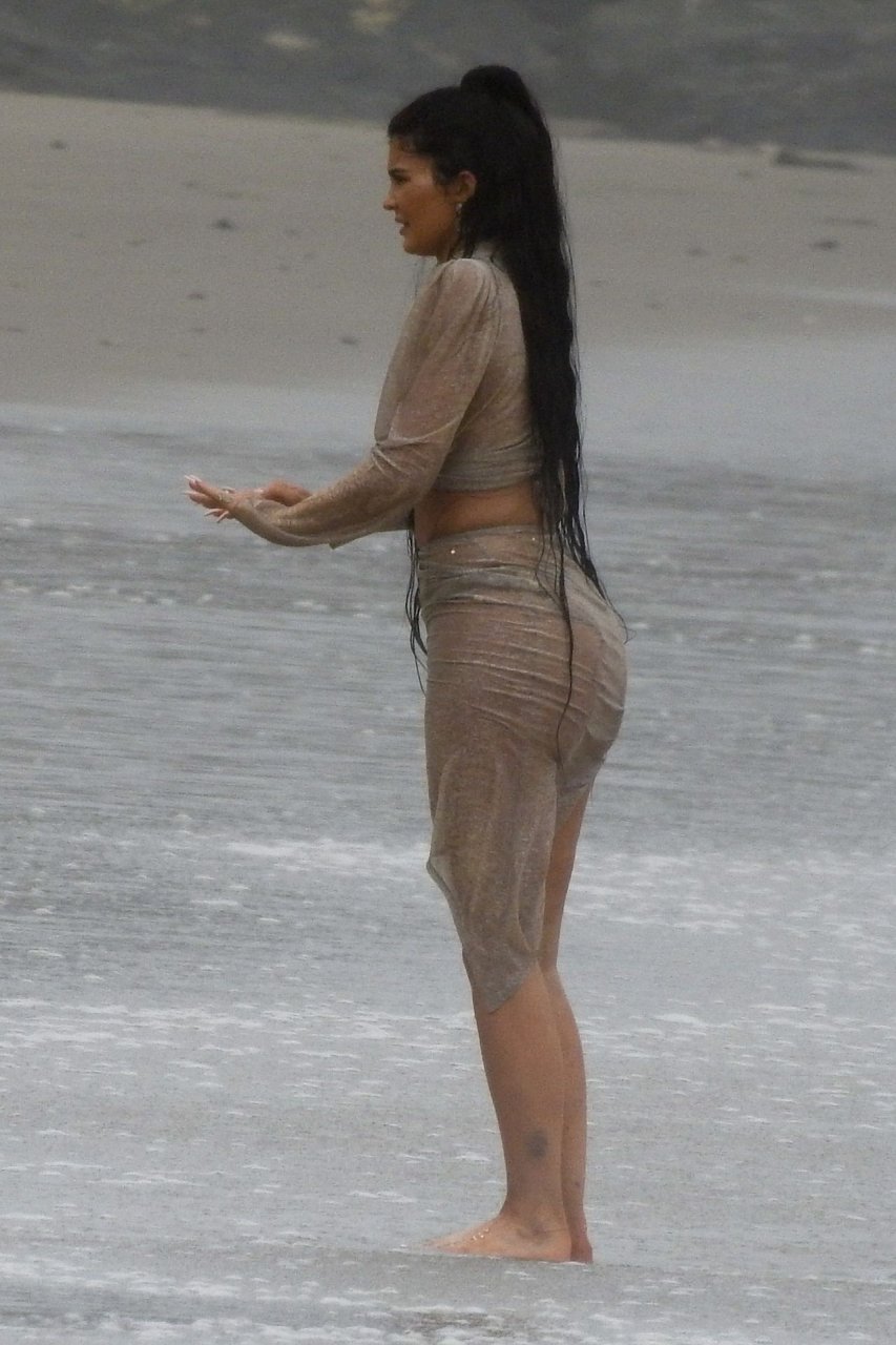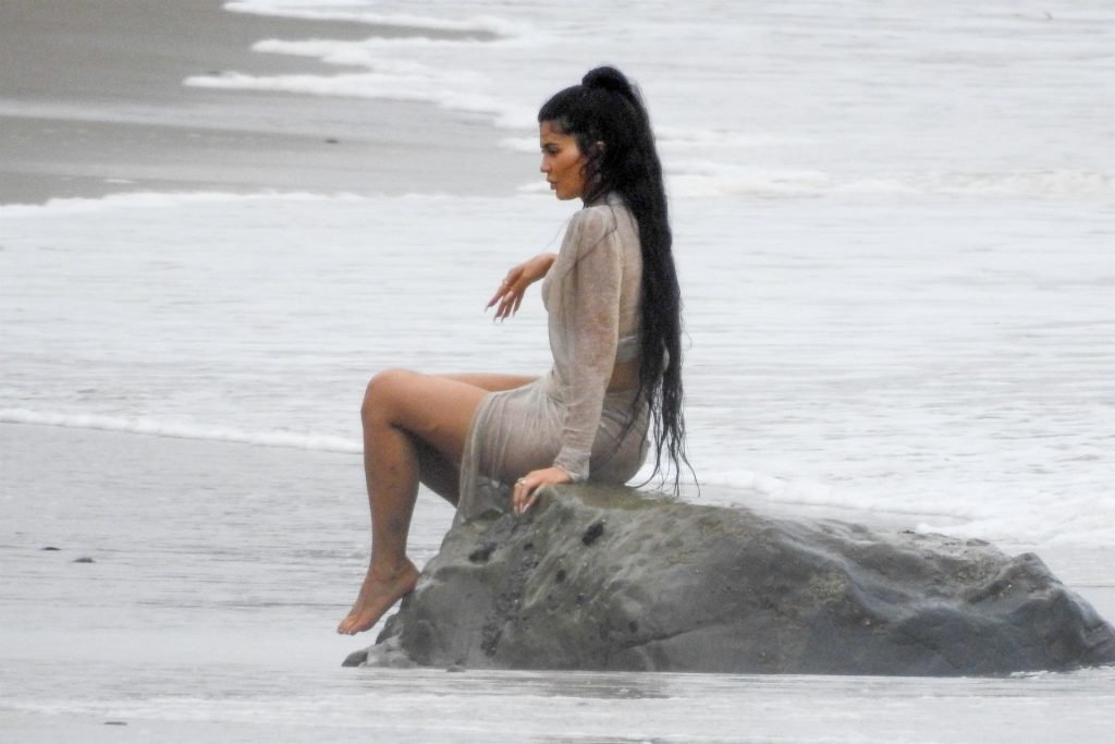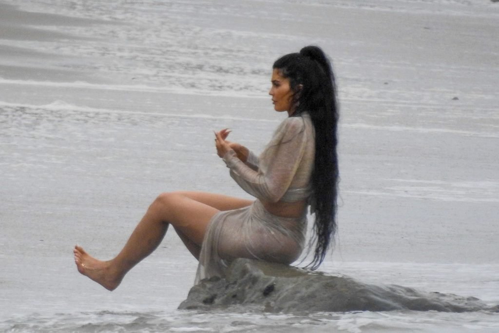 Kylie Jenner arrasou com transparências e lantejoulas durante um ensaio fotográfico muito sexy em Malibu, 04/06/2019. A estrela da realidade exibiu suas curvas deslumbrantes enquanto posava nas pedras usando uma tanga e uma saia transparente com um top leve que mostrava seu abdômen definido.