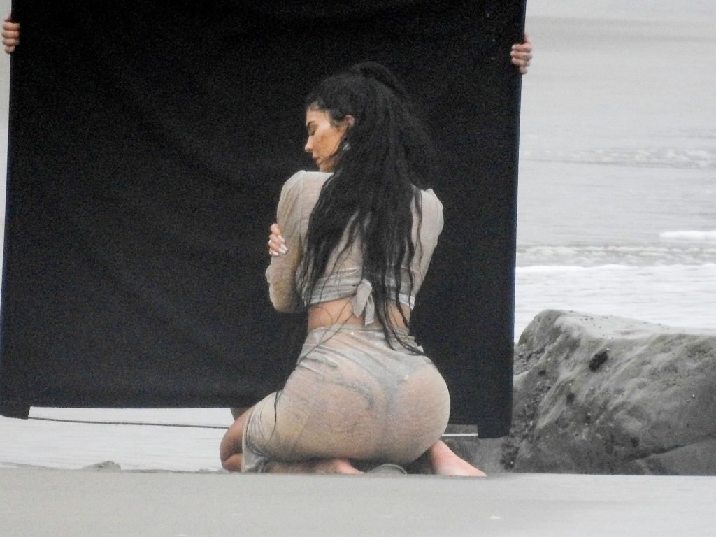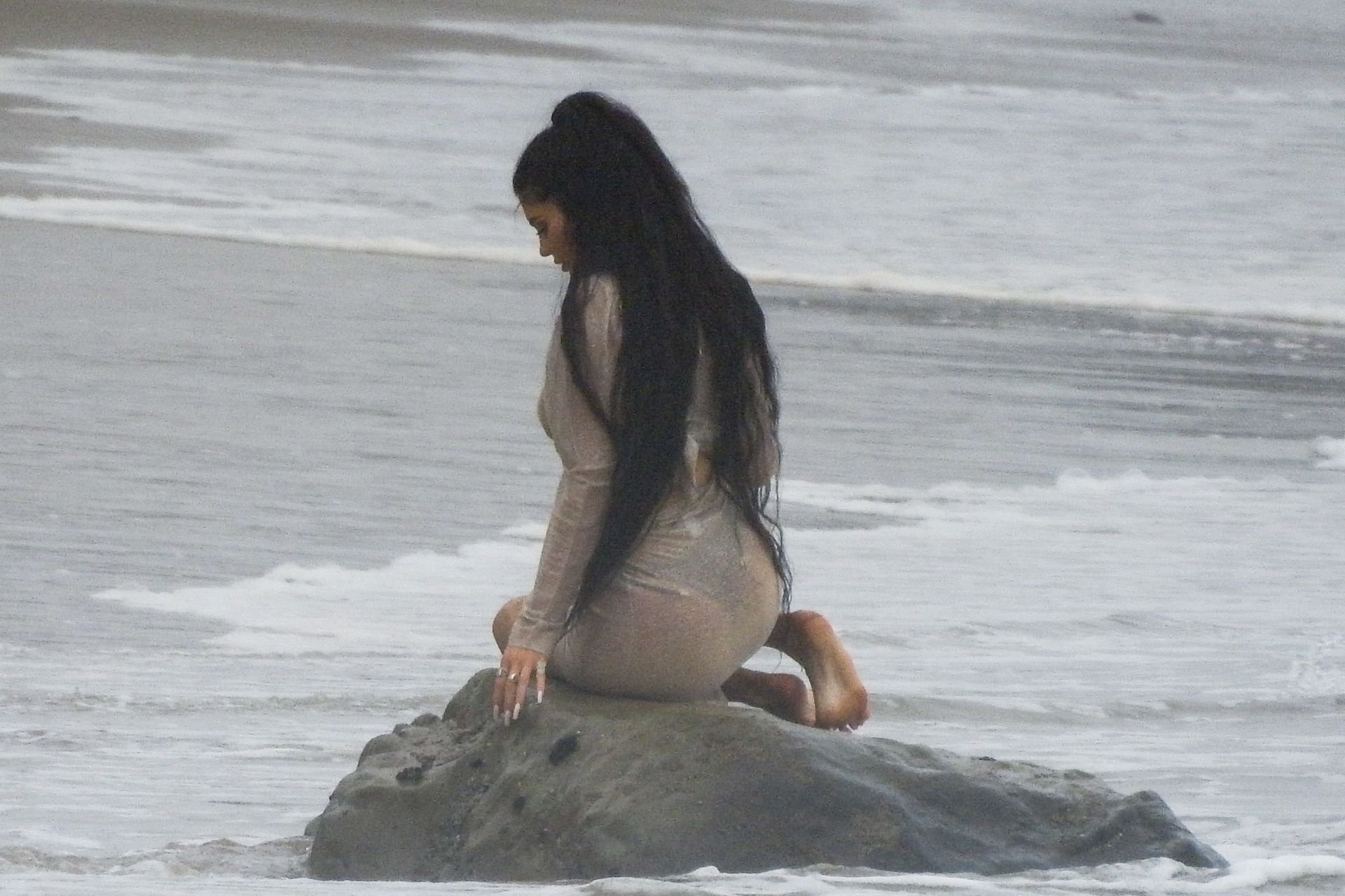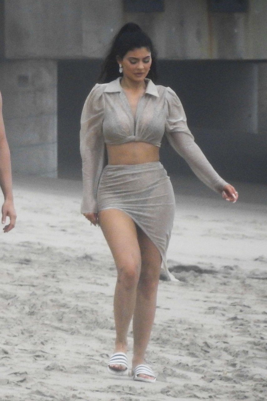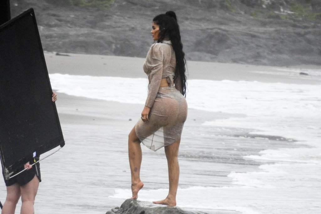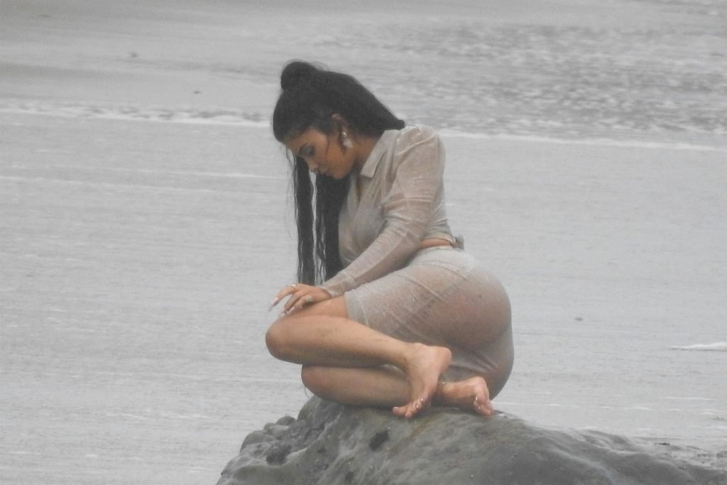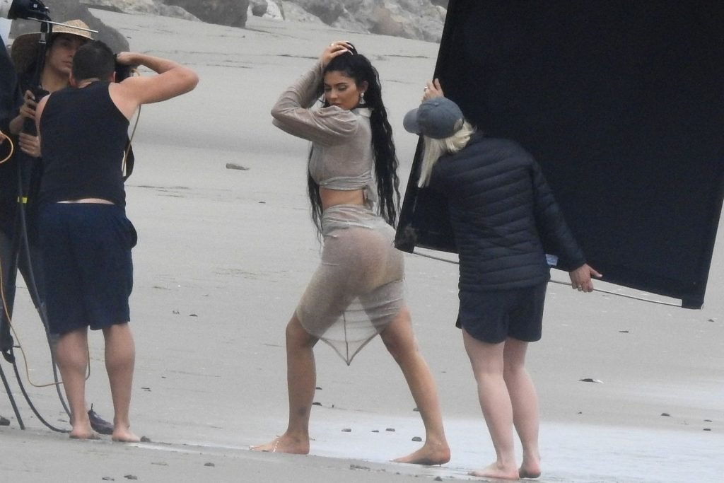 Kylie Jenner arrasou com transparências e lantejoulas durante um ensaio fotográfico muito sexy em Malibu, 04/06/2019. A estrela da realidade exibiu suas curvas deslumbrantes enquanto posava nas pedras usando uma tanga e uma saia transparente com um top leve que mostrava seu abdômen definido.
