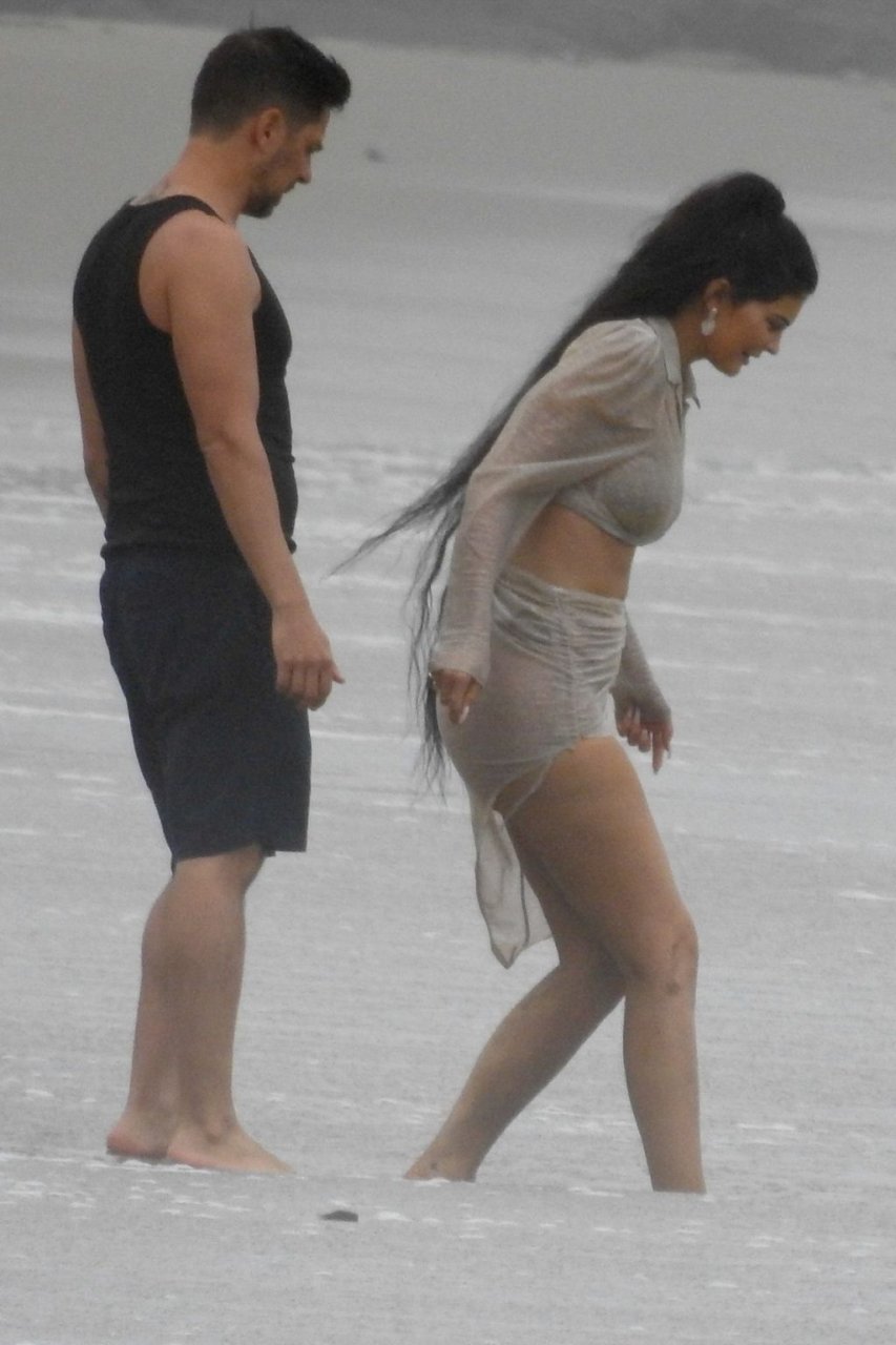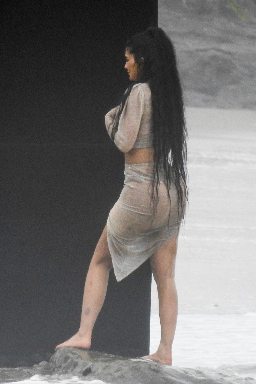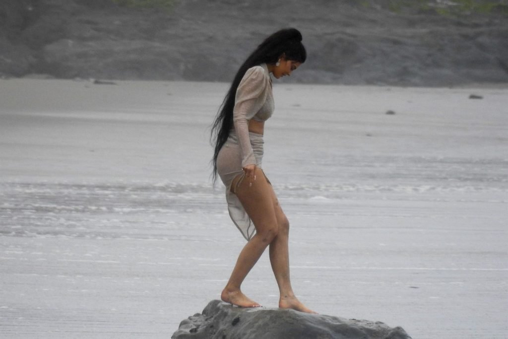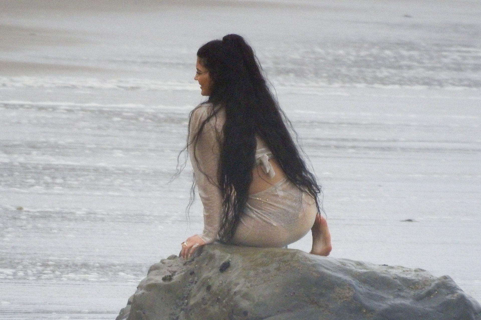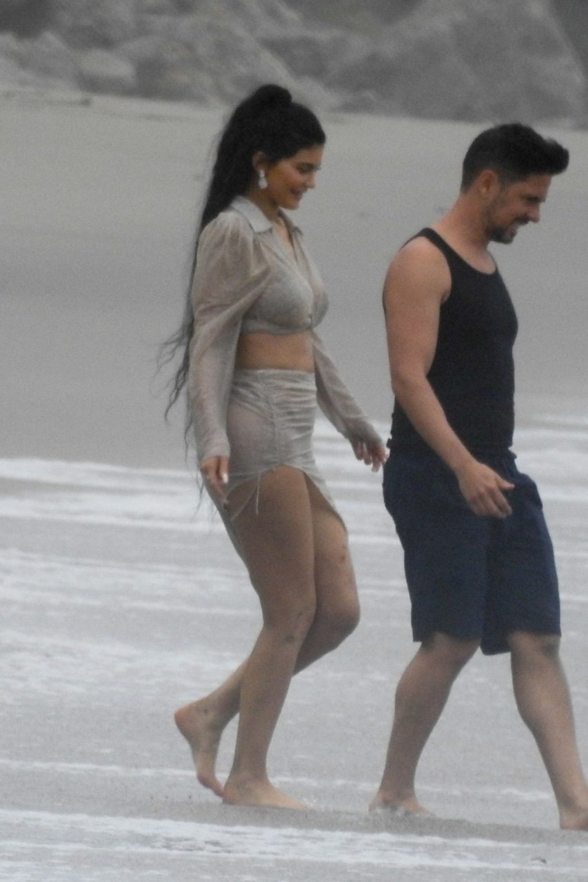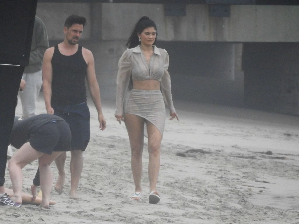 Kylie Jenner arrasou com transparências e lantejoulas durante um ensaio fotográfico muito sexy em Malibu, 04/06/2019. A estrela da realidade exibiu suas curvas deslumbrantes enquanto posava nas pedras usando uma tanga e uma saia transparente com um top leve que mostrava seu abdômen definido.