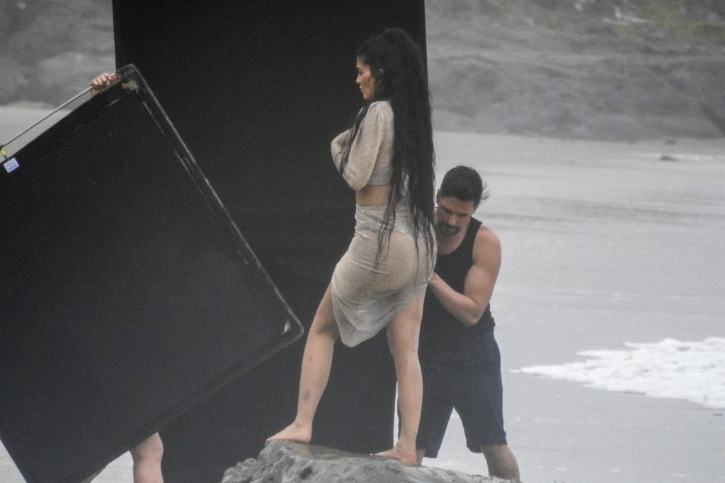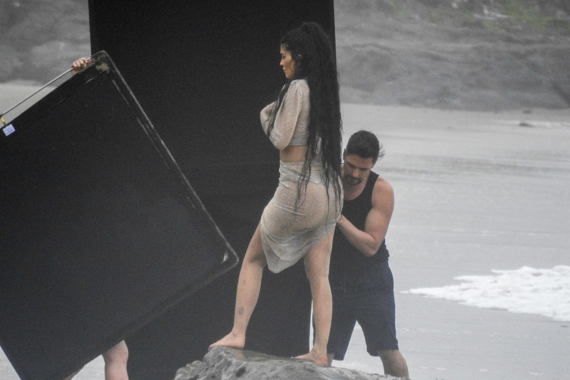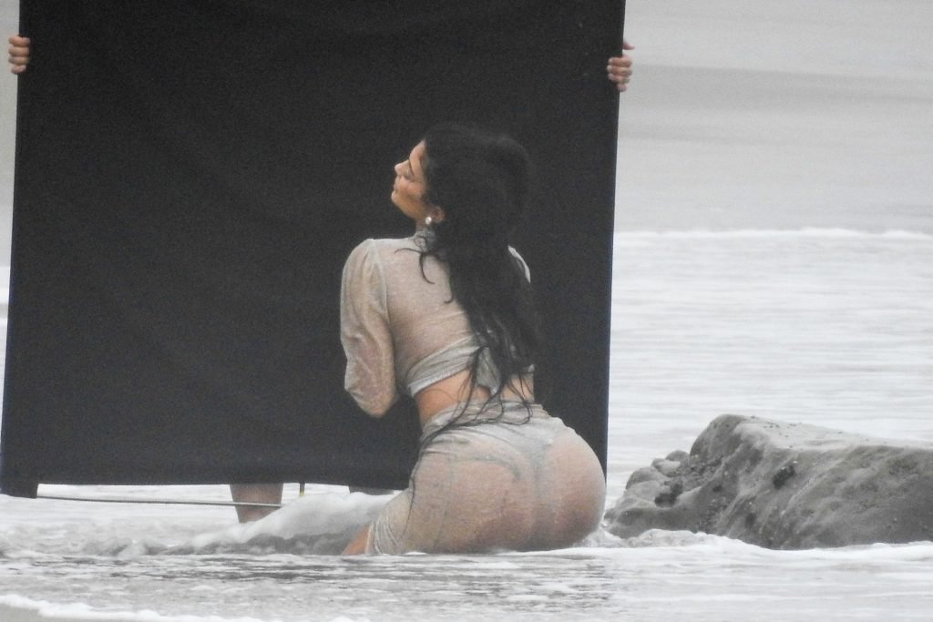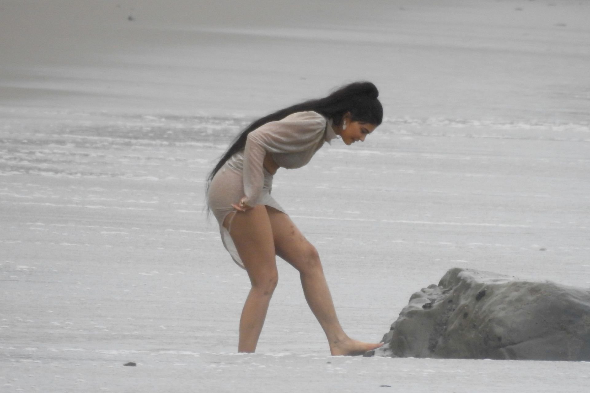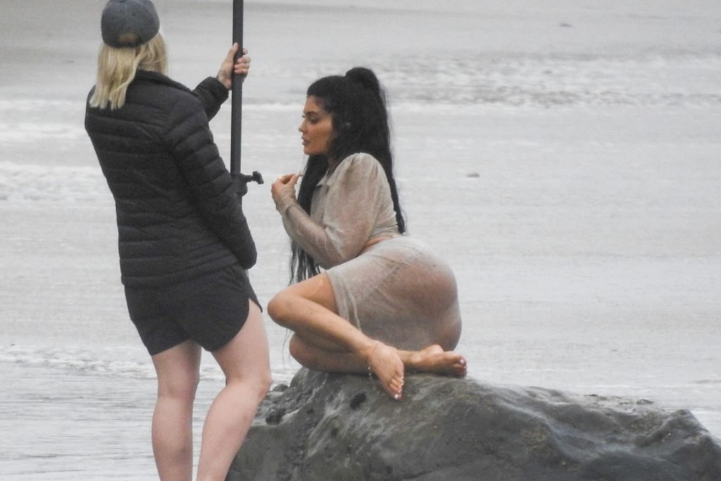 Kylie Jenner arrasou com transparências e lantejoulas durante um ensaio fotográfico muito sexy em Malibu, 04/06/2019. A estrela da realidade exibiu suas curvas deslumbrantes enquanto posava nas pedras usando uma tanga e uma saia transparente com um top leve que mostrava seu abdômen definido.