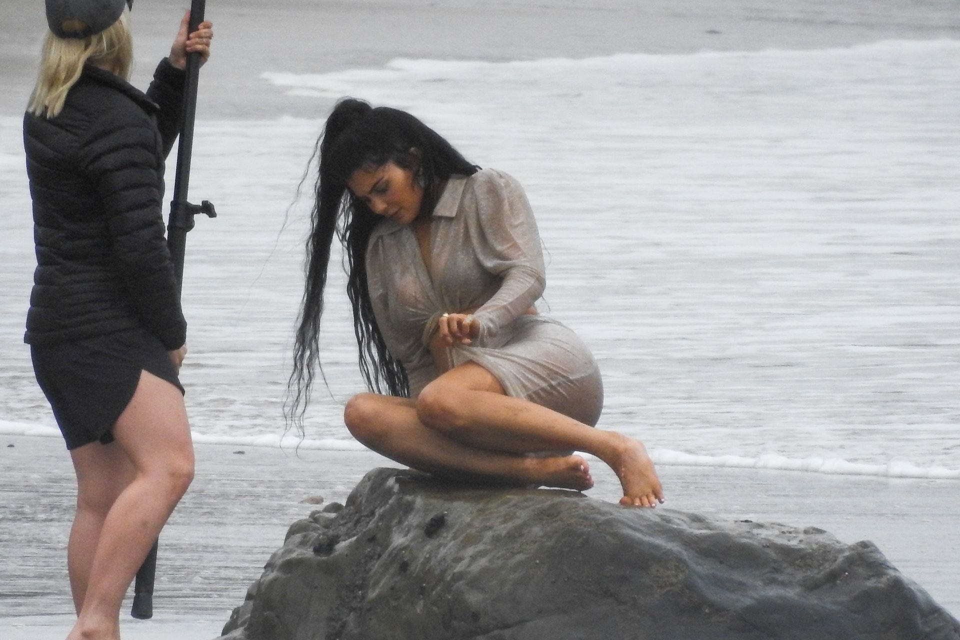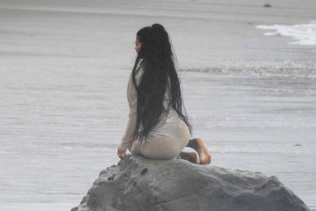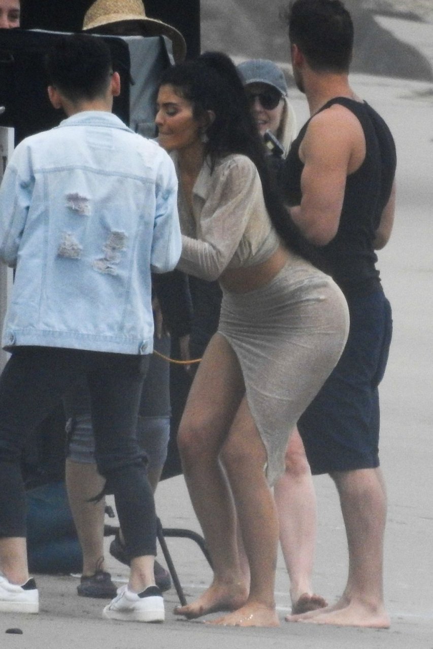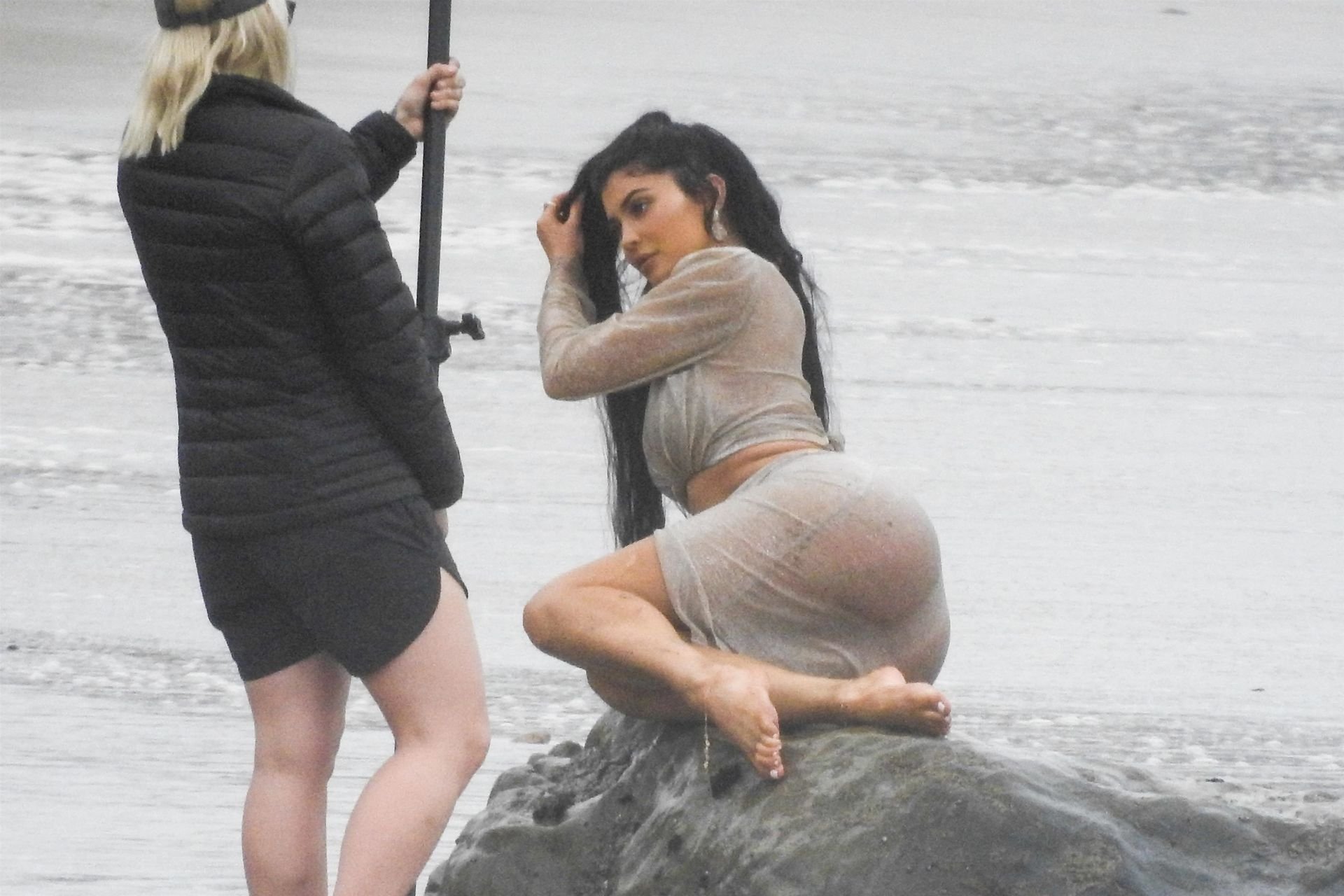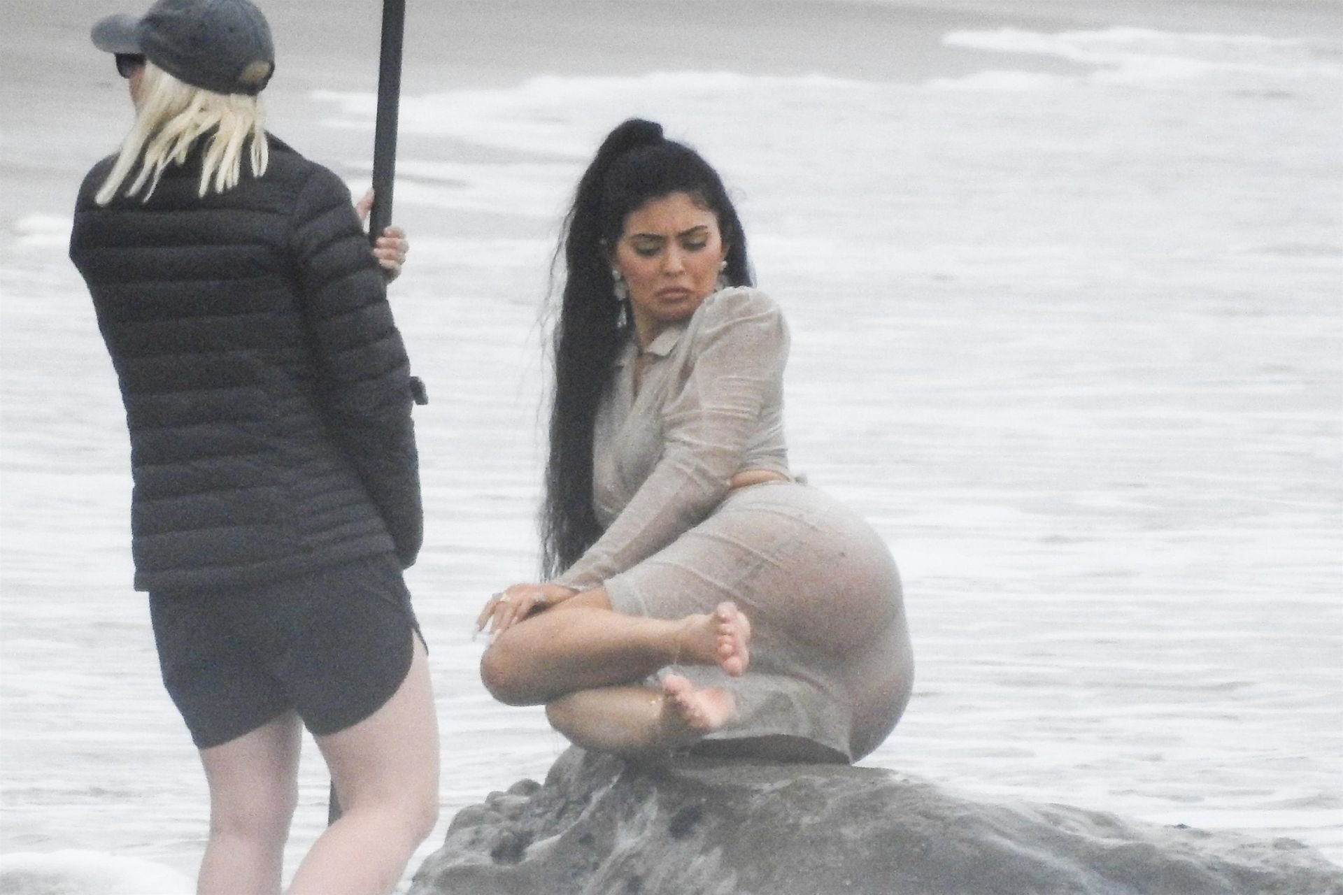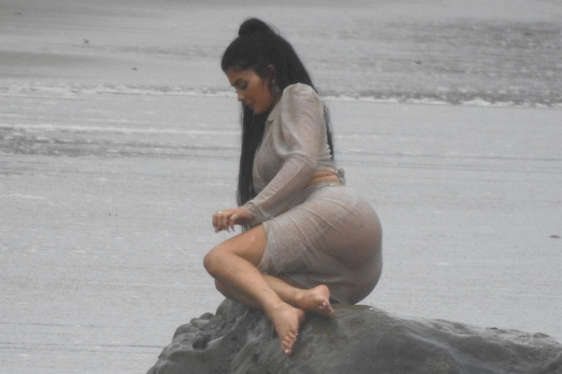 Kylie Jenner arrasou com transparências e lantejoulas durante um ensaio fotográfico muito sexy em Malibu, 04/06/2019. A estrela da realidade exibiu suas curvas deslumbrantes enquanto posava nas pedras usando uma tanga e uma saia transparente com um top leve que mostrava seu abdômen definido.